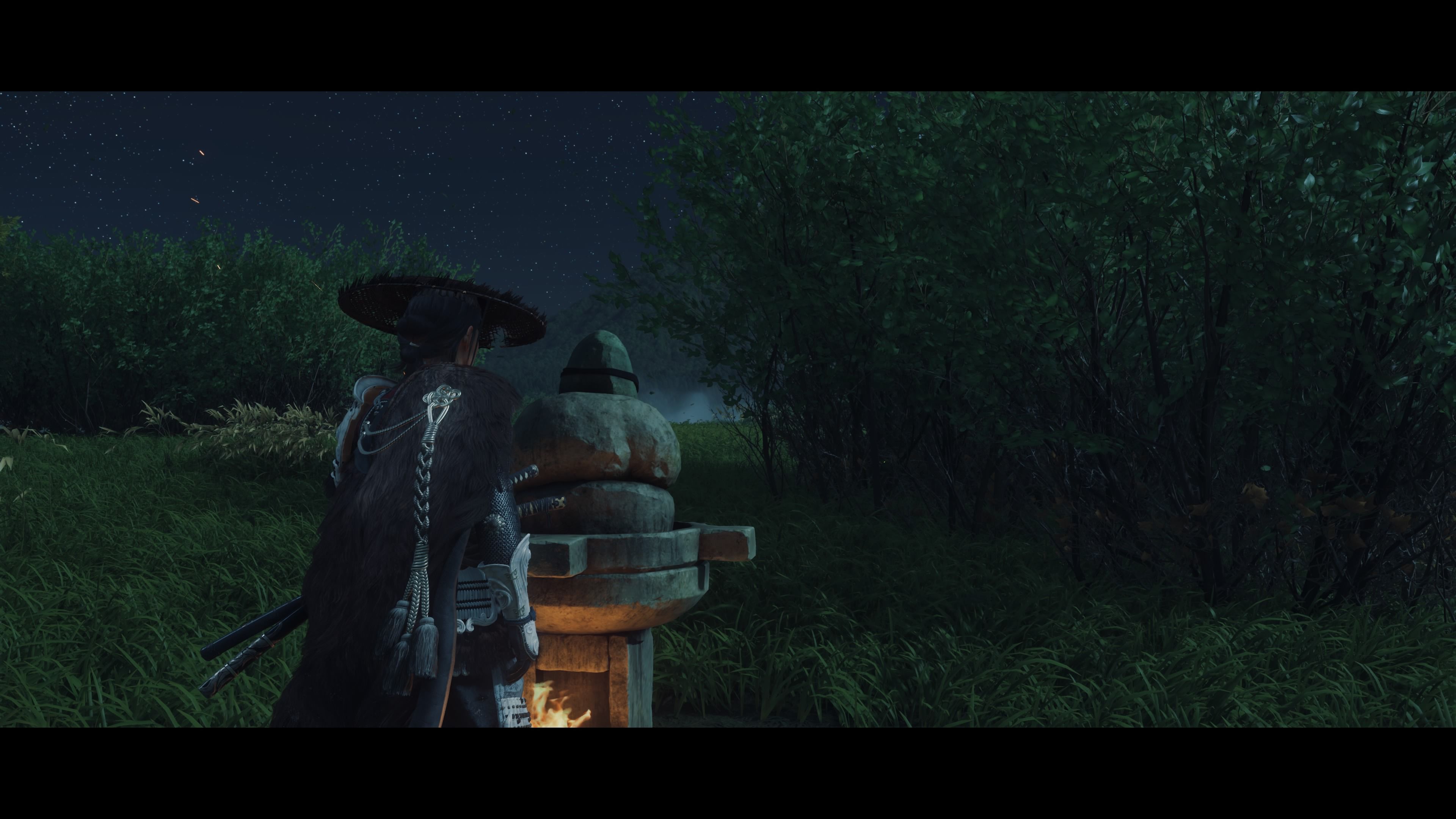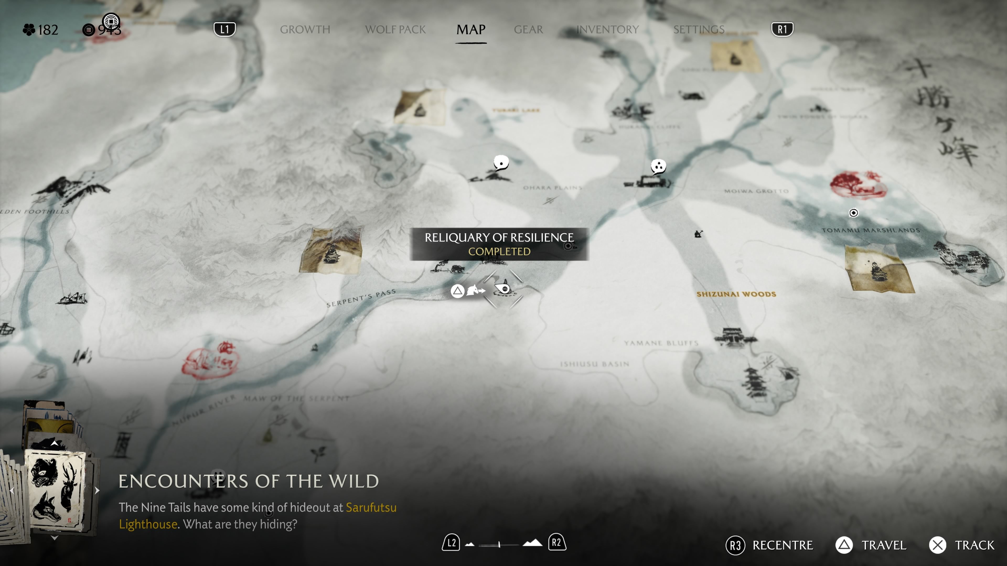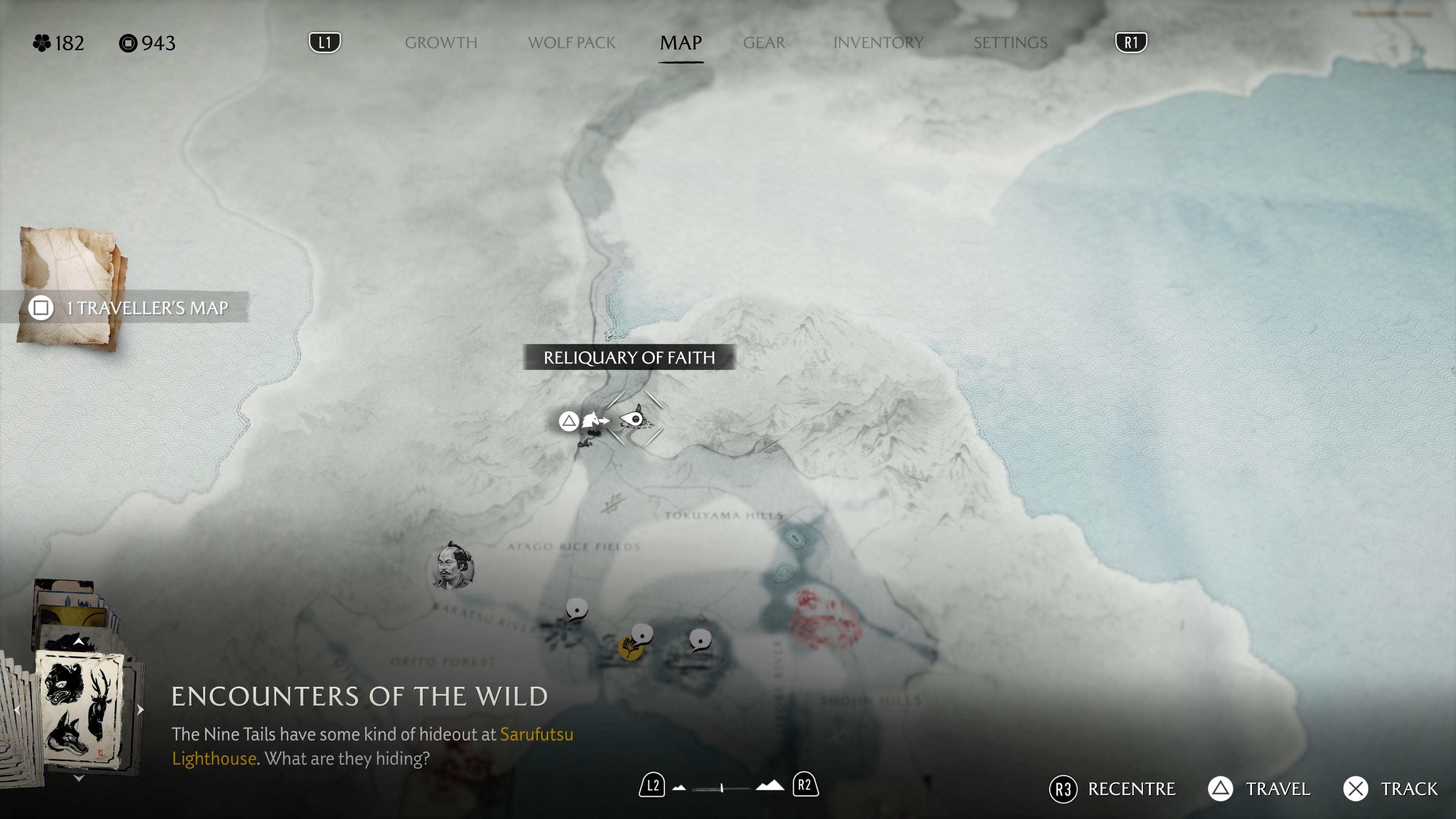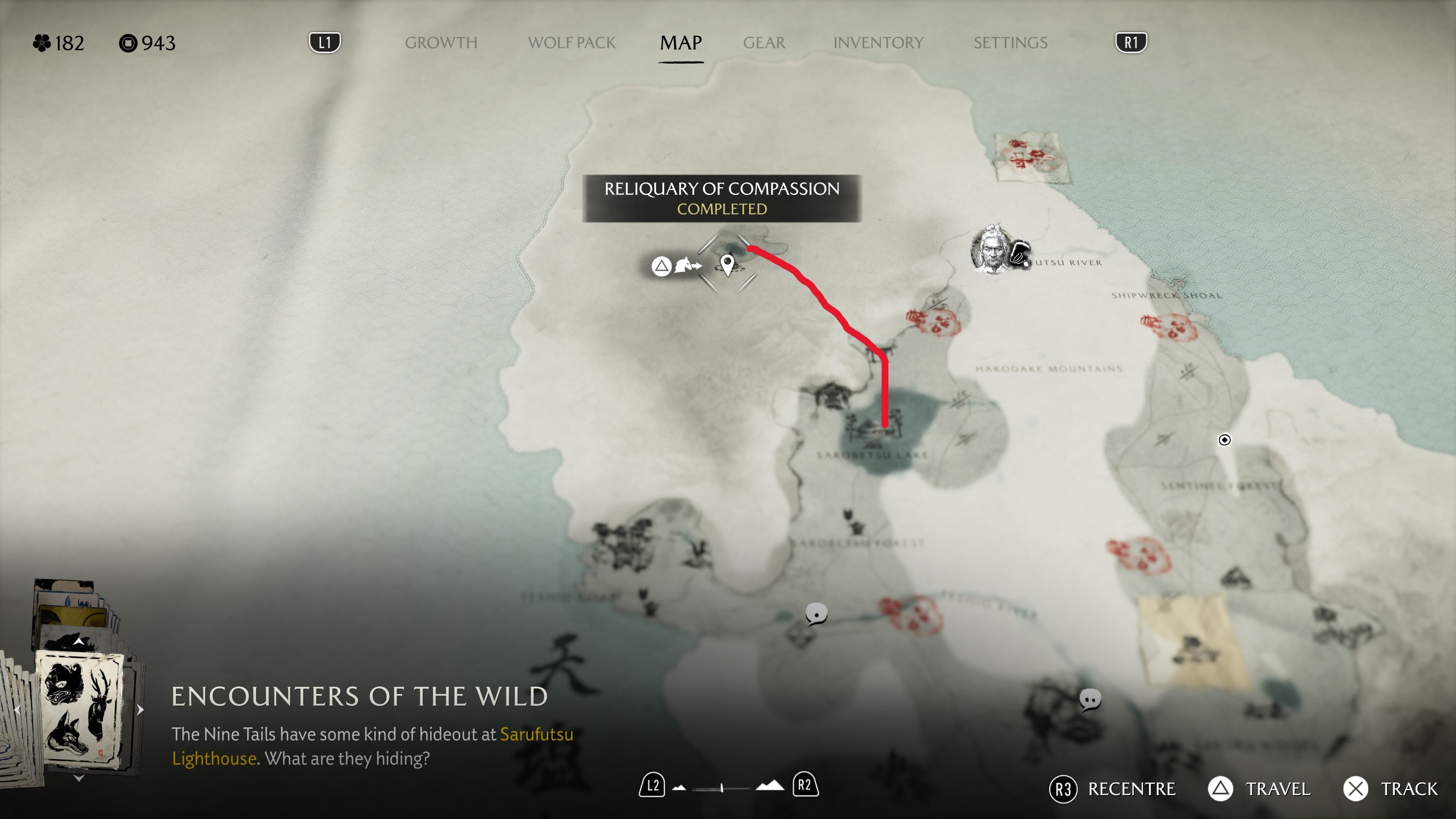 Okay, so I finally found the Reliquary of Courage! It’s tucked away in the western part of the Yotei Grasslands. Basically, you need to follow the Sarubetsu River upstream. Keep going until it splits – then take the left fork. You’ll eventually reach this open field, completely walled in by these huge bushes. The only landmark you can see peeking over them is Mount Yotei. And right in the middle of that little garden area is the Reliquary itself. When I checked out the altar, this riddle popped up: