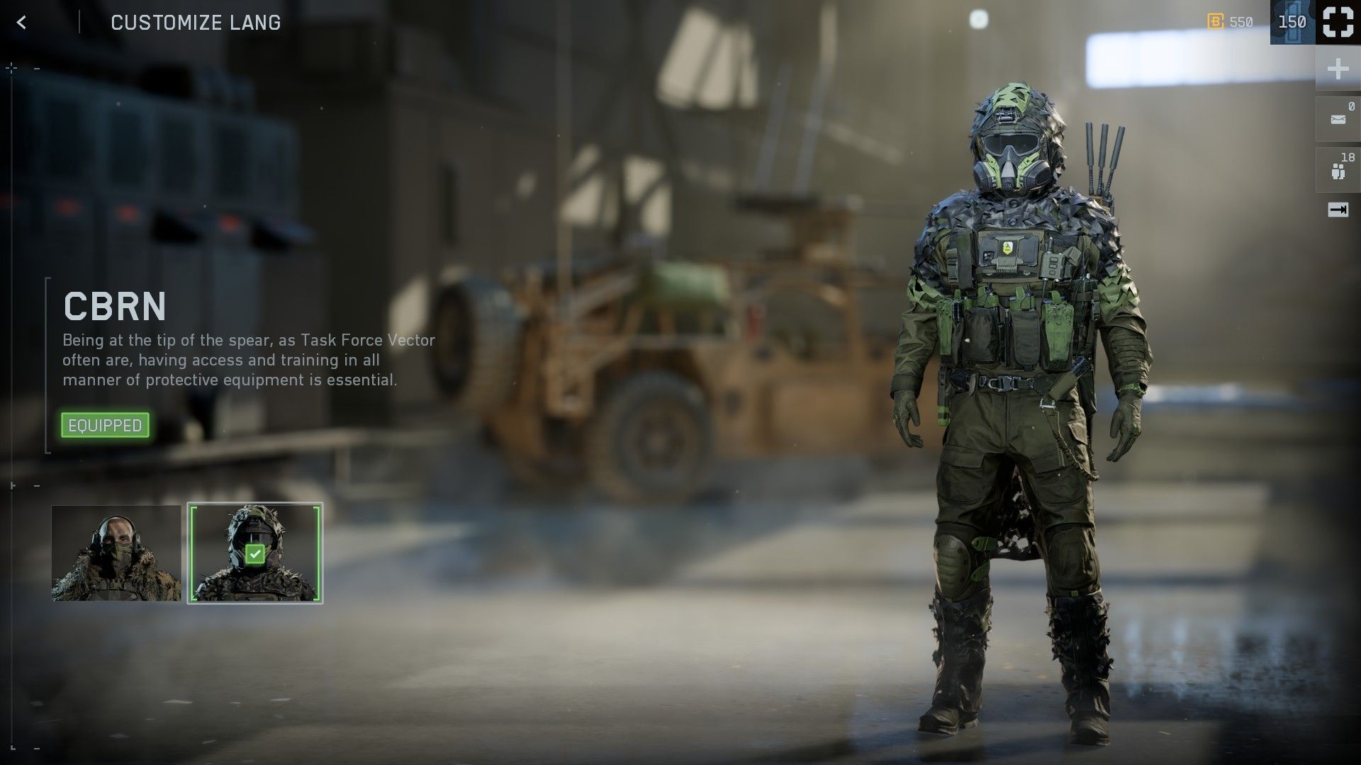 Operator Lang is now available, including a new CBRN skin for him. The Desert Locusts Engineer for NATO also receives a Hazmat skin.