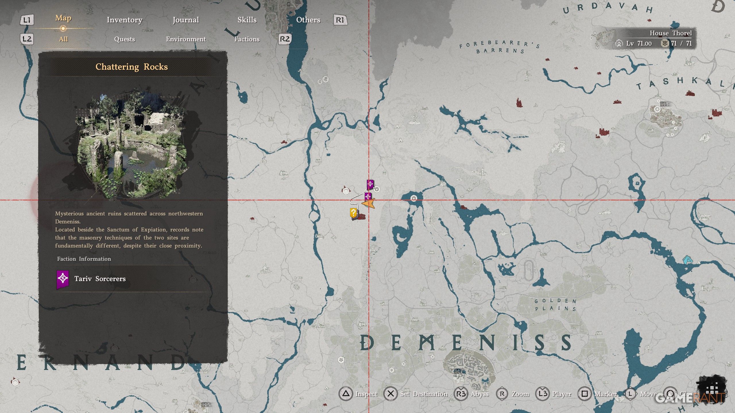 - For now, head to Chattering Rocks (on the map above), which is far north of the “D” in “Demeniss”.