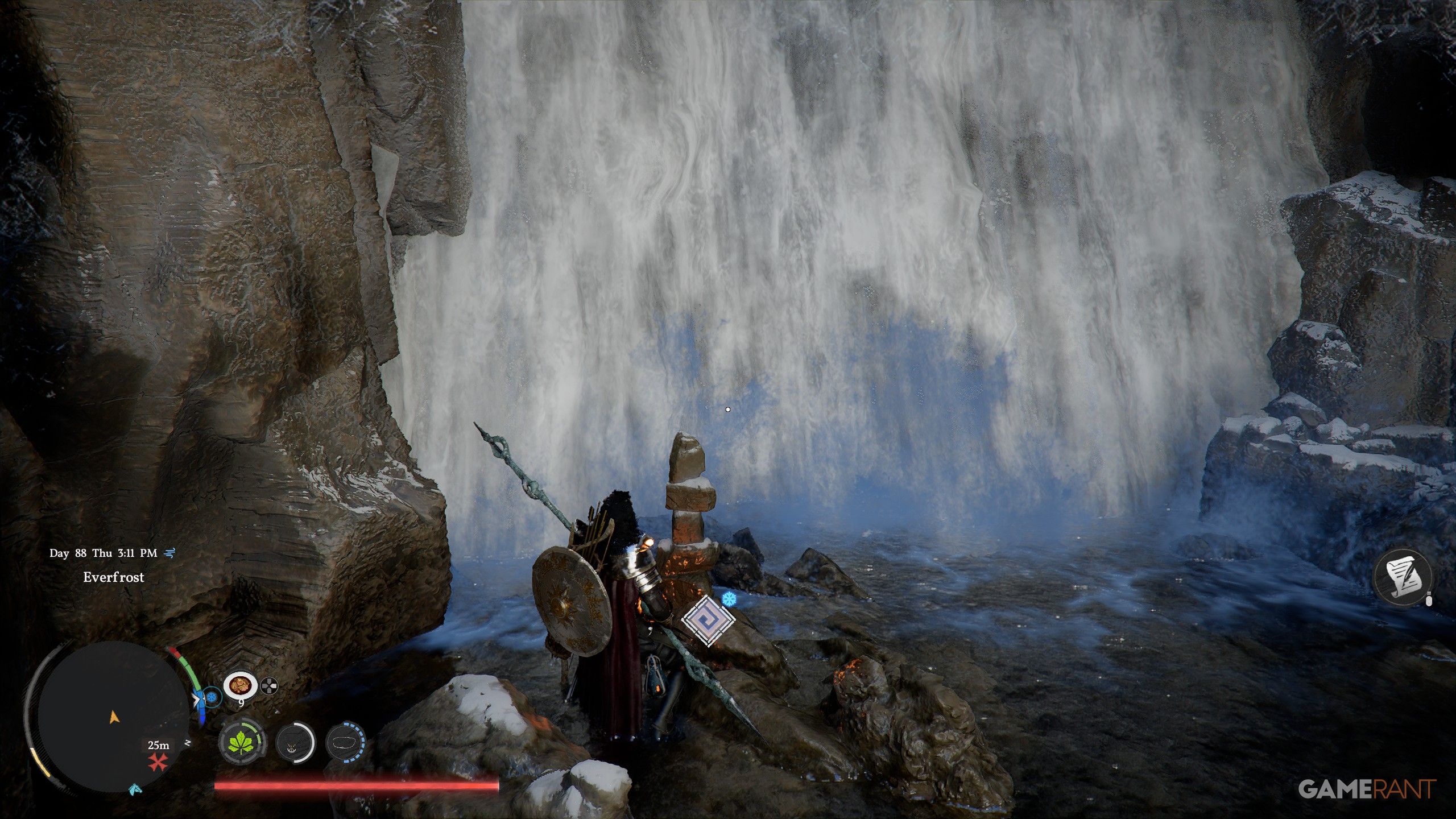 - When at the location marked on the map above, you’ll find a waterfall.