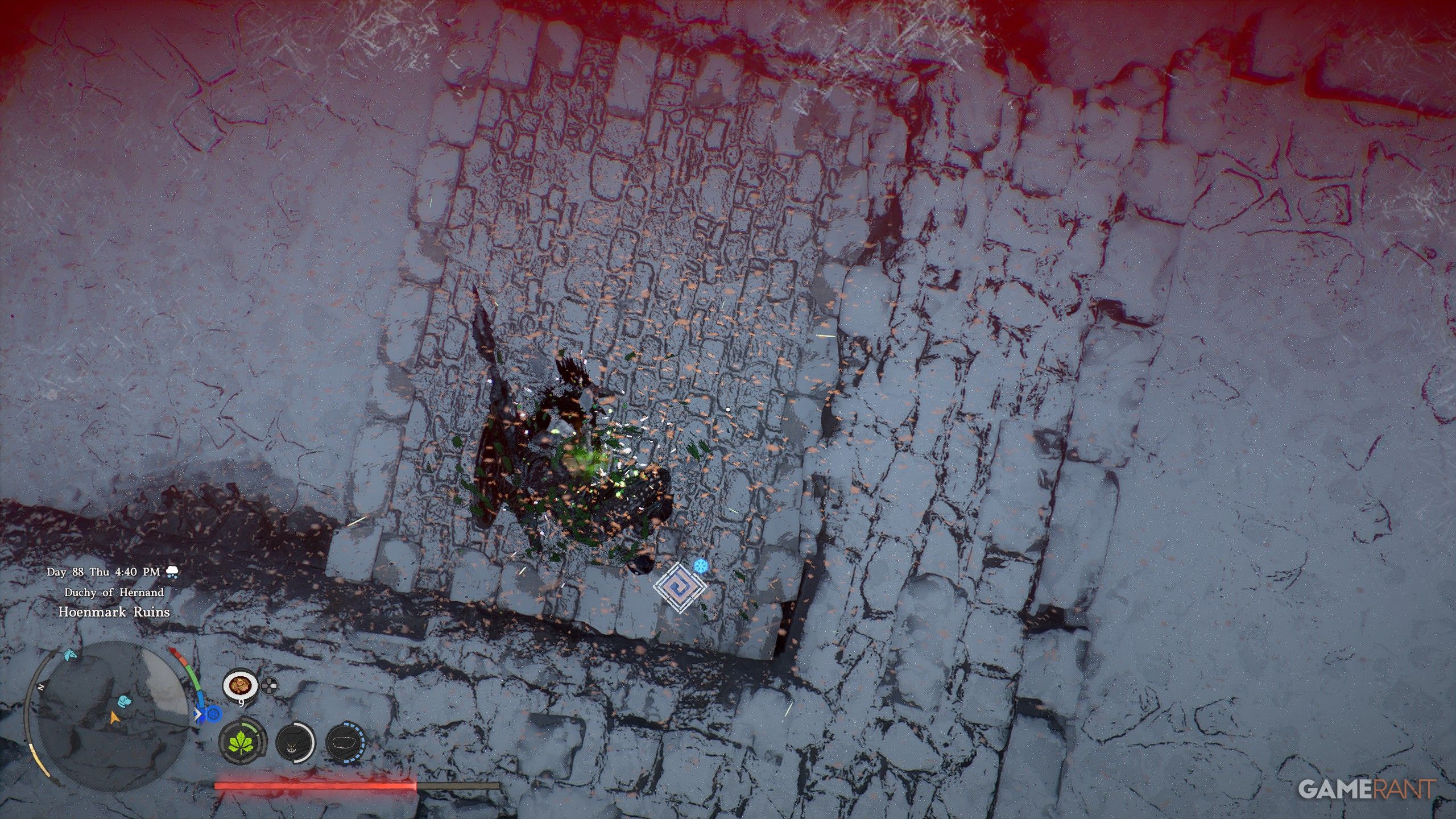 - The Hoenmark Ruins have a blizzard, so you’ll take damage, so make sure you have plenty of food or Ice-Resistant armor.