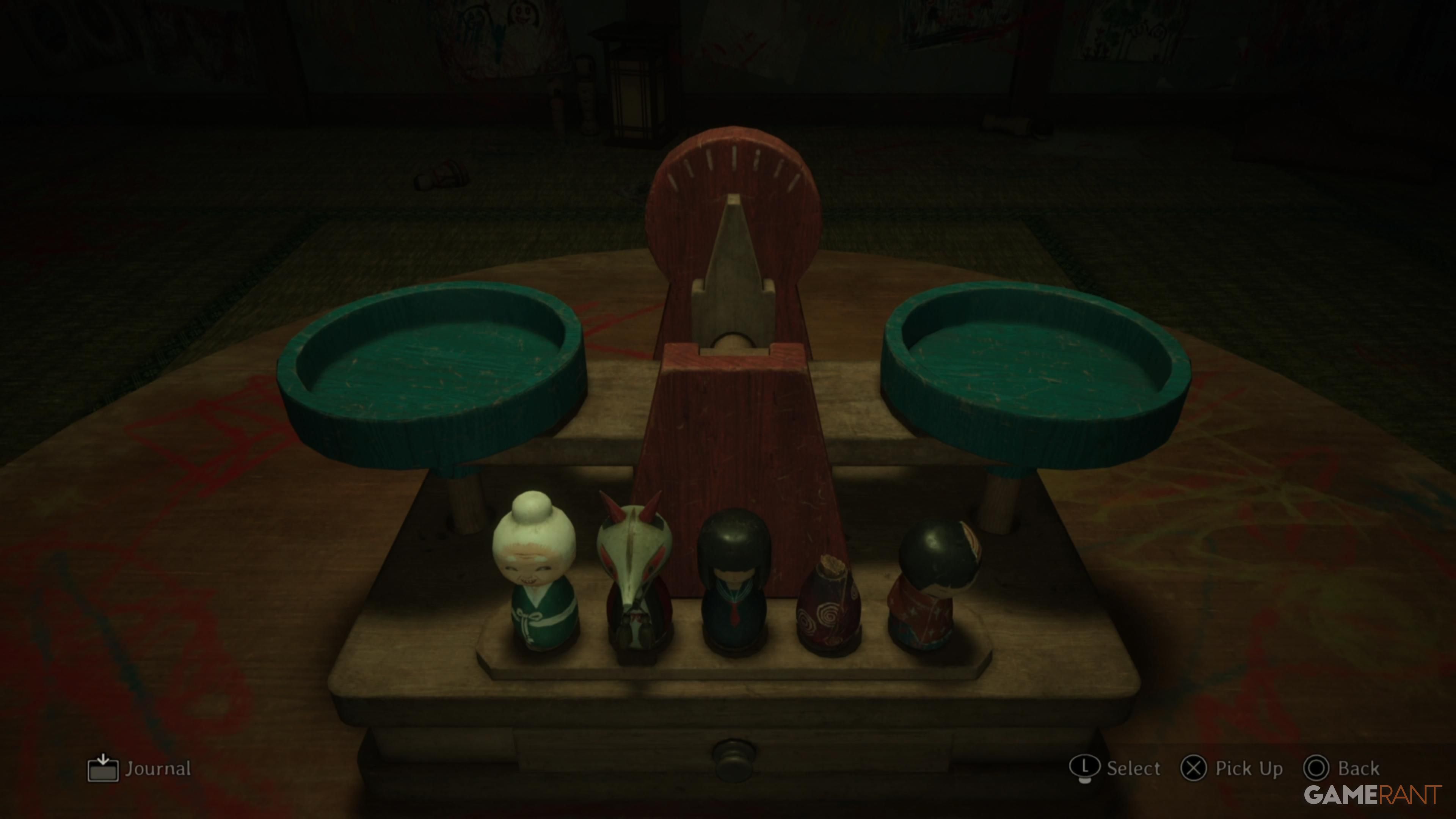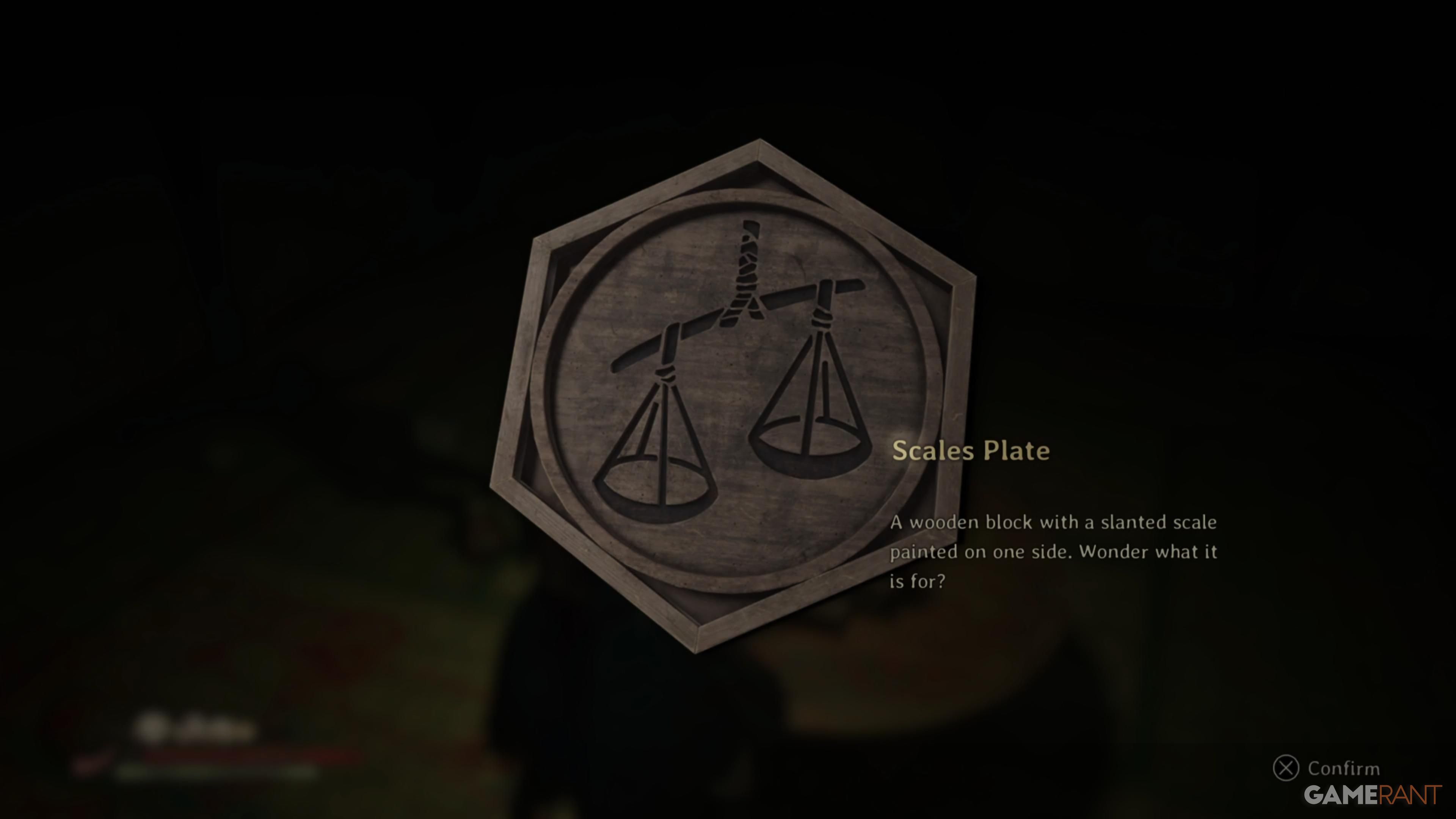 The Scales puzzle is located at the end of the hallway on the left. It involves balancing wooden dolls on a scale. To get the Scales Plate, place the doll without a head on the left side of the scale and all the other dolls on the right side.