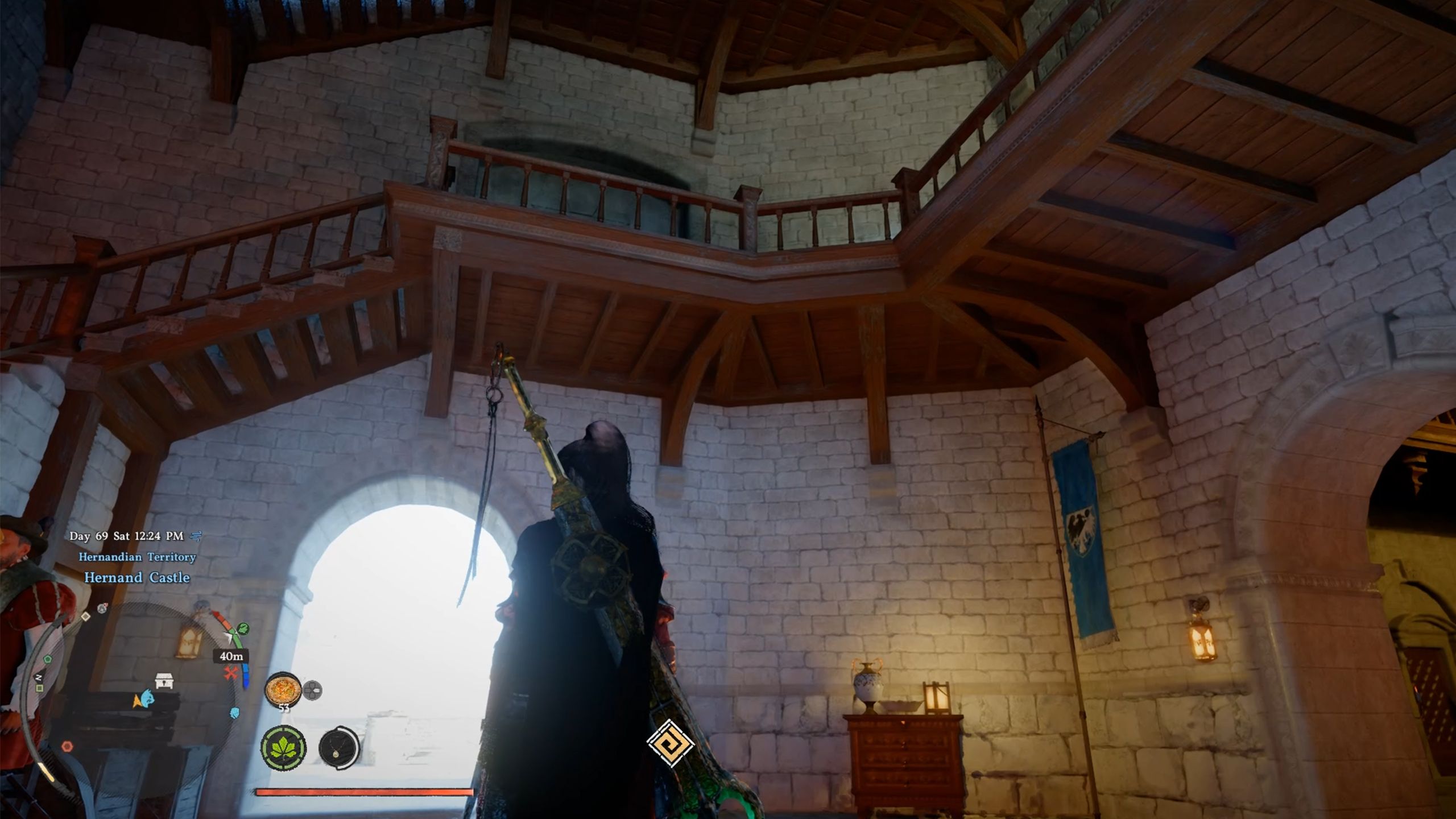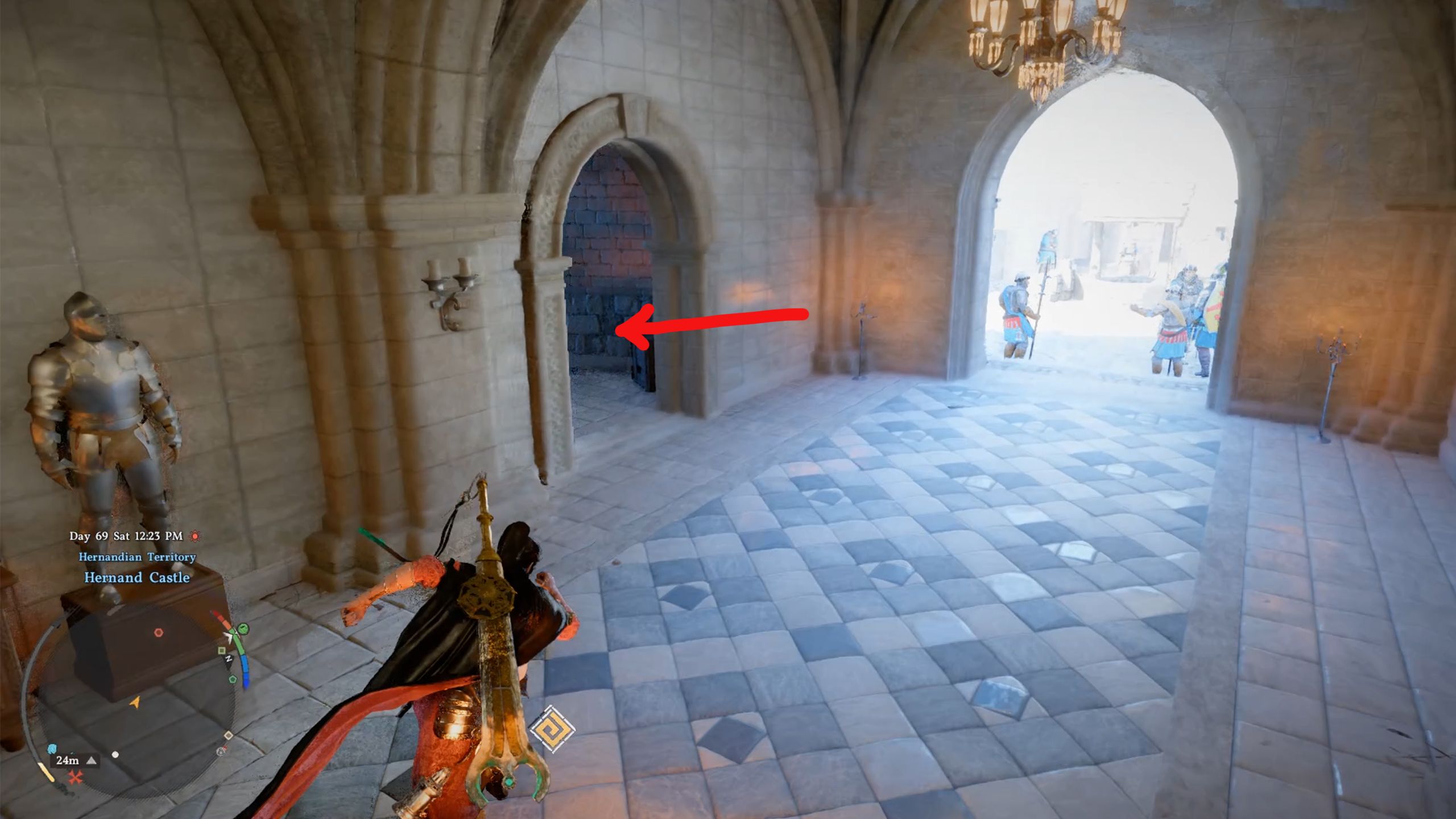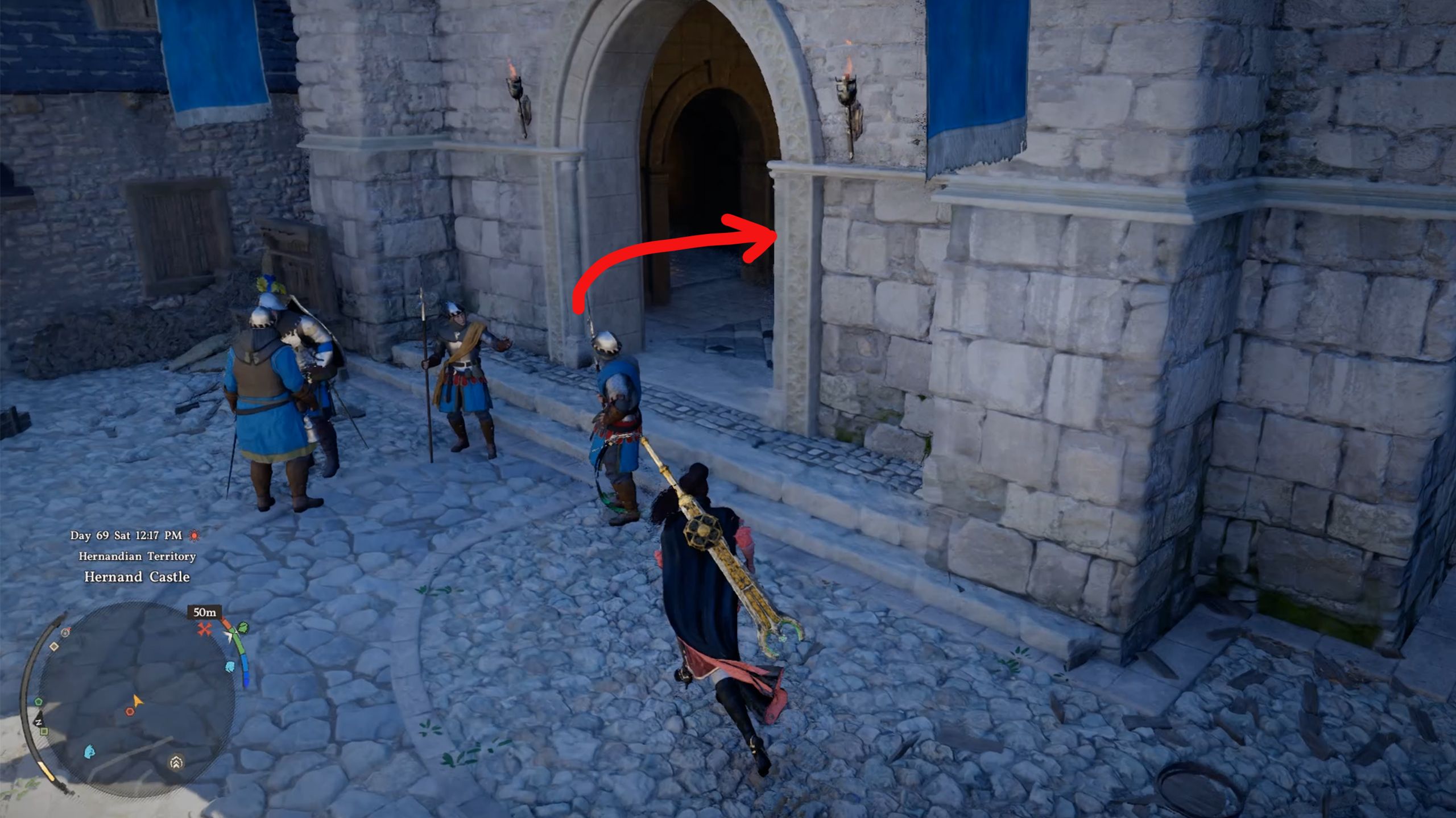 Head to Hernand Castle and enter through the archway on the right. Climb the stairs to get to the tower’s ground floor. Then, go up the wooden stairs to the top and open the door – you’ll need a regular key to get in, so make sure you have one.
