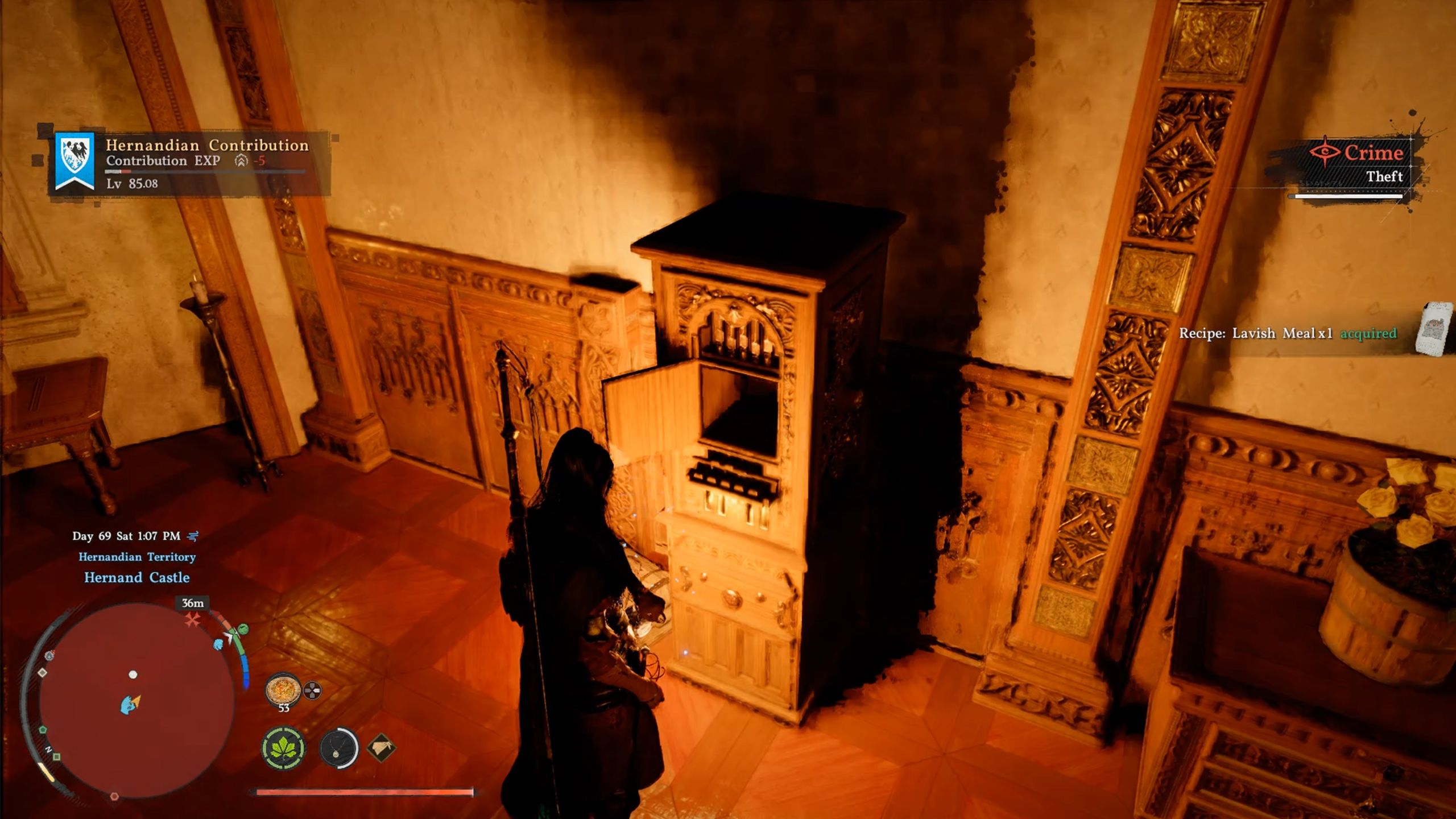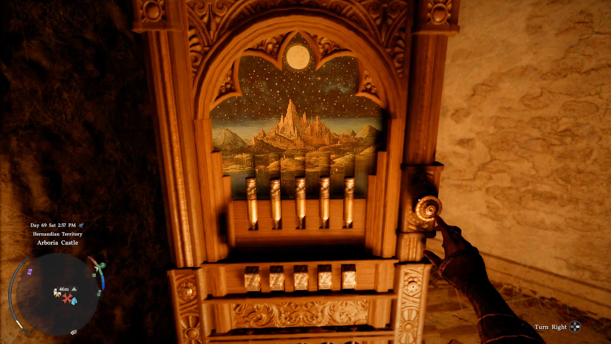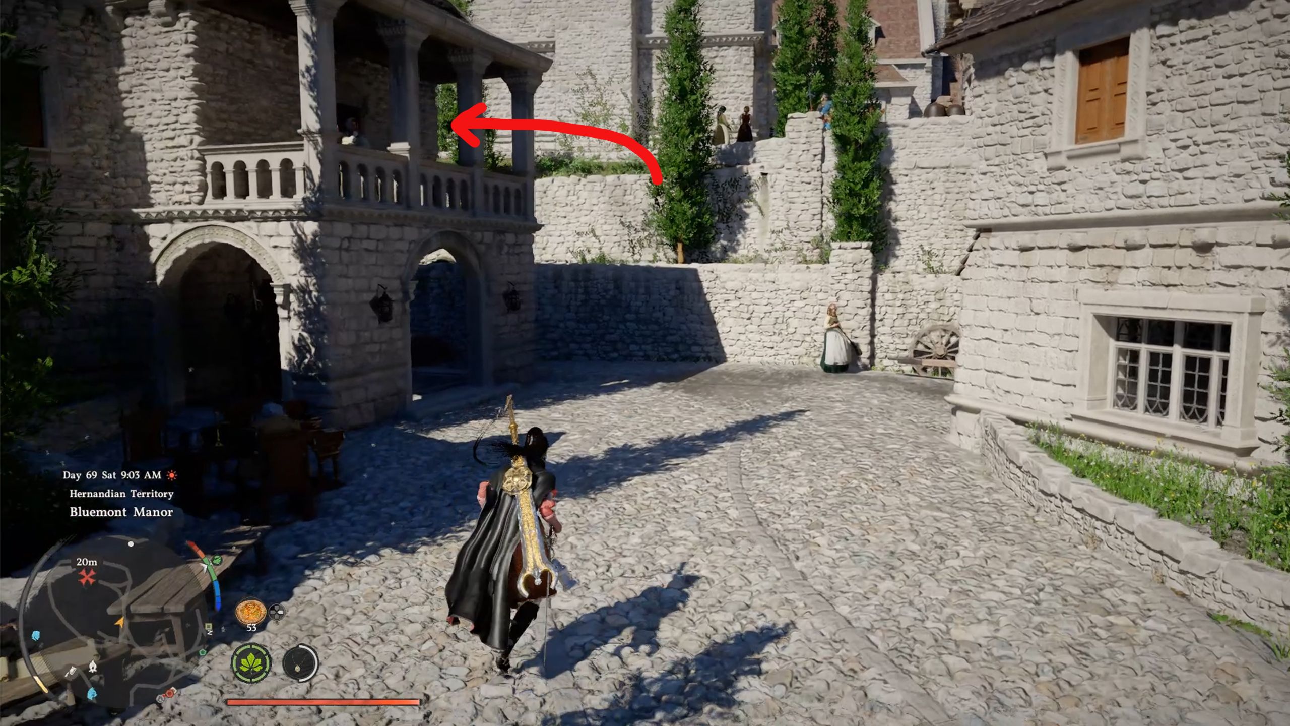 Head to Hernand Castle and enter through the archway on the right. Climb the stairs to get to the tower’s ground floor. Then, go up the wooden stairs to the top and open the door – you’ll need a regular key to get in, so make sure you have one.