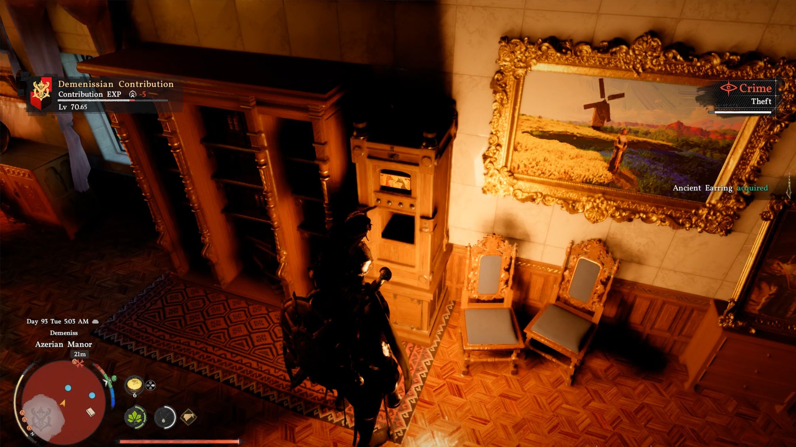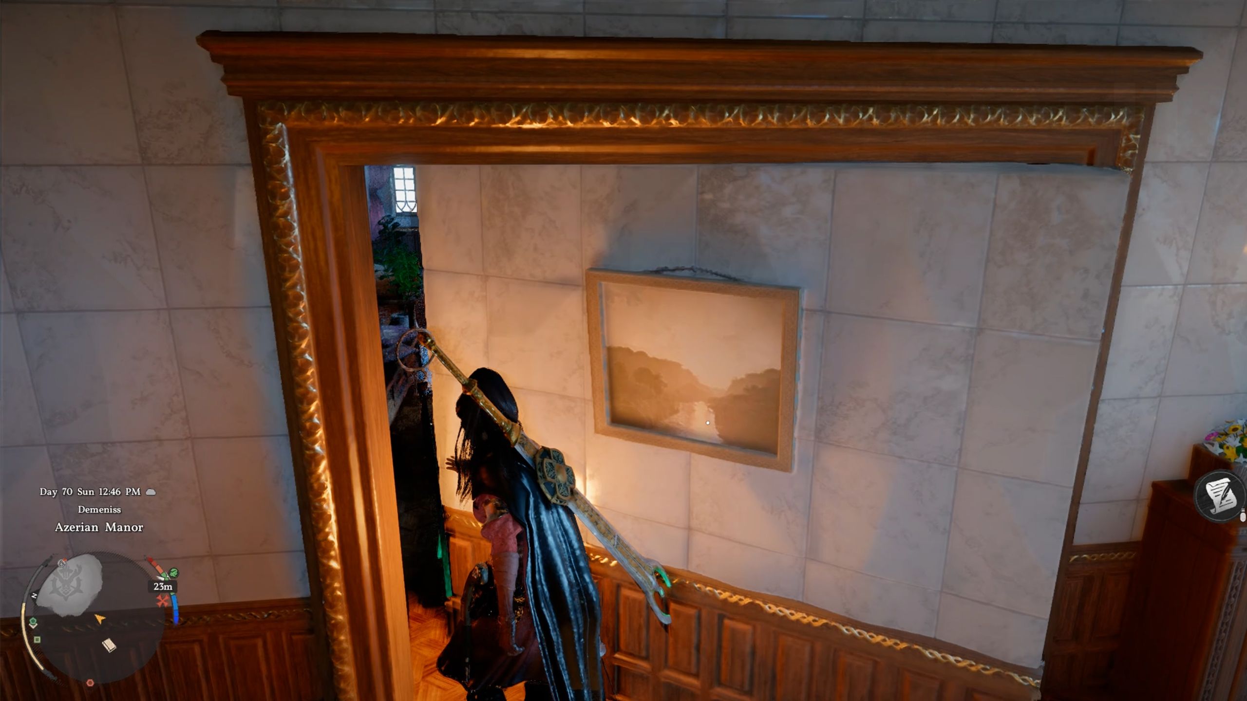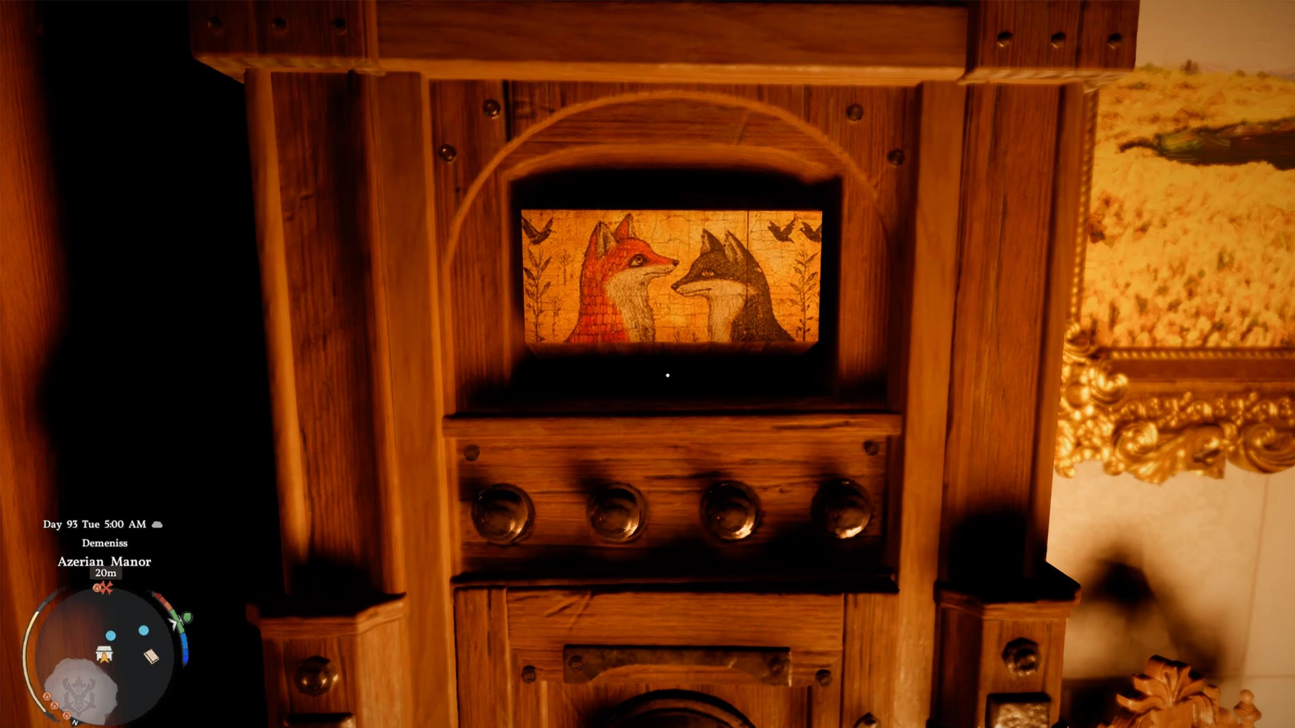 The Azerian Manor is located very near Sungrove Manor, underneath the ‘M’ on the Demeniss map. Once inside, go to the second floor and look for a hidden room behind a fake wall. You’ll find a strongbox puzzle there. To solve it, you need to press the buttons in the correct sequence to rotate the pieces and complete the image.