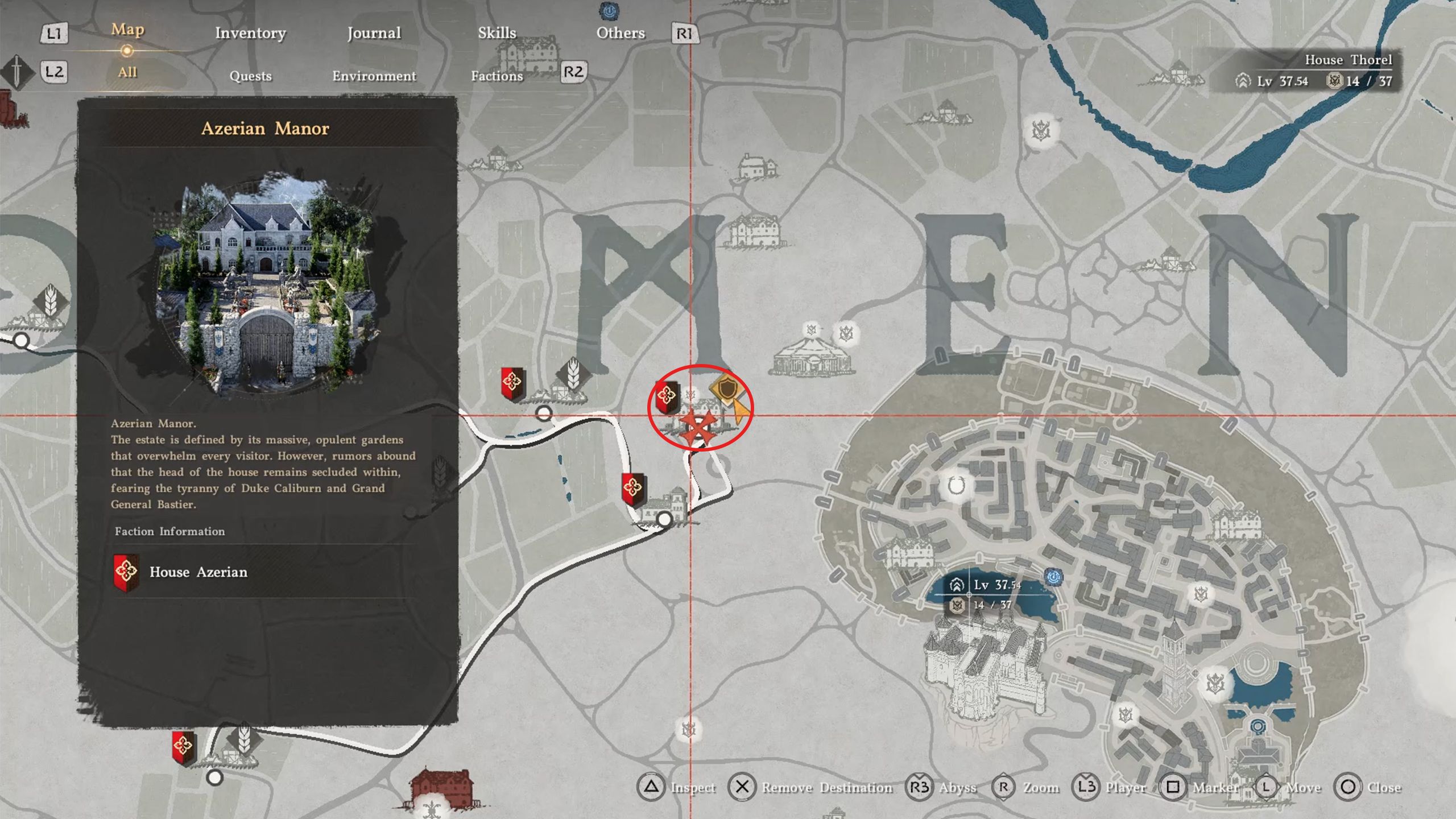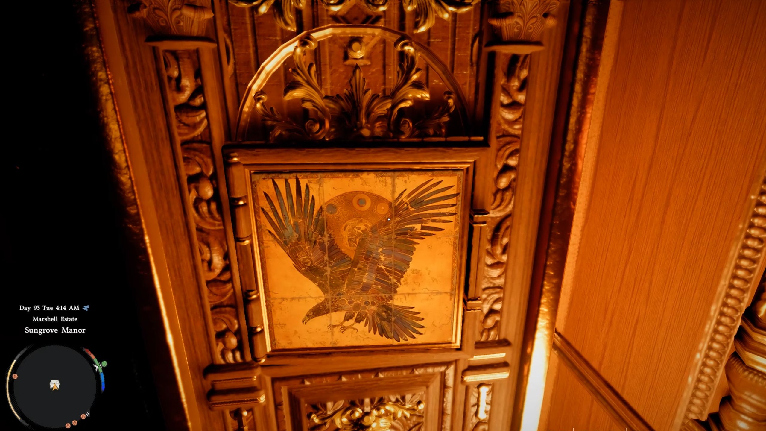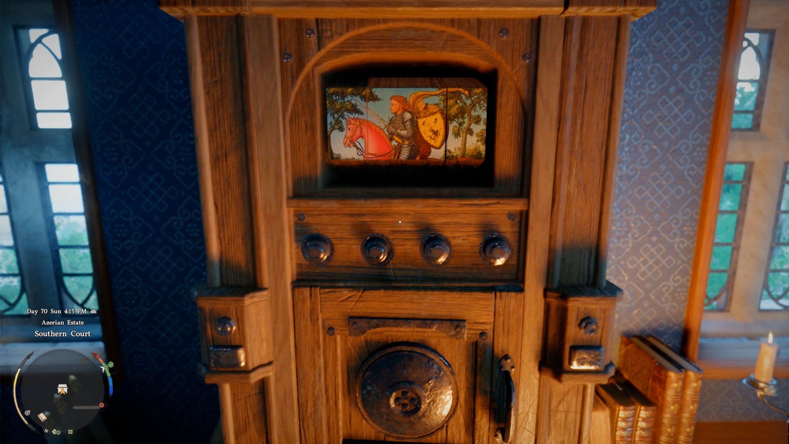The Azerian Manor is located very near Sungrove Manor, underneath the ‘M’ on the Demeniss map. Once inside, go to the second floor and look for a hidden room behind a fake wall. You’ll find a strongbox puzzle there. To solve it, you need to press the buttons in the correct sequence to rotate the pieces and complete the image.