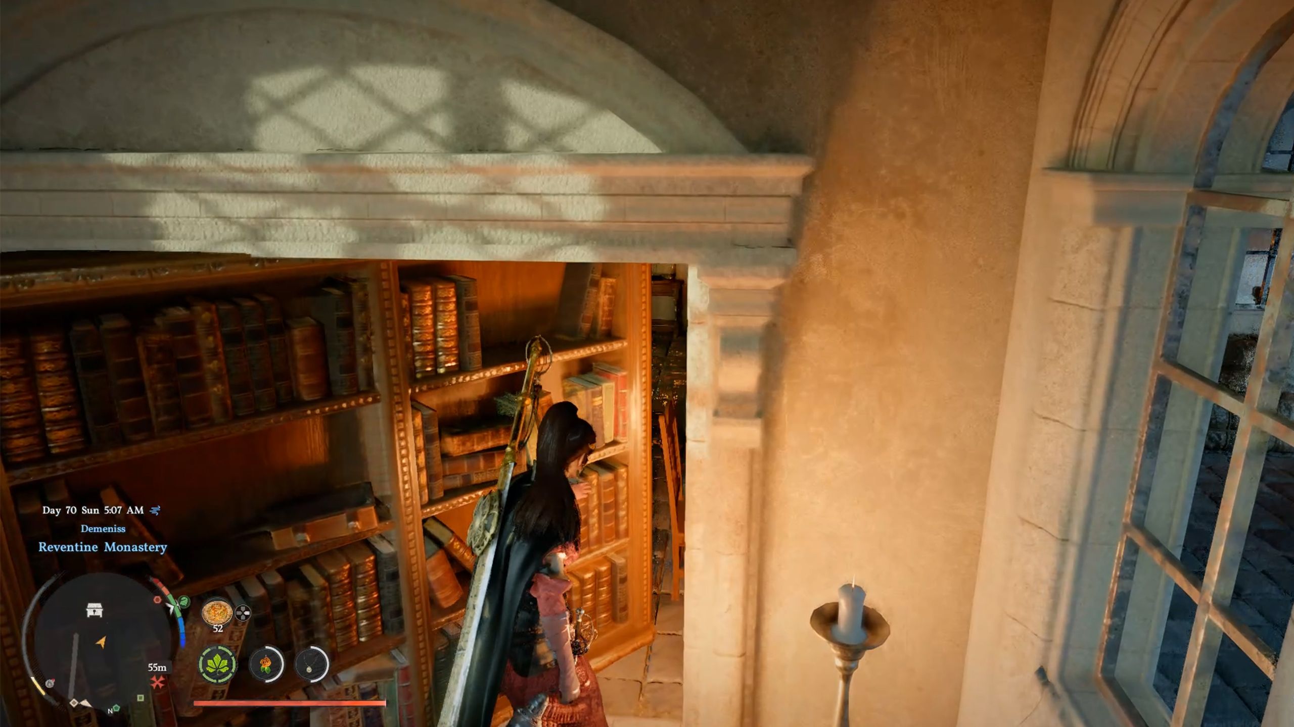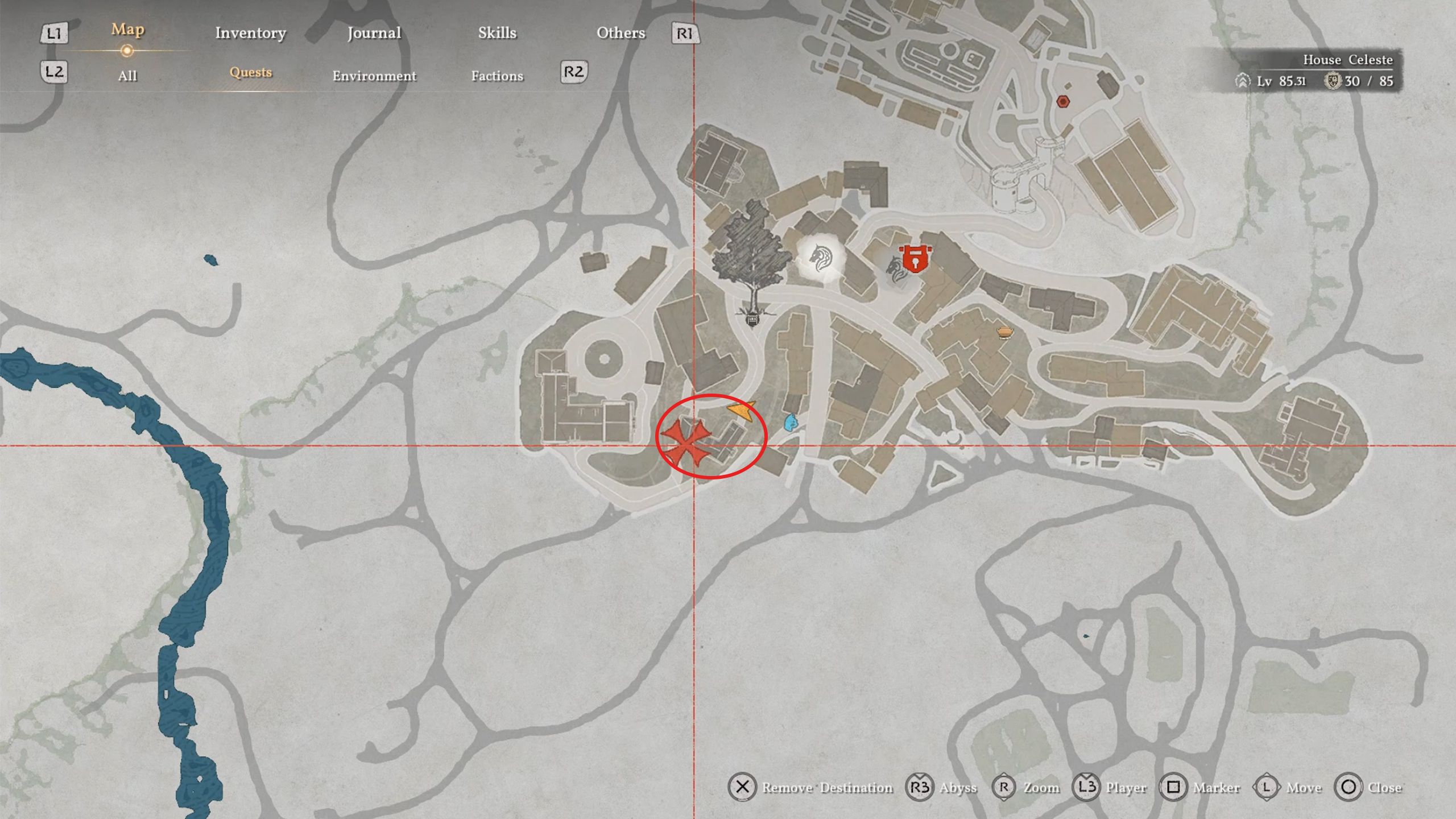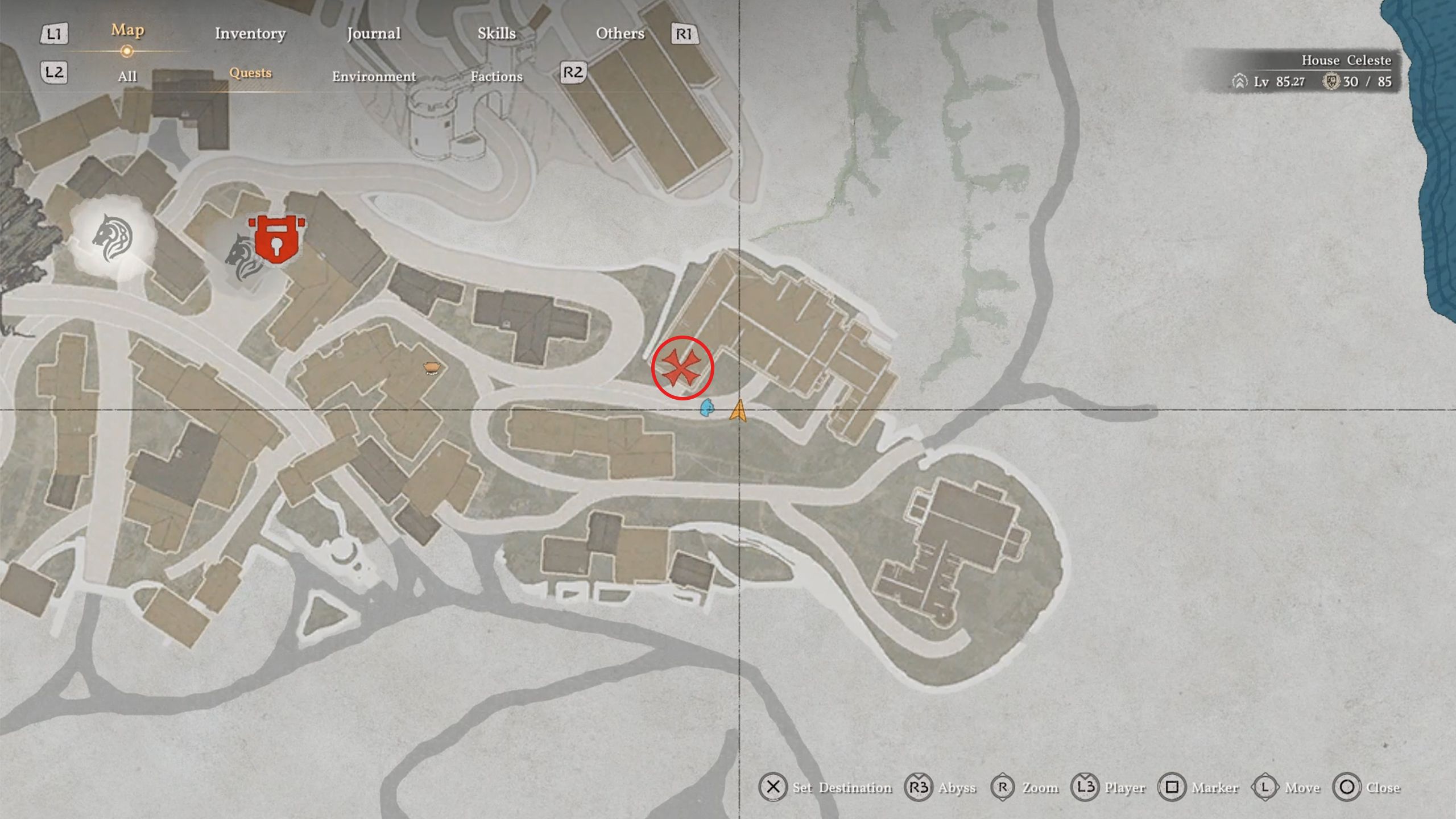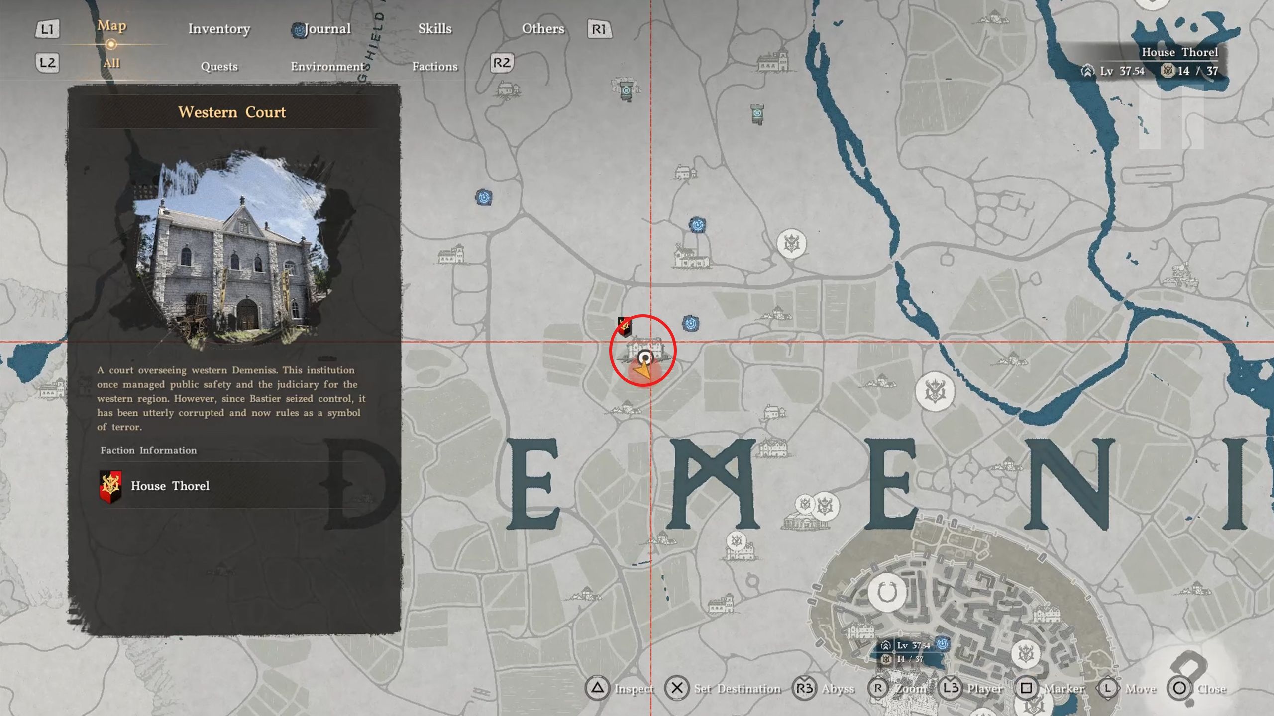 To reach the Western Court, look above the ‘M’ on the Demeniss map. You may need to fight and defeat the enemies, including the Half Moon Reaper, to claim the area, though stealth is also an option. Once inside, find the stairs and look for a curtain next to them on the first floor – it hides a ladder leading down to the basement. In the basement, you’ll need to solve a puzzle by rearranging the squares.