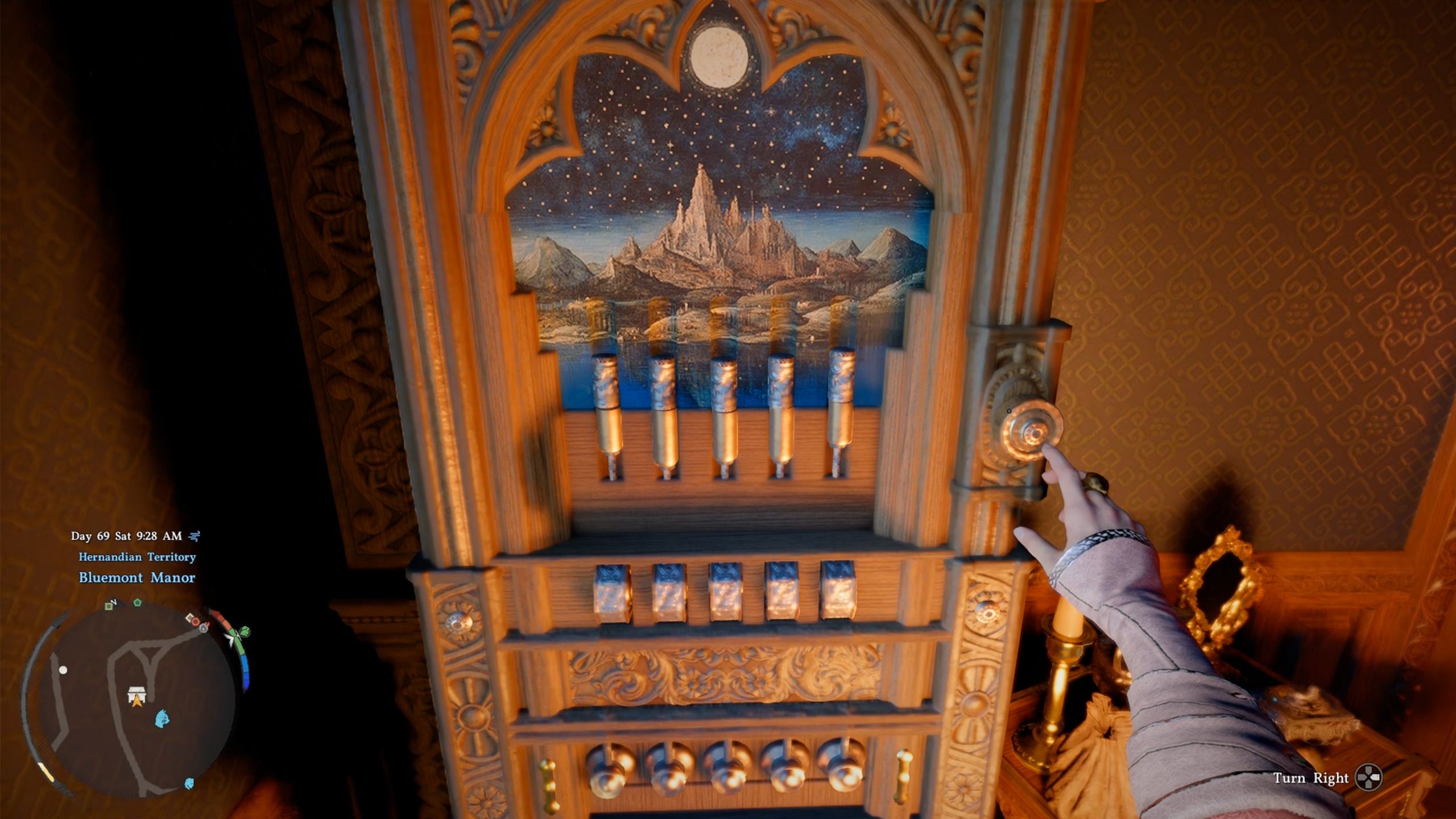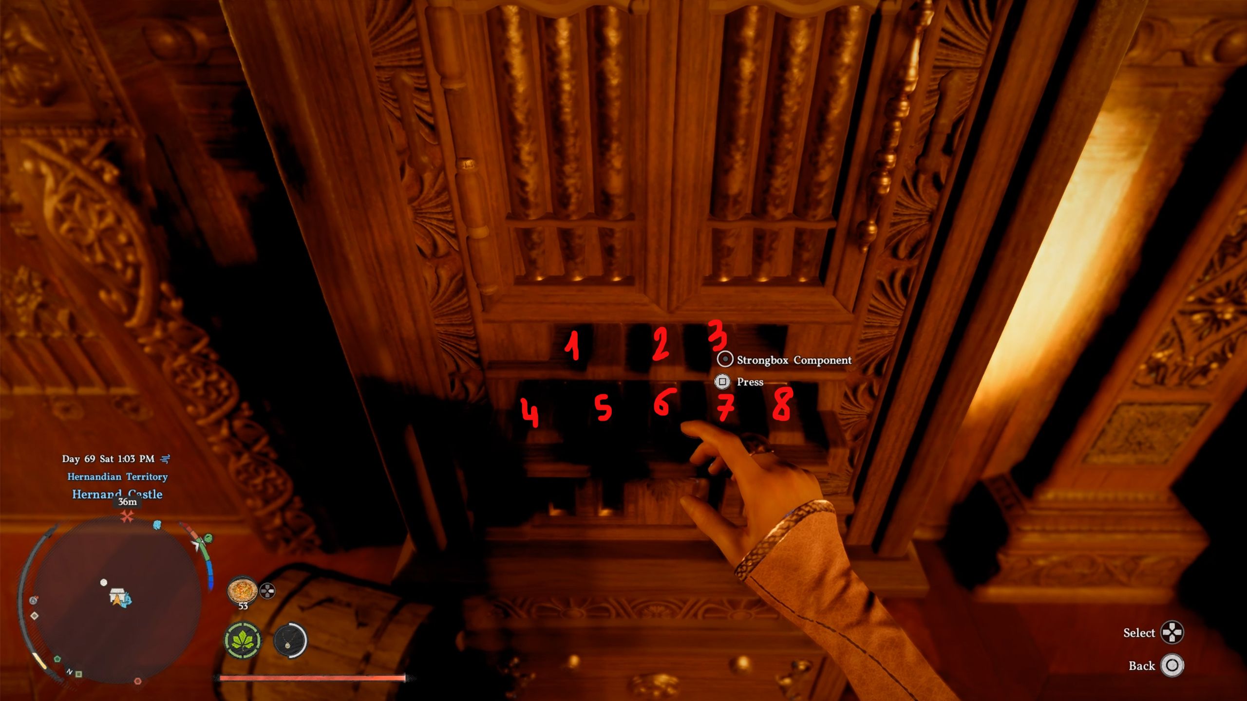 Enter Bluemont Manor, which is southwest of Hernand City, and head upstairs to the strongbox puzzle. To solve it, you’ll need to press the buttons in a specific order to rotate the pieces and complete the image.