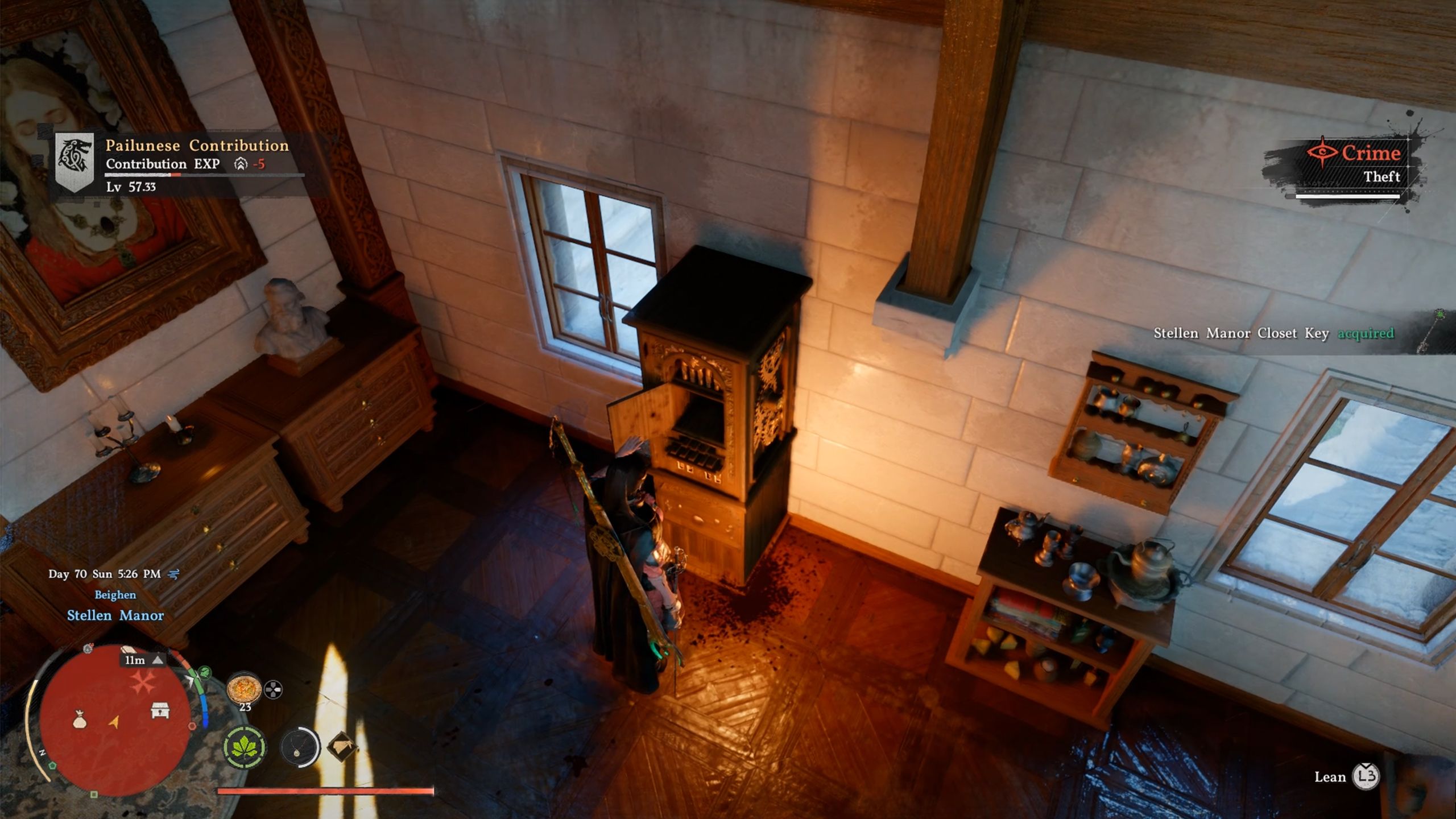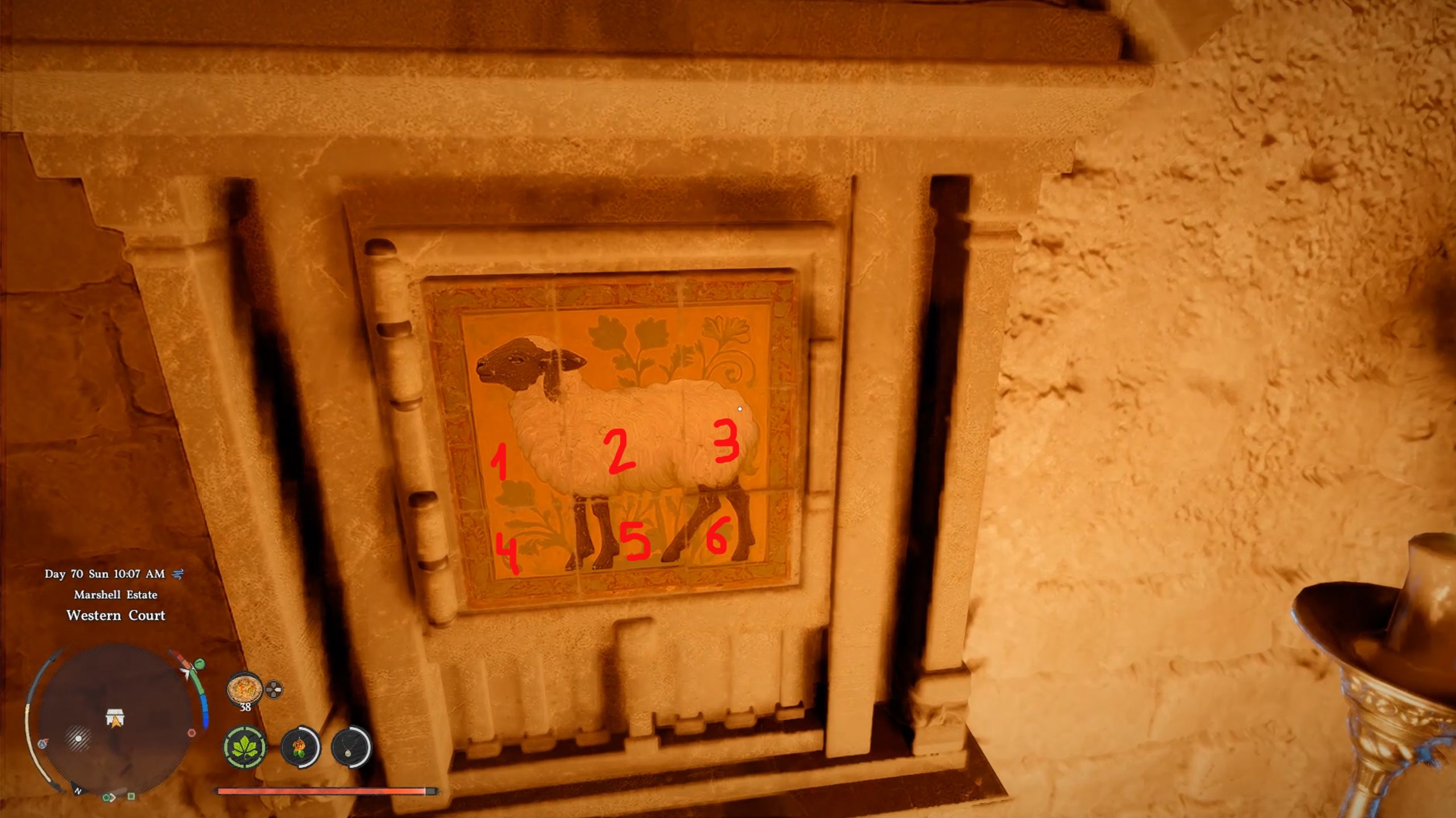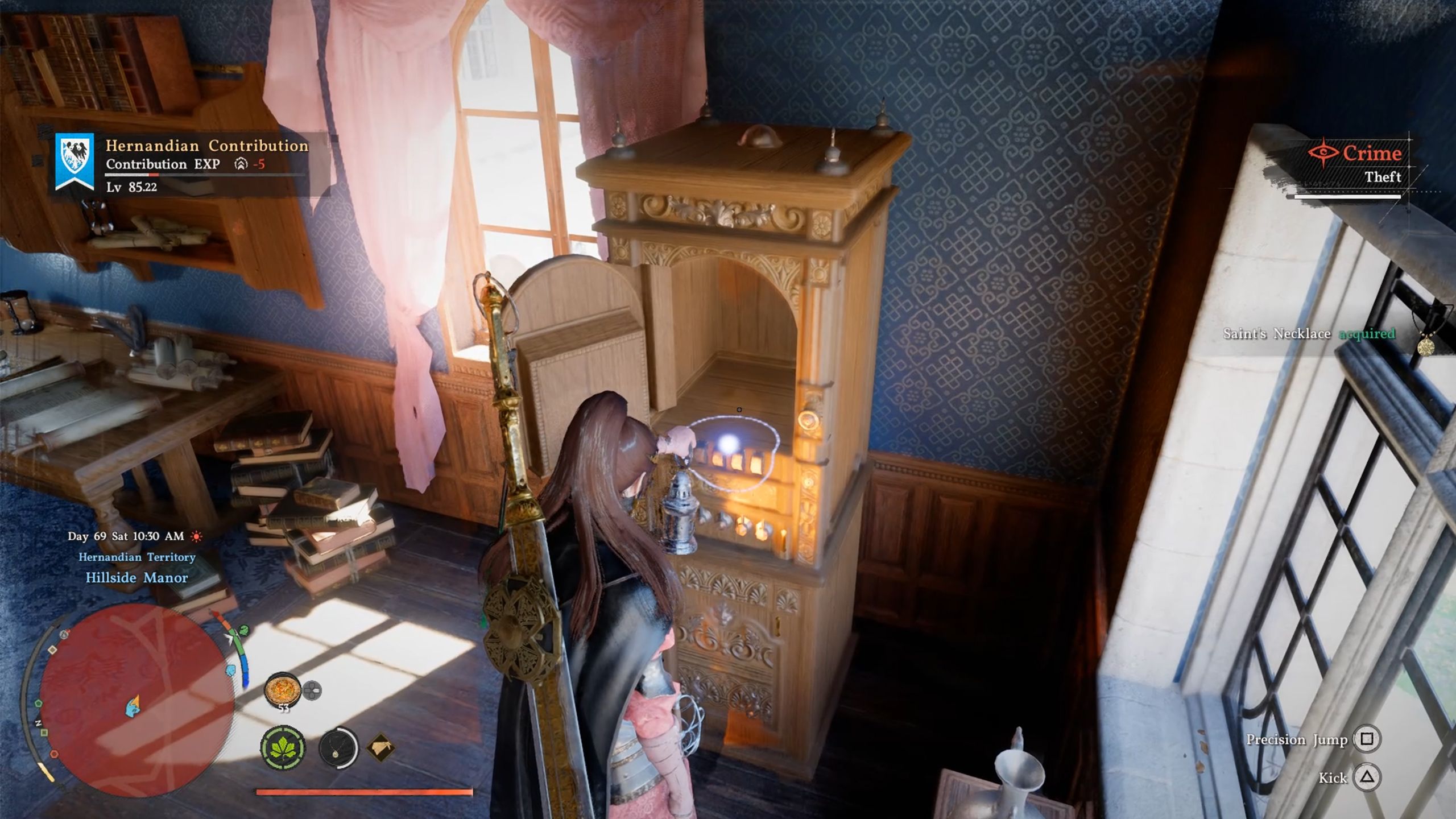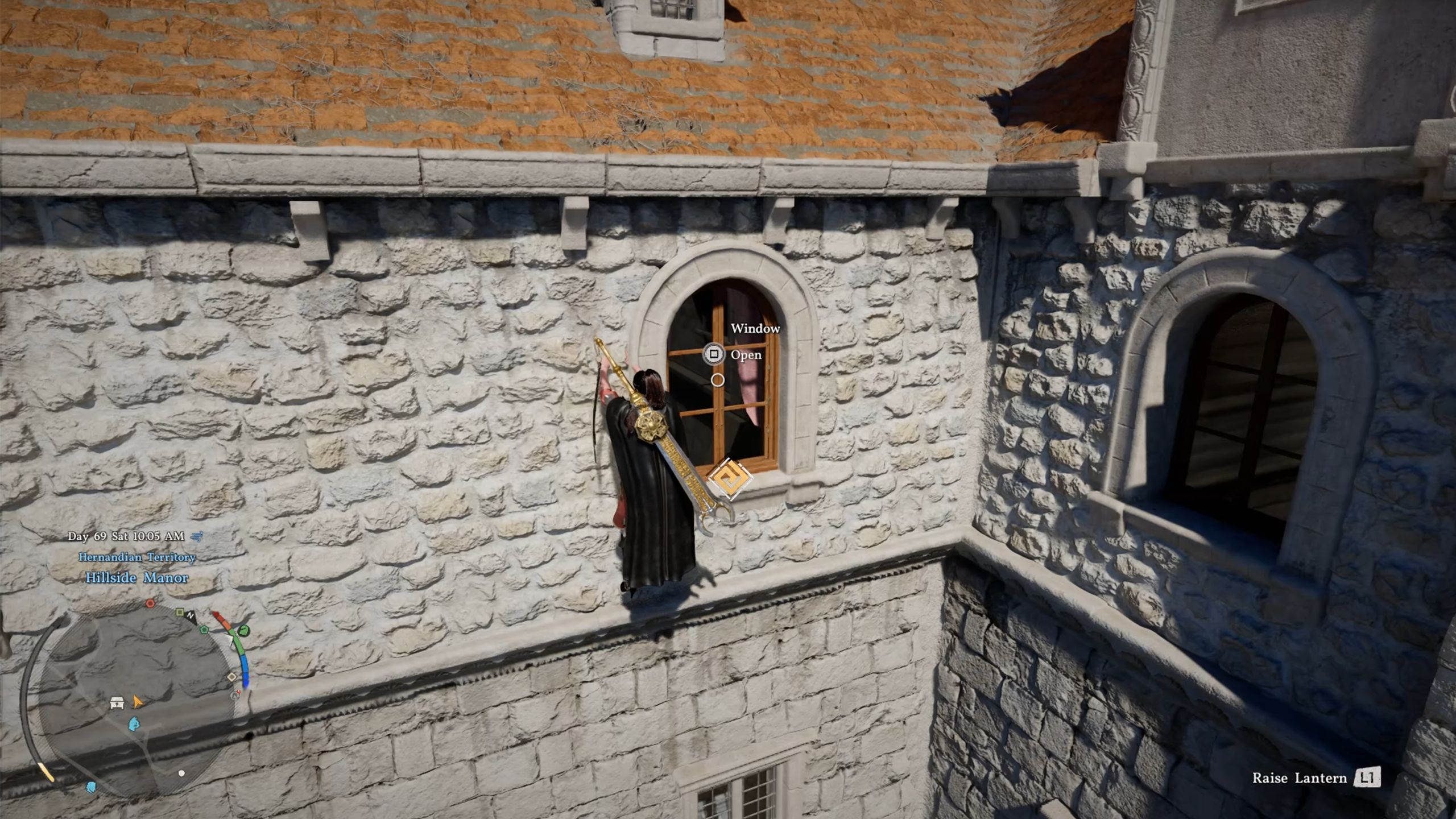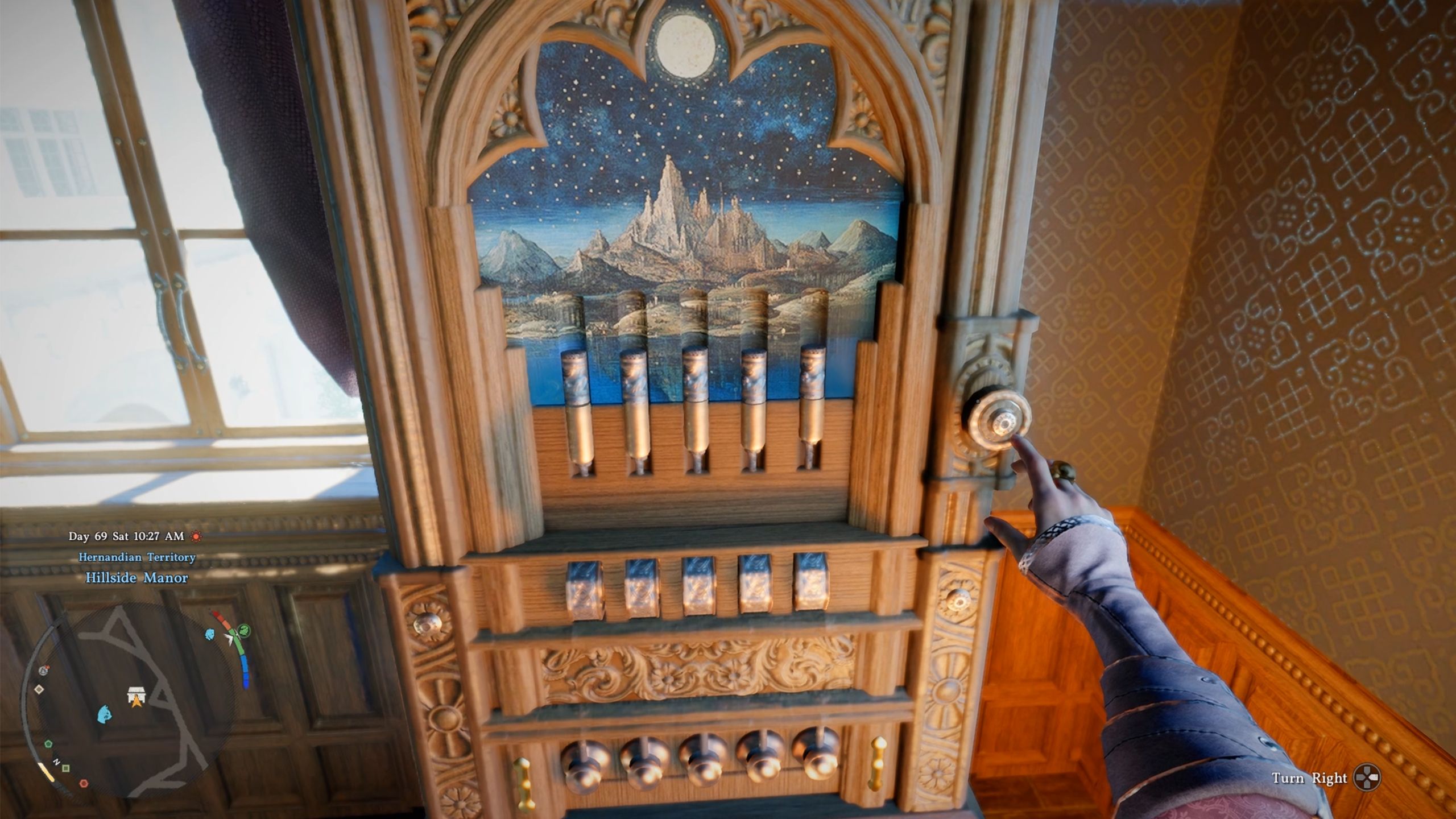 Hillside Manor is located on the east side of Hernand City. To get inside, climb the wall to the left of the entrance and open the window at the corner. This will lead you to a room with a strongbox that requires you to align the cylinders by turning the wheels.