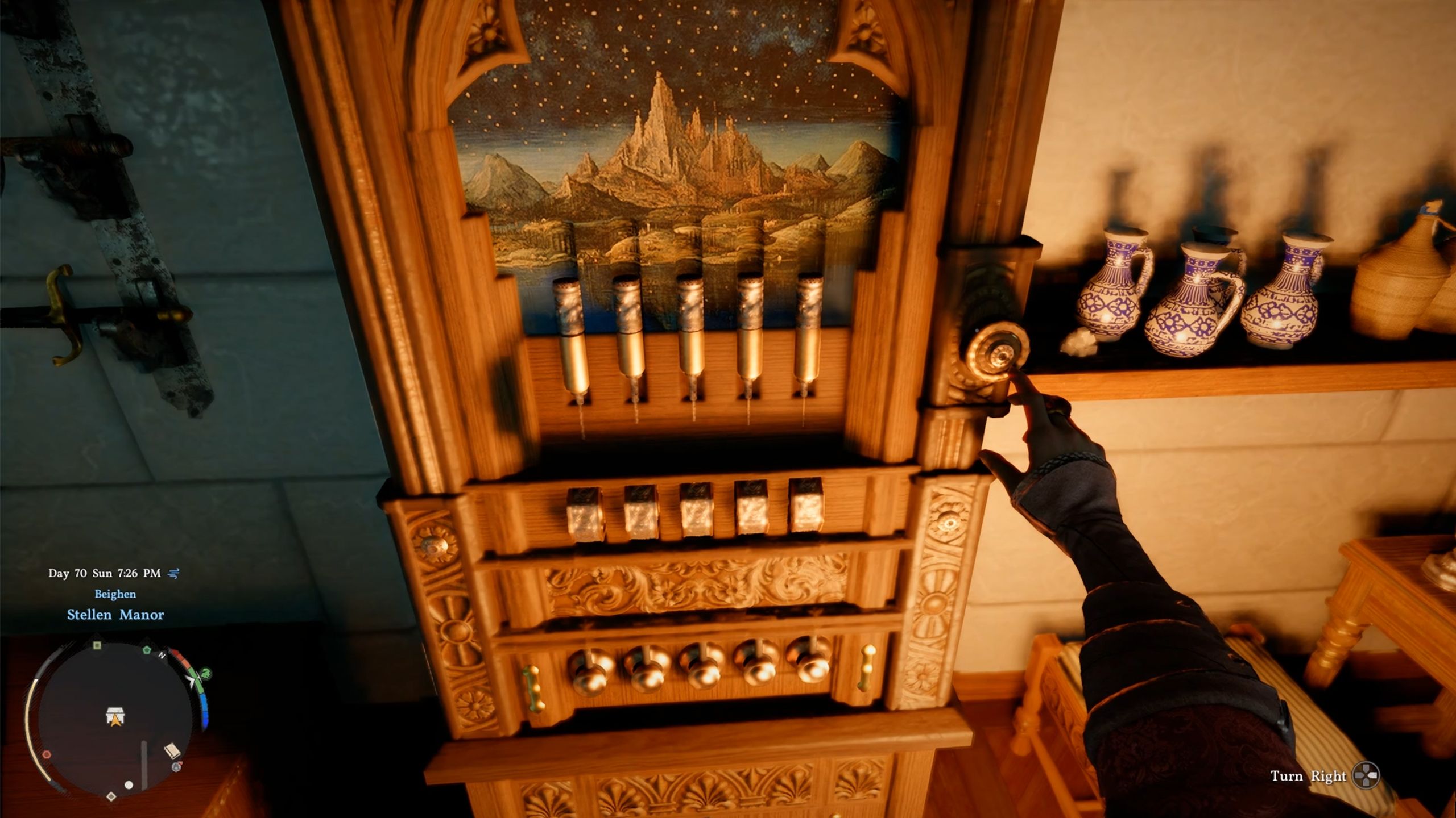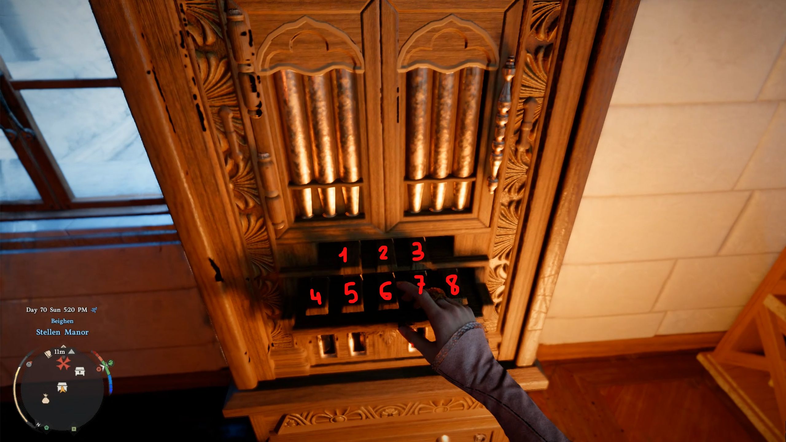 The second puzzle at Stellen Manor is a musical strongbox. Go to the dining room on the second floor – you can reach it by taking the stairs or climbing through the window. To open the strongbox and get the Stellen Manor Closet Key, you’ll need to press the buttons in the correct order to match the tune.