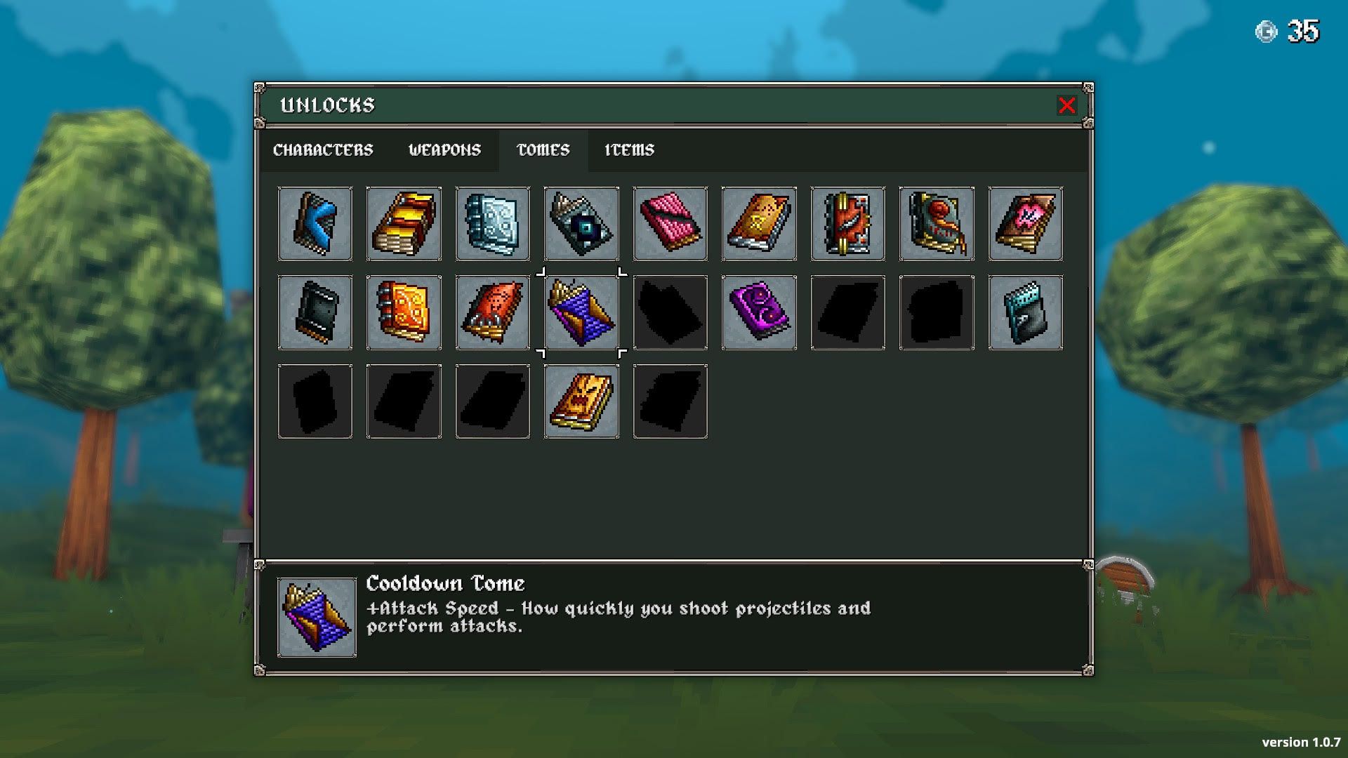Cooldown Tome | Unlocked by default | +Attack Speed: Reduces cooldowns, increasing attack rate |