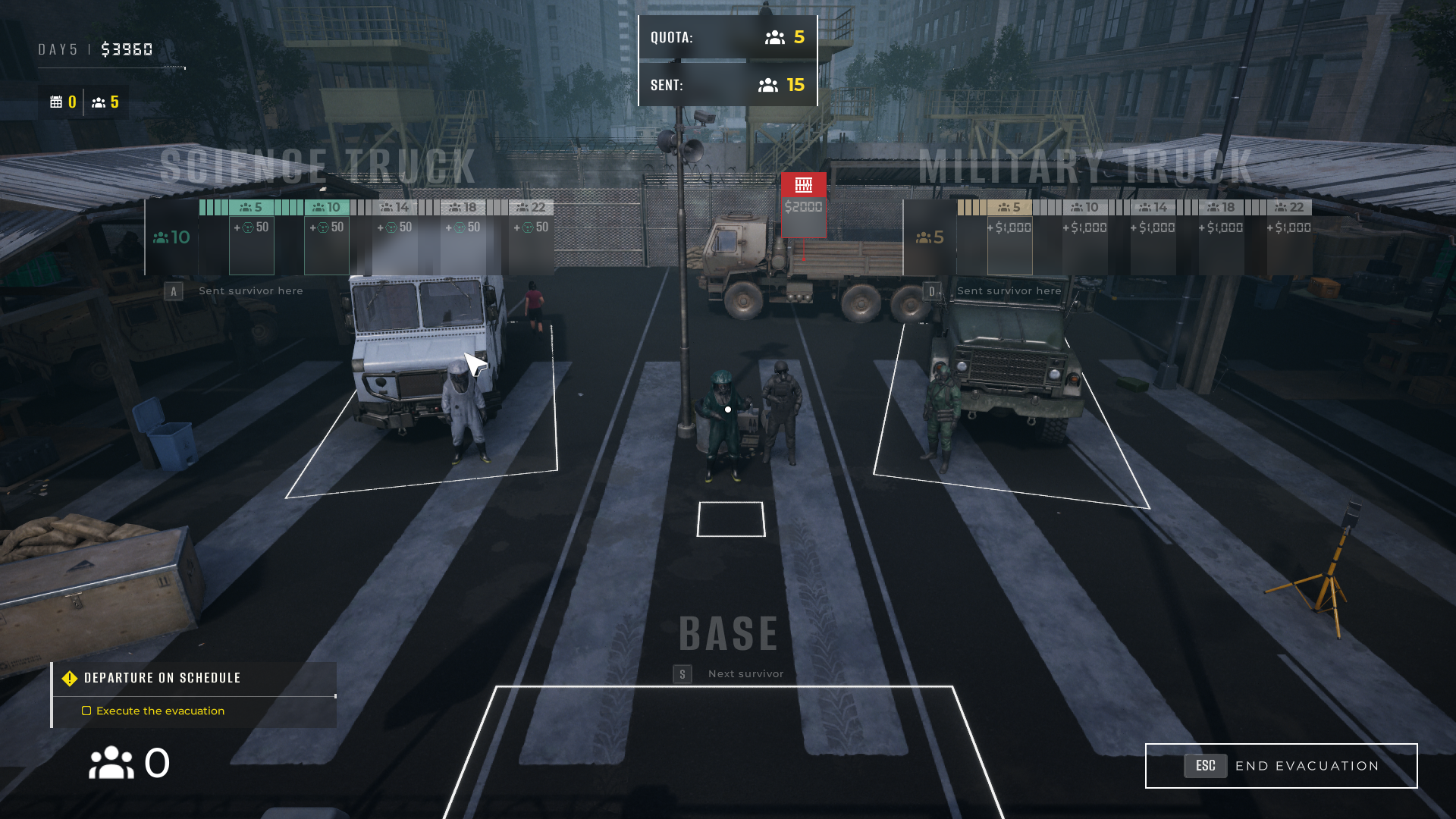 When it’s time to evacuate, players decide whether to send a survivor to the Science Truck or the Military Truck. The Military Truck gives players money, and the Science Truck gives them RP (reward points).