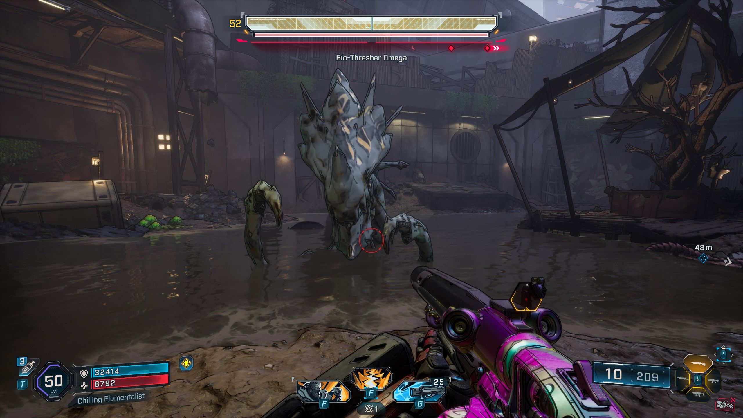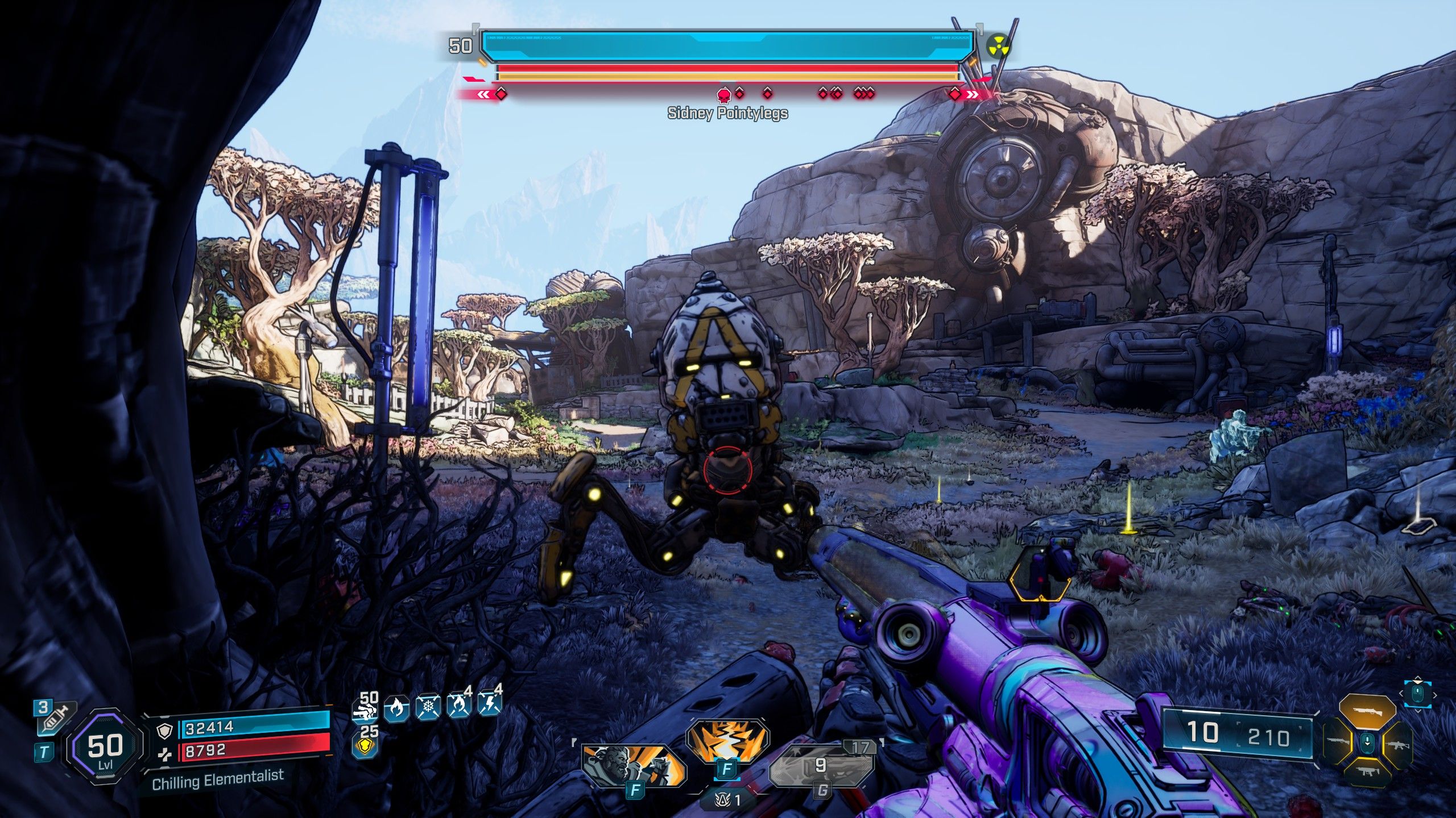 Sydney Pointylegs prefers fighting up close, meaning he’ll relentlessly pursue you and attack with spinning moves both on the ground and in the air. His initial health bar is a Shield, making Shock damage the most effective. Once that’s down, he switches to Flesh, vulnerable to Incendiary damage. Finally, his last health bar is Armor, which you can break apart with Corrosive and Cryo damage to defeat this mechanical enemy and complete the No Points Awarded challenge.