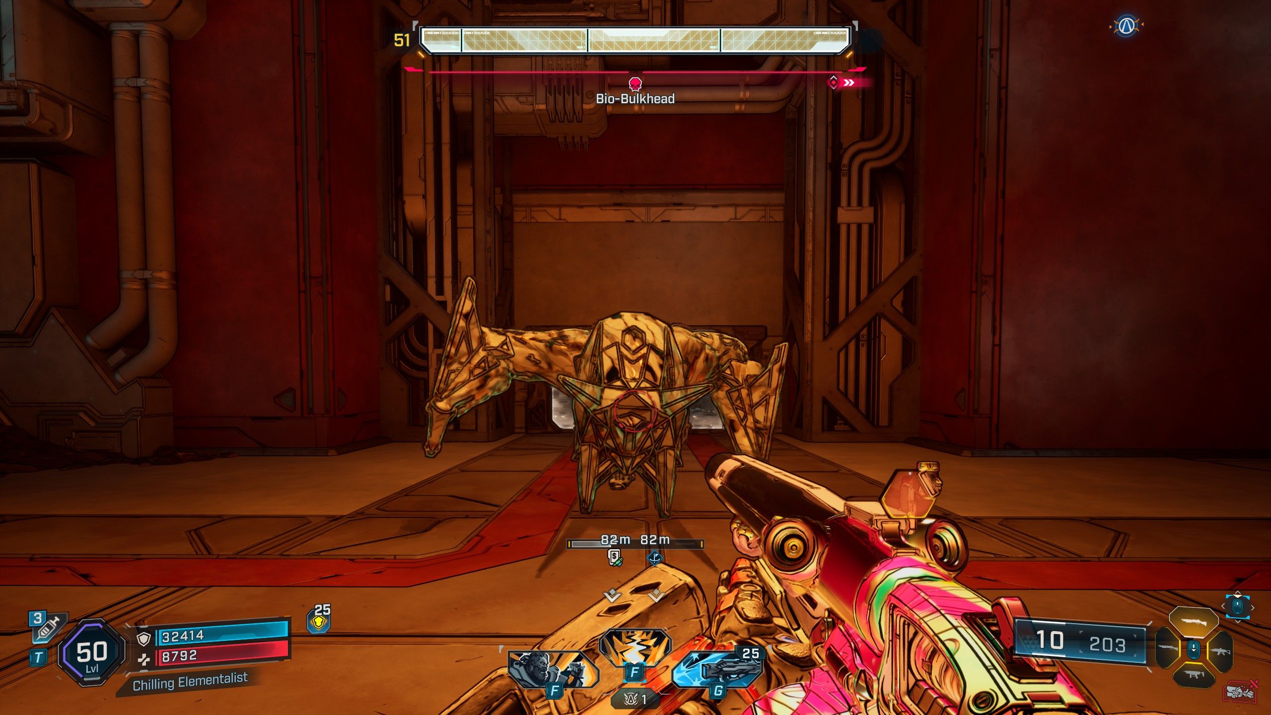 The Bio Armored Omega Thresher fights in several stages, but each one follows a similar pattern. Players can find a Locust Canister station on the north wall of the arena. Activate it with your grapple hook to throw a canister at the Bio-Thresher Omega, which will lower its armor and make it vulnerable to attack. This boss has an Armor health bar (yellow), so weapons dealing Corrosive and Cryo damage are the most effective. Keep in mind that the armor will regenerate between each phase of the split health bar. After dealing with the armor, the boss reveals a Flesh health bar (red), at which point you should use Incendiary weapons after throwing the Locust Canisters. This Flesh bar is divided into three phases, and the Bio Armored Omega Thresher frequently burrows underground, so patience is key. Once you’ve defeated it, you’ll complete the Omega 86’d challenge.