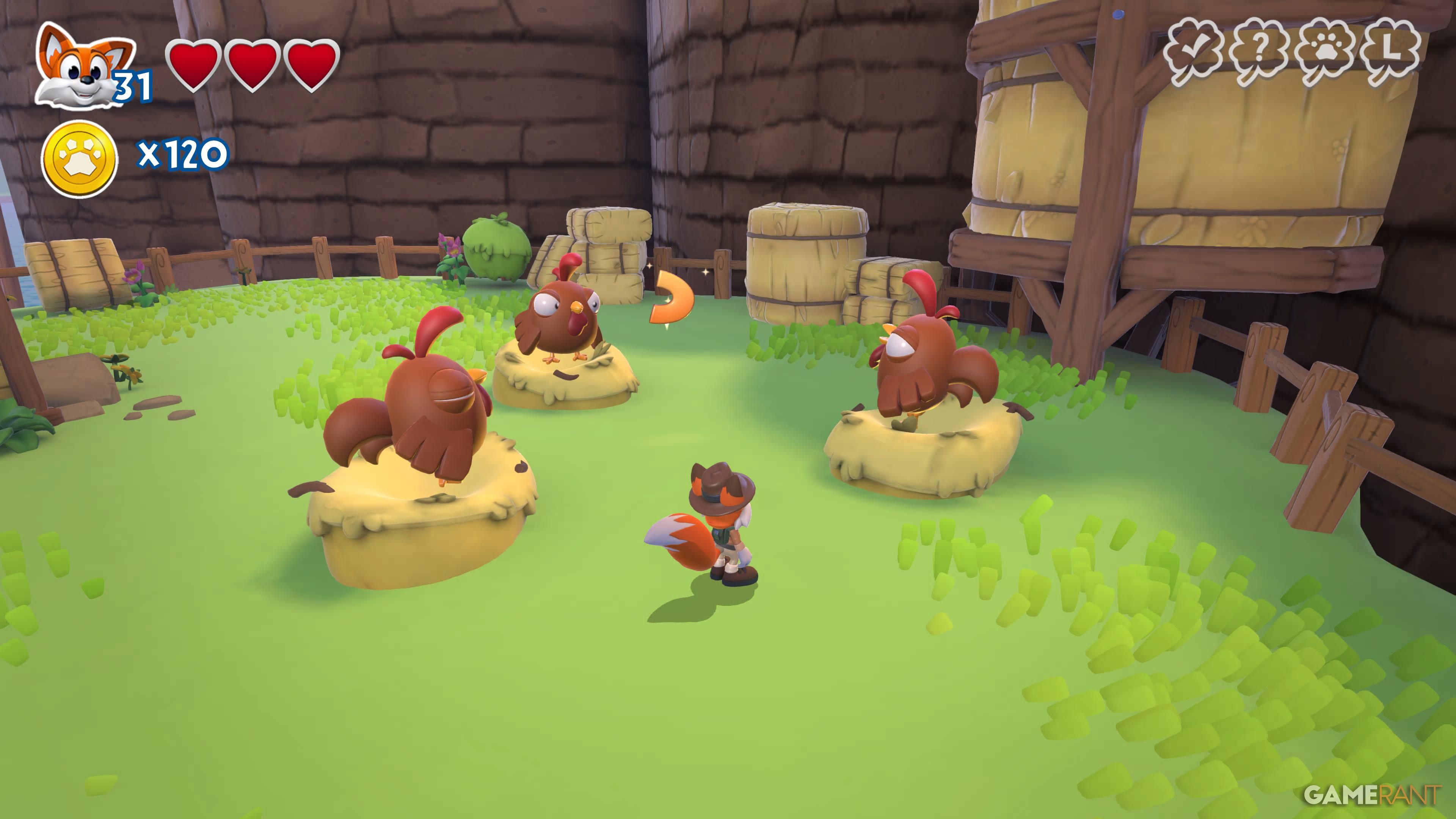 There are eight chickens that you have to gather inside the white fence, and this letter will appear once you do that. You need to use your Tail-Whip attack to push them inside. |