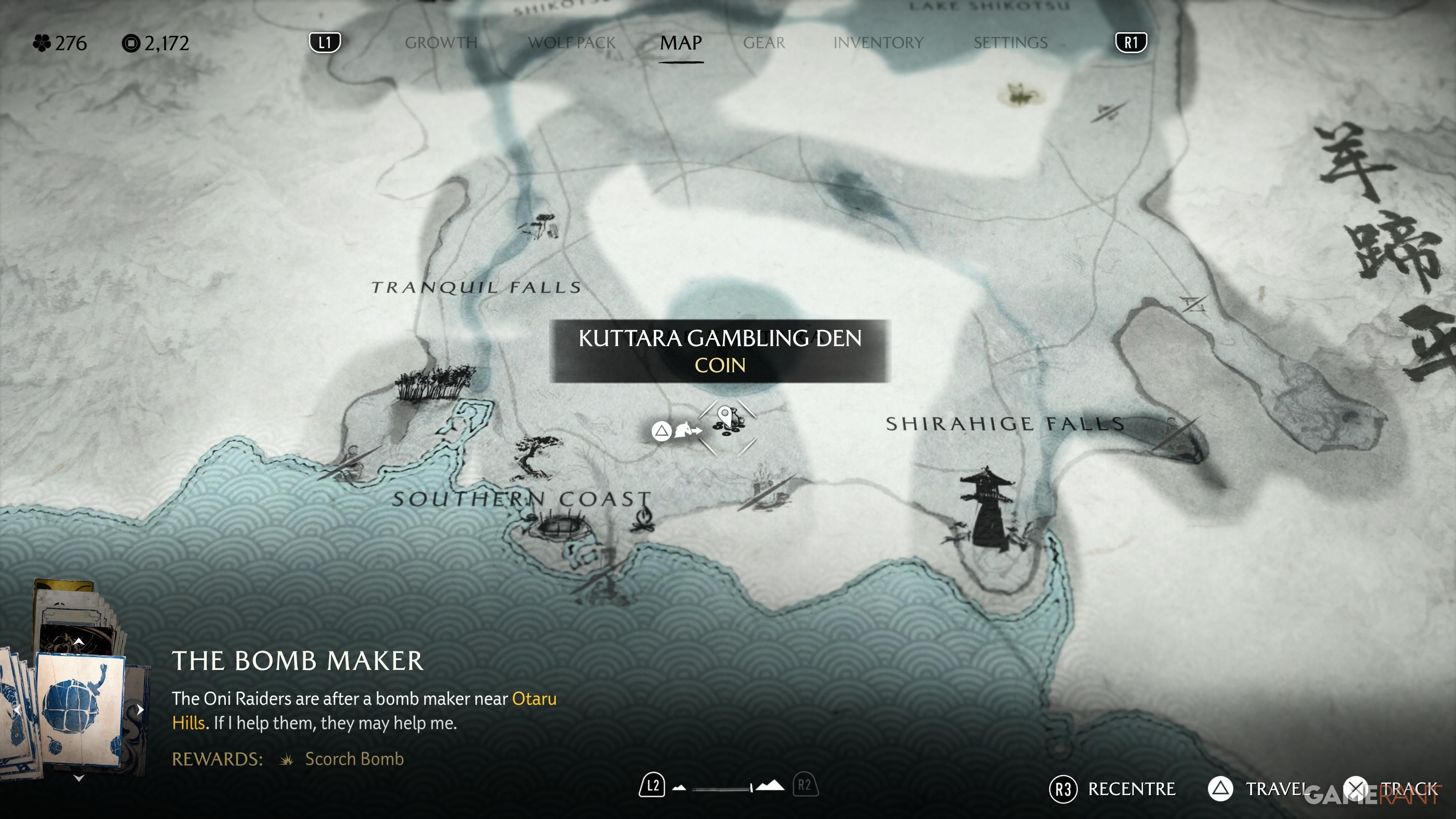 This hideout is south of the area, found directly under Lake Kuttara on the map. When you first arrive, you won’t be able to go inside because it’s guarded by Saito’s followers. An NPC will then start the ‘Sleight of Hand’ side quest. You *must* finish this quest to get access to the gambling den. If you play Zeni Hajiki and win against the owner twice, you’ll receive the Charm of Abundant Drink. This charm has the following effect: