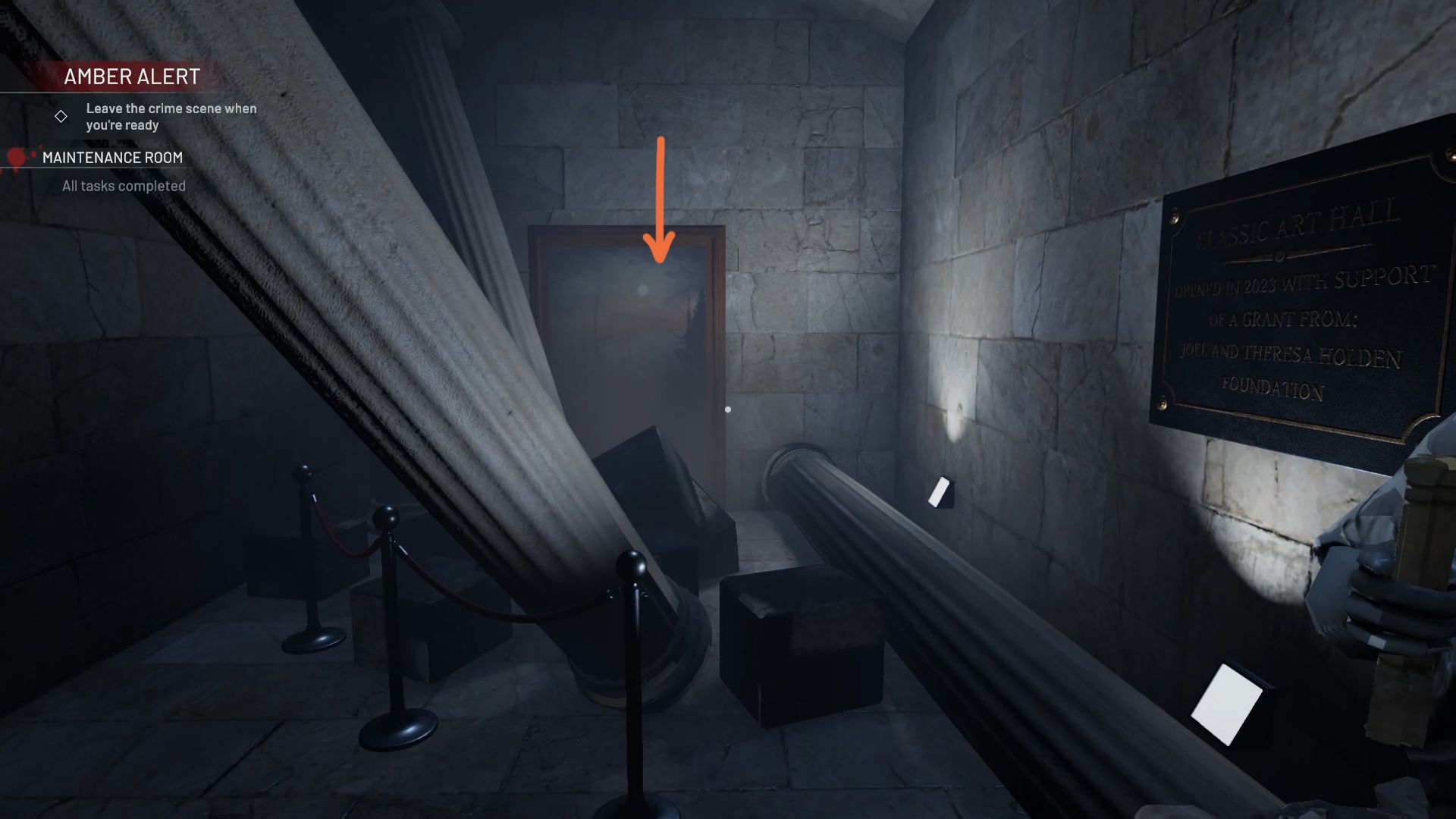 The fourth clue for the Amber Alert is hidden in the Maintenance Room. Look for a corner with damaged pillars and a sign for the “Classic Art Hall.”