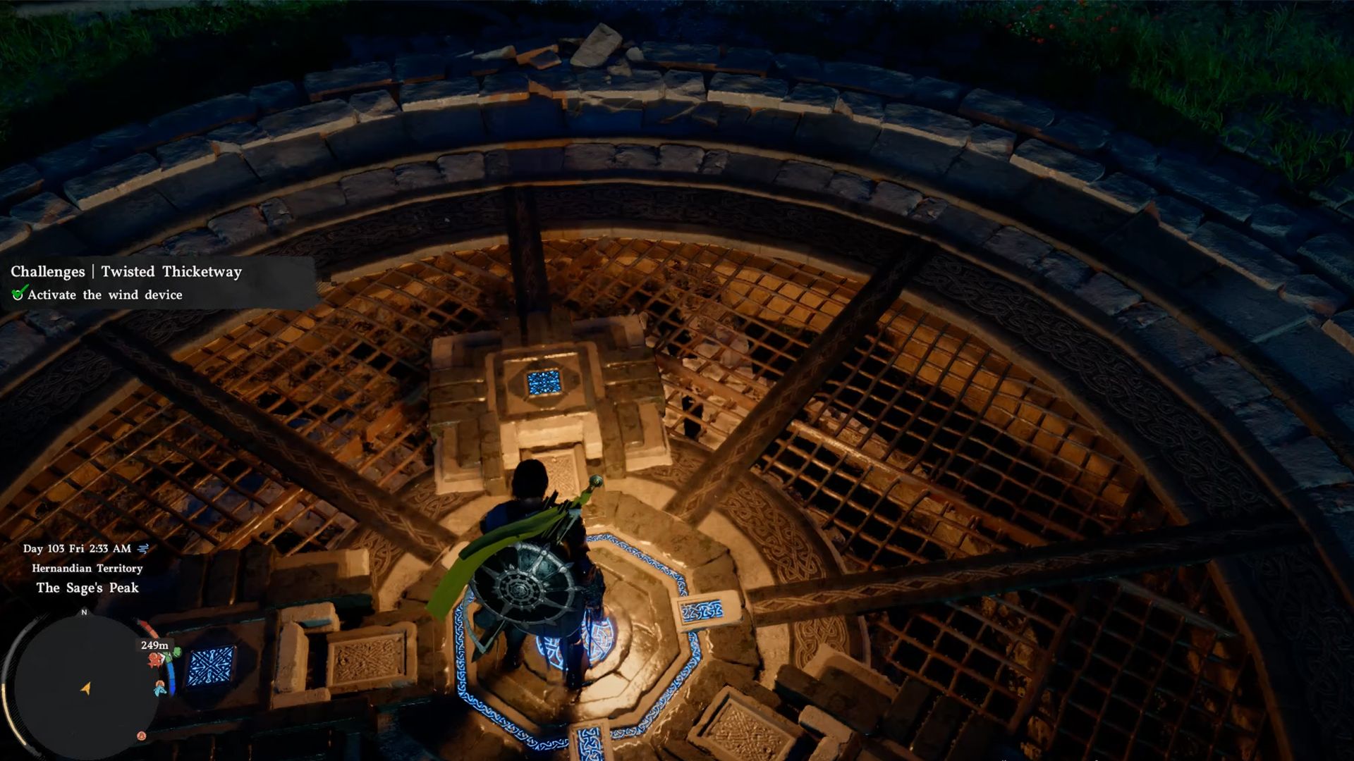 To finish the puzzle at the Ancient Sealed Gate in Crimson Desert and begin the Twisted Thicketway quest, simply climb the mountain and stand in the center of the fan. Then, use your wings while on top of the fan to send Kliff to the Abyss on a floating island called Twisted Thicketway.