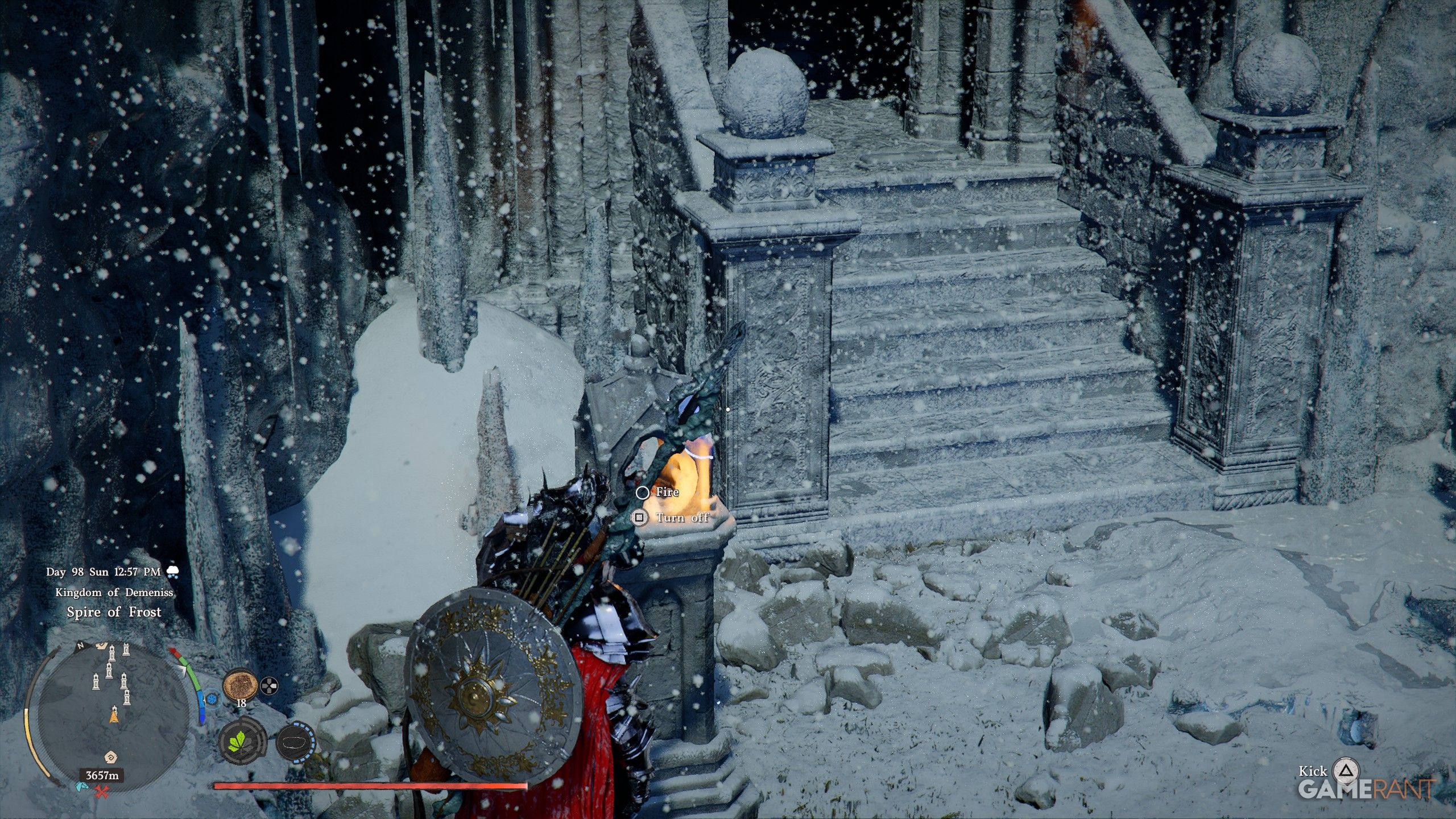 • The main entrance up the stairs is locked, so simply use Turning Slash (R1+R2) on the lantern outside the door and then light it up by interacting with it.