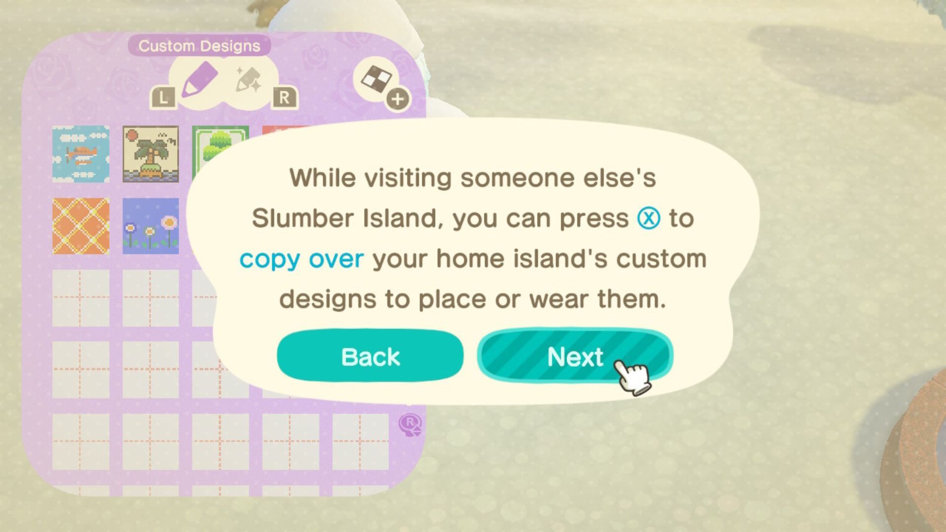 While visiting Slumber Island, players won’t be able to directly access the custom design portal. Instead, you’ll be able to move designs you’ve saved on your main island to slots on the Slumber Island you’re currently on. To use a specific design on Slumber Island, be sure to save it to your home island first, then transfer it. Good news: you can still create your own designs using the custom design app!