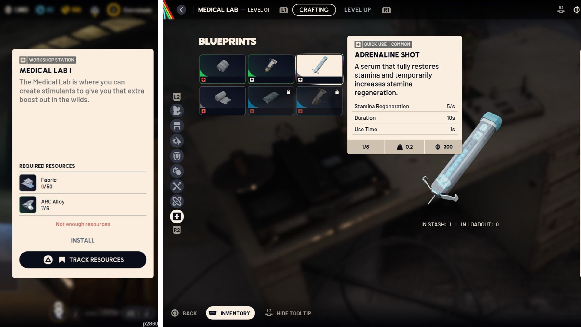 The Medical Lab is where you’ll find items like stimulants, syringes, and bandages. These are used to restore your health and quickly recover stamina, which is helpful for covering ground quickly. Remember, you can’t collect resources if you’re incapacitated, so everything in the Medical Lab is about keeping you alive and in the fight.