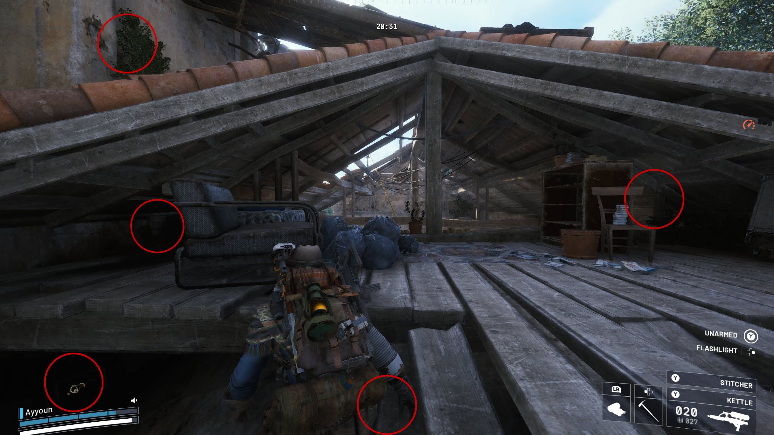 Once you get on top of Raider’s Refuge, drop into the collapsed ceiling, and you may find the button under the floorboards to the left. The second location for the button is just over the floorboards, behind the long chair. Another location for the button is just behind the small shelf to the right. The other locations are at the beginning of the floor boards, and on top of the roof tiles, near the bush. |