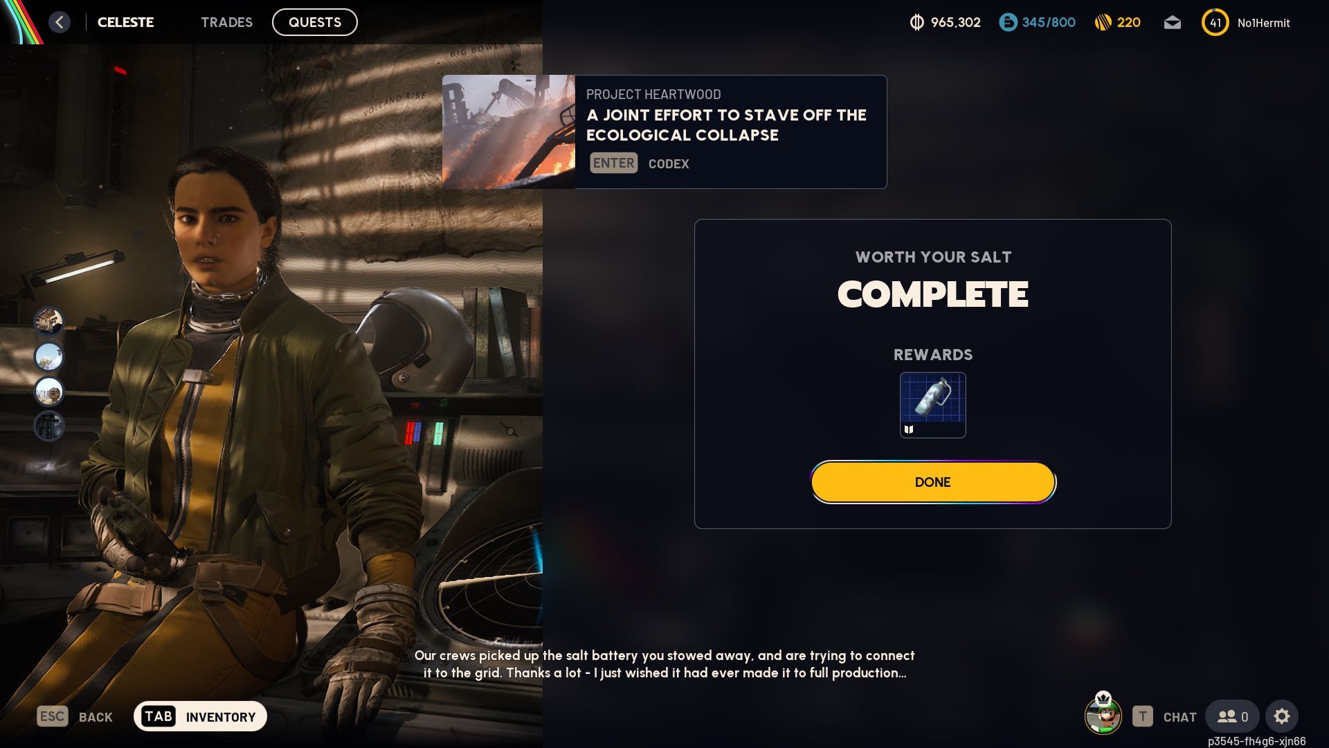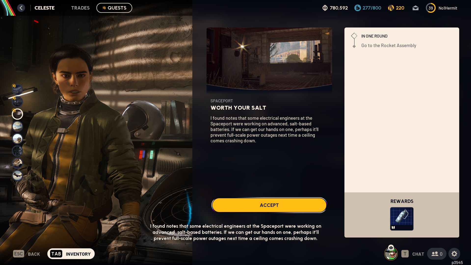 You can start this quest immediately after updating to the latest Shrouded Sky patch. Celeste will give you the quest, and she’ll need you to find a new salt battery.
