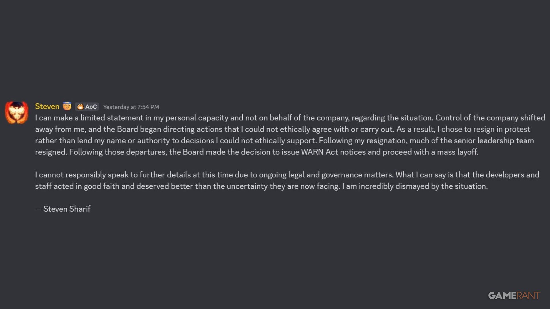 I was really excited when Ashes of Creation finally launched in early access and it pulled in a ton of players on Steam, but things are looking pretty grim now. I just found out that Steven Sharif, one of the main creative forces behind the game and a co-founder of Intrepid Studios, has resigned. He announced it on their Discord, and it sounds like he left because he strongly disagreed with something the studio’s board was doing. Apparently, they’re moving control away from him and he said they’re planning layoffs. He couldn’t say much more due to legal reasons, which is super concerning. It’s a really worrying sign for the future of the game, honestly.