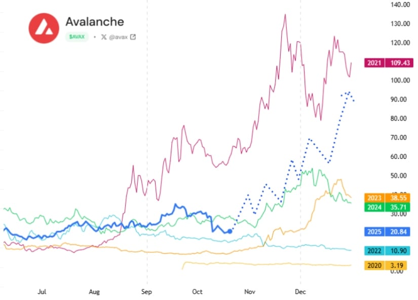 The Avalanche narrative is gainin’ traction faster than a Twain tale at a campfire. Share reckons AVAX has a knack for peakin’ in the last leg of the year, just like a firecracker on the Fourth of July. History’s got a way of repeatin’ itself, and late Q4 rallies have always sent this crypto shootin’ for the stars. 🌠🤠