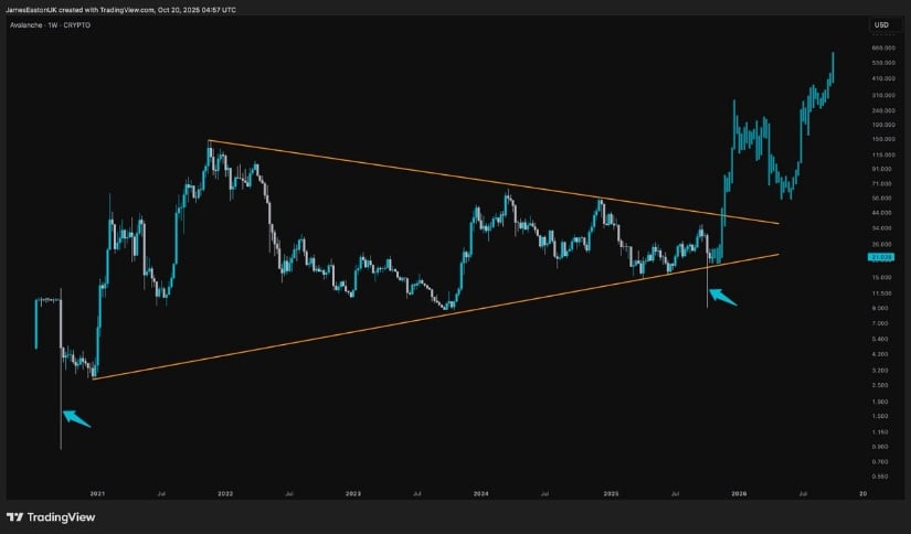 James spotted a “John Wick” fractal, where the same ol’ compression structure led to a fireworks show of upside. The symmetrical wedge pattern’s as clear as a bell, and it’s got the same swagger as 2021’s setup that sent AVAX to $140+. If the breakout sticks, we’re lookin’ at $45 to $55, with support holdin’ steady near $18.5 to $19.0. Break that diagonal resistance, and AVAX might just go on another wild ride. 🎢🔥