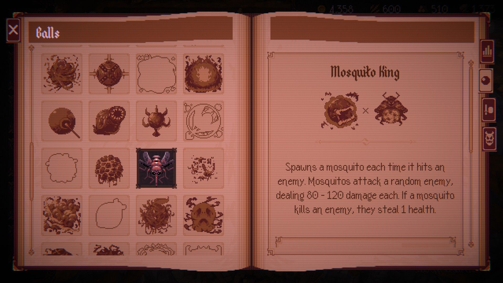 Description | Spawns a Mosquito every time it hits an enemy. Mosquitos attack random targets, dealing 80-120 damage. If a Mosquito kills an enemy, you gain 1HP. |