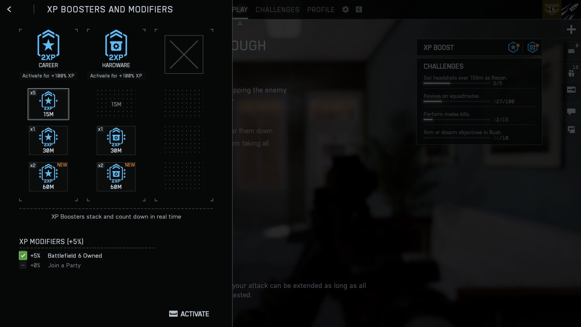 To use any XP Boosters you’ve saved, you’ll first need to start a match. Once in the game, press the Escape or Start button to open the pause menu. Look for the XP Boost icon – it’s located on the upper-right side of the screen, above the Challenges list.
