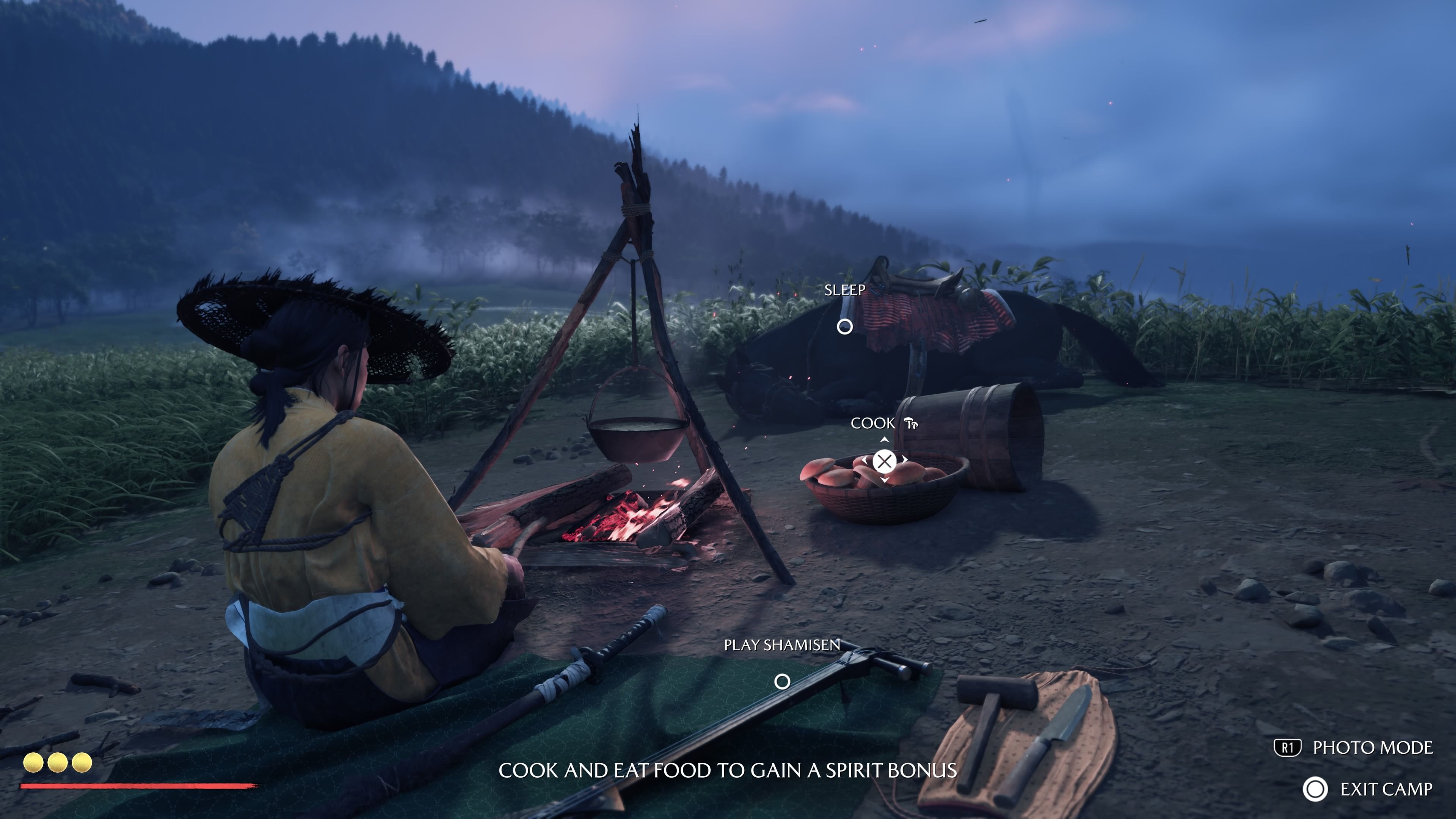 While you’re with your horse, you can press Left on the D-Pad to create a Camp. The Camp is a fantastic way to let Atsu rest and recover – simply activating it restores her Spirit points (Resolve). This is a safe, combat-free method for regaining Spirit, so don’t hesitate to rest often between fights. Additionally, within the Camp, you can sleep to advance or change the time of day, and prepare food for helpful bonuses. For example, cooking a Mushroom will grant 24 hours of increased Spirit.