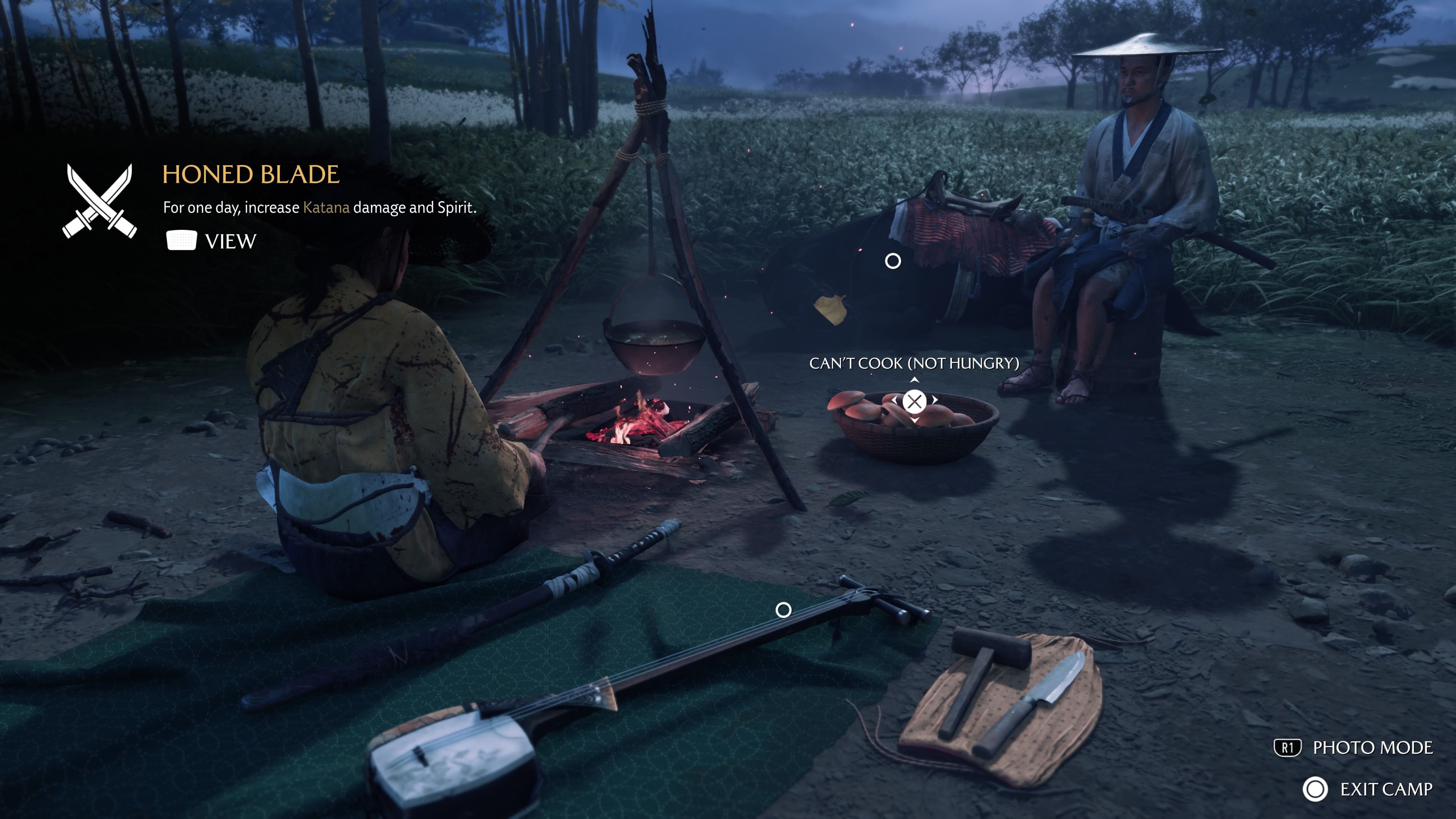 While you’re with your horse, you can press Left on the D-Pad to create a Camp. The Camp is a fantastic way to let Atsu rest and recover – simply activating it restores her Spirit points (Resolve). This is a safe, combat-free method for regaining Spirit, so don’t hesitate to rest often between fights. Additionally, within the Camp, you can sleep to advance or change the time of day, and prepare food for helpful bonuses. For example, cooking a Mushroom will grant 24 hours of increased Spirit.