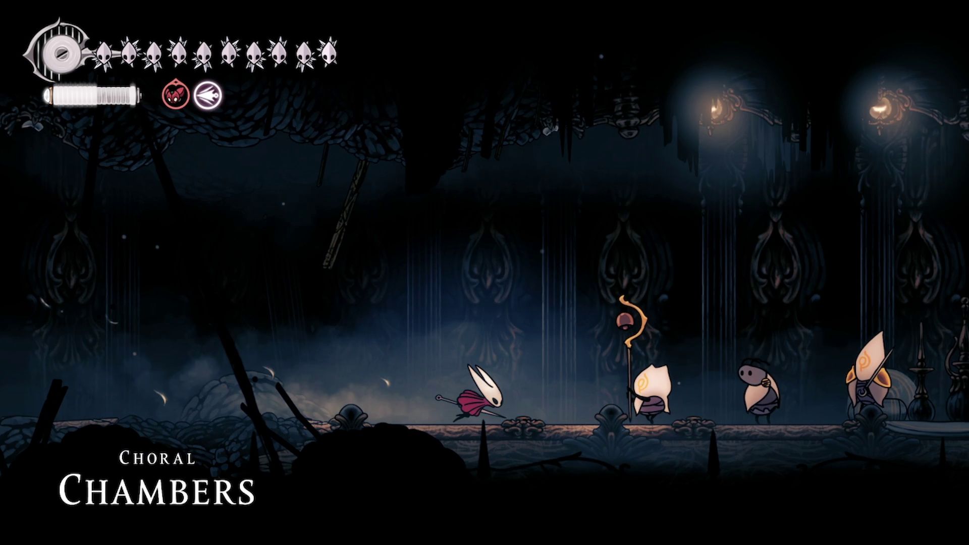 The most efficient place to collect resources in Act 3 of *Silksong* is in the upper-left area of the Choral Chambers, right below the entrance to the High Halls, near the bench.