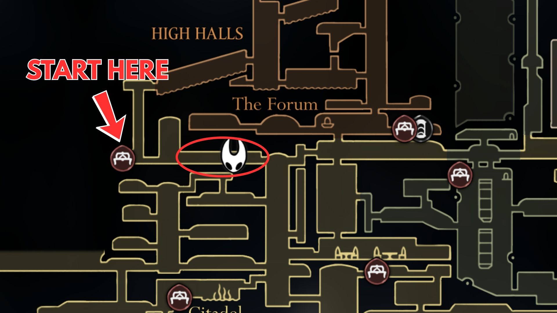 Start from the bench and quickly dash to the right to enter the enemy room. Get close and immediately use your Silkspear to instantly defeat the first two enemies and heavily damage the third. Dash right again while performing a running attack with Hornet’s Needle, launching you into the air. Follow this up with a downward slash to finish off the last enemy. Then, return to the bench and repeat this process.