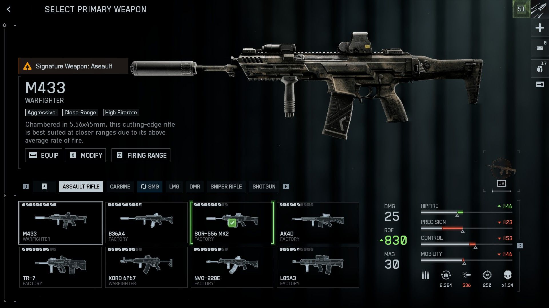 The M433 rifle excels in close-range combat, and with the right attachments, it performs well at longer distances too. It can eliminate an enemy with just four body shots from up to 10 meters away, and its rapid fire rate of 830 rounds per minute gives you a significant advantage over most other assault rifles, even the Kord 6P67.