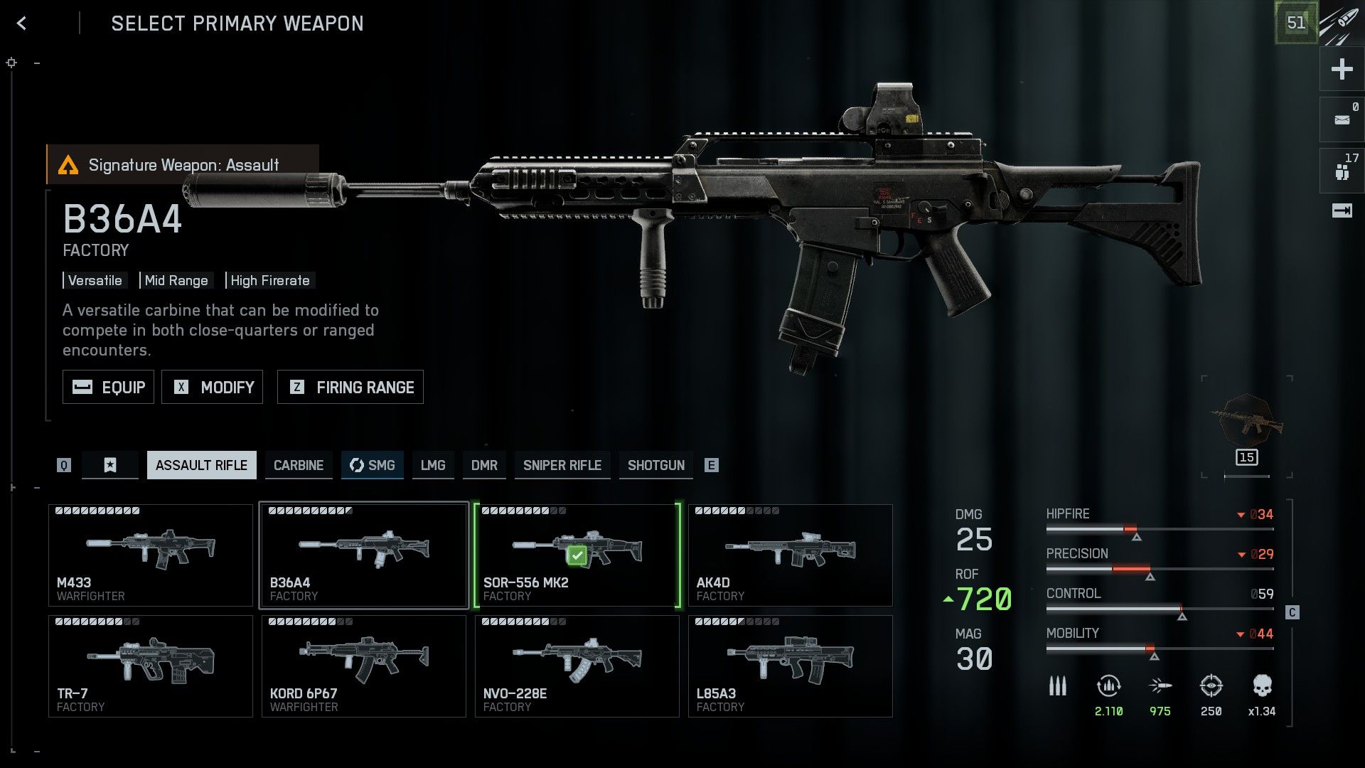 This weapon performs almost identically to the NVO-228E overall. While best suited for medium-range combat, its fast fire rate of 720 rounds per minute makes it a strong contender in close-quarters battles, even compared to the NVO-228E. The B36A4 has significantly less recoil – both visually and when firing – than the M433 and NVO, resulting in a very smooth shooting experience with attachments.