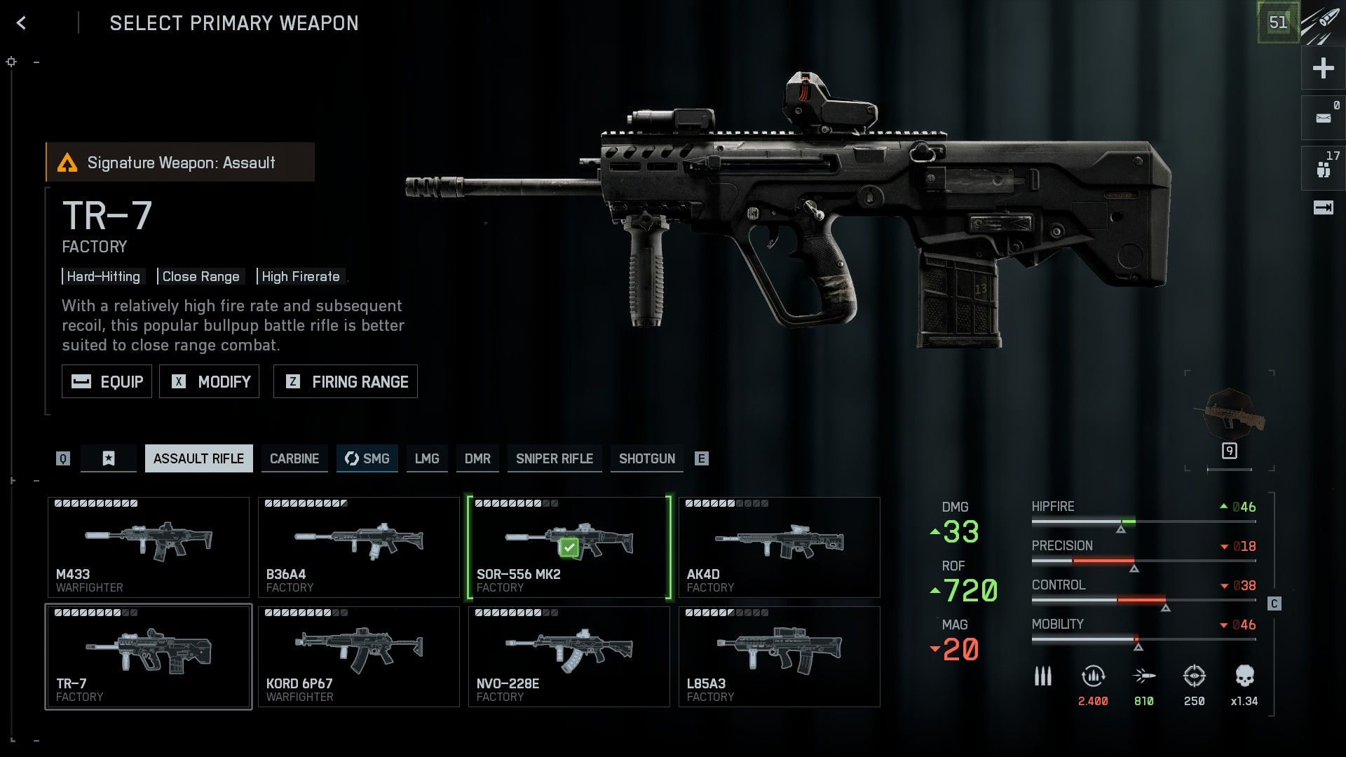 We didn’t like the TR-7 at first. It had a strong kick to the left and quickly became inaccurate after just a few shots. But after testing it thoroughly, we realized the TR-7 is easily the best assault rifle for fighting in close quarters. Within 20 meters, it outperforms all other ARs, and its damage is comparable to the M277 carbine at distances of 75 to 80 meters.