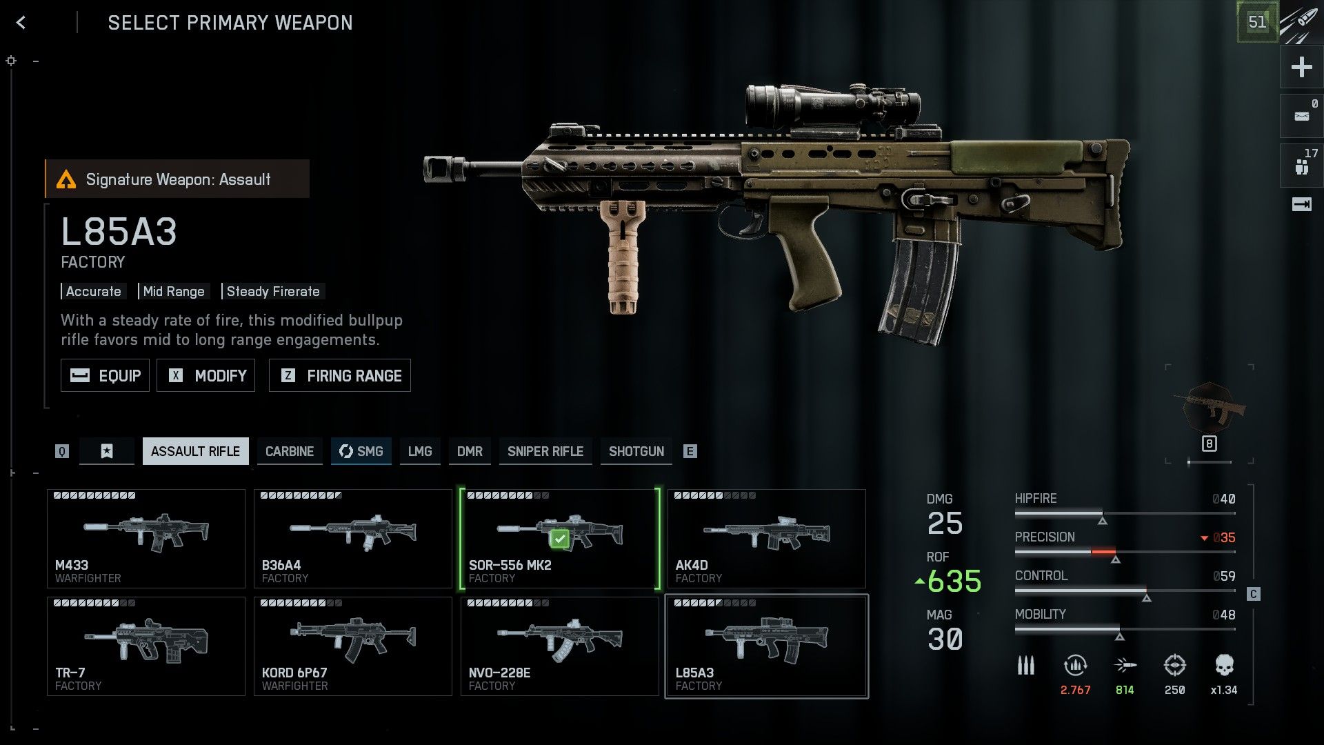 When it comes to mid-range combat – around 40 to 80 meters – the L85A3 stands out as the most dependable weapon. It’s perfectly balanced for this range, with great accuracy, manageable recoil, and a fast fire rate. Plus, it performs surprisingly well in close-up fights.