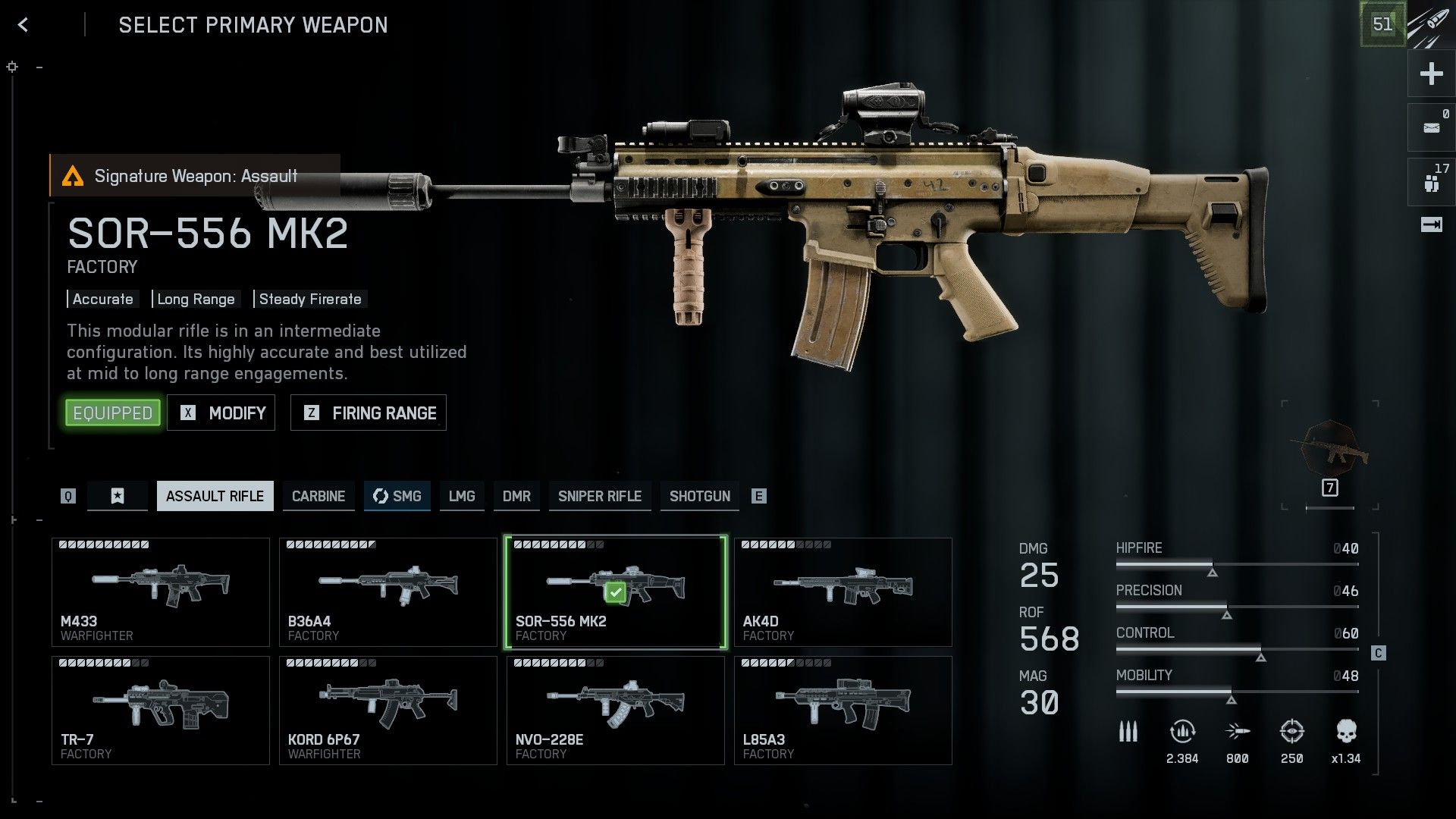 Okay, so the SOR-556 isn’t *bad*, but honestly, it feels a little slow in close-up fights compared to other assault rifles. Where it really shines, though, is at medium range – it can seriously put people down. The accuracy can be a bit jumpy sometimes, but it’s usually pretty reliable. But honestly, the best thing about this gun is how little recoil it has. It actually feels more like an SMG, like the UMG-40, than a traditional AR. I find myself comparing it to that more than anything else.