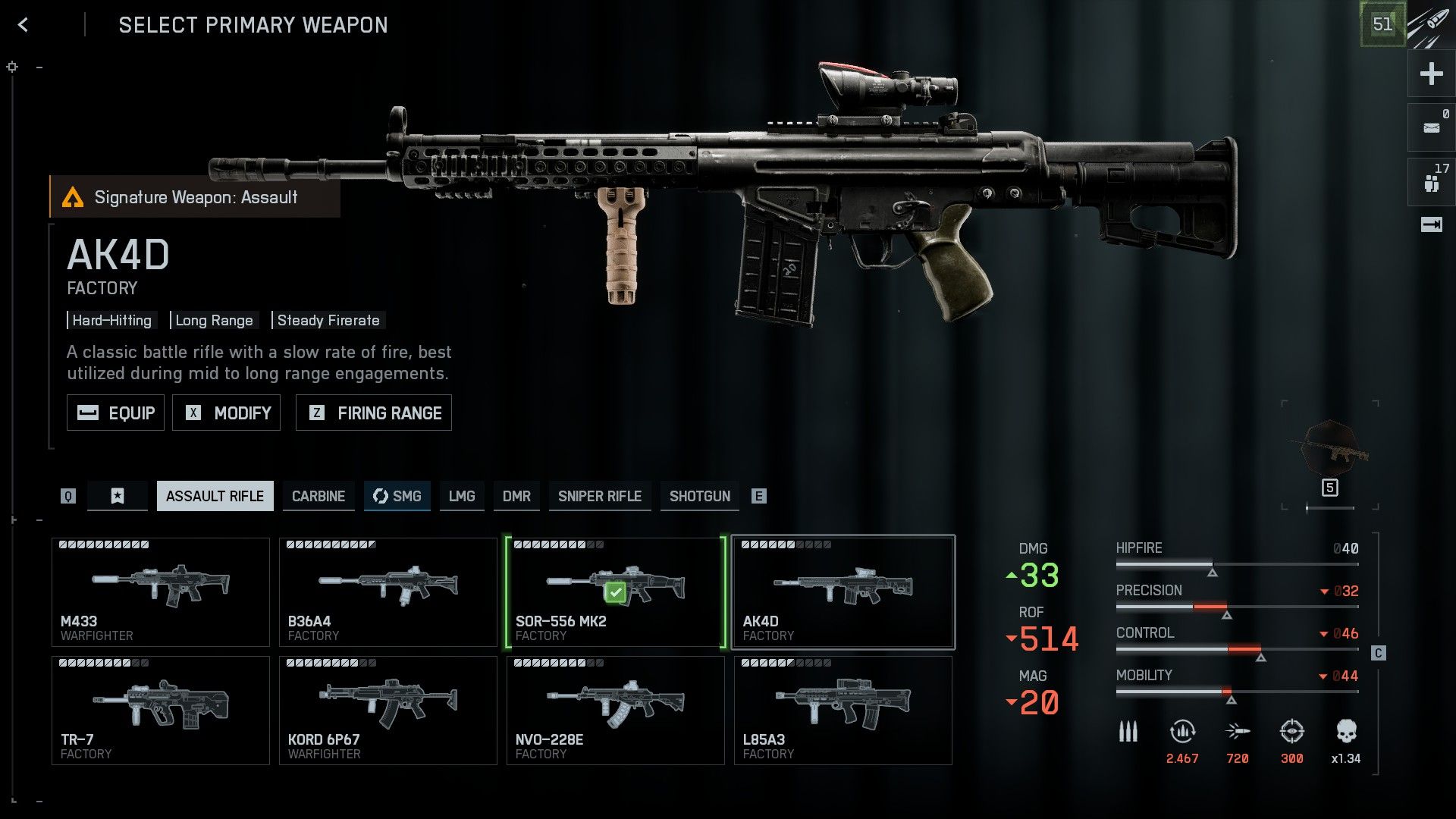 Despite being deadly up close, the AK4D can struggle in close-quarters combat because its slow firing rate means missed shots are costly. It’s not a bad gun overall, but it’s most effective at shorter to medium ranges compared to other options.