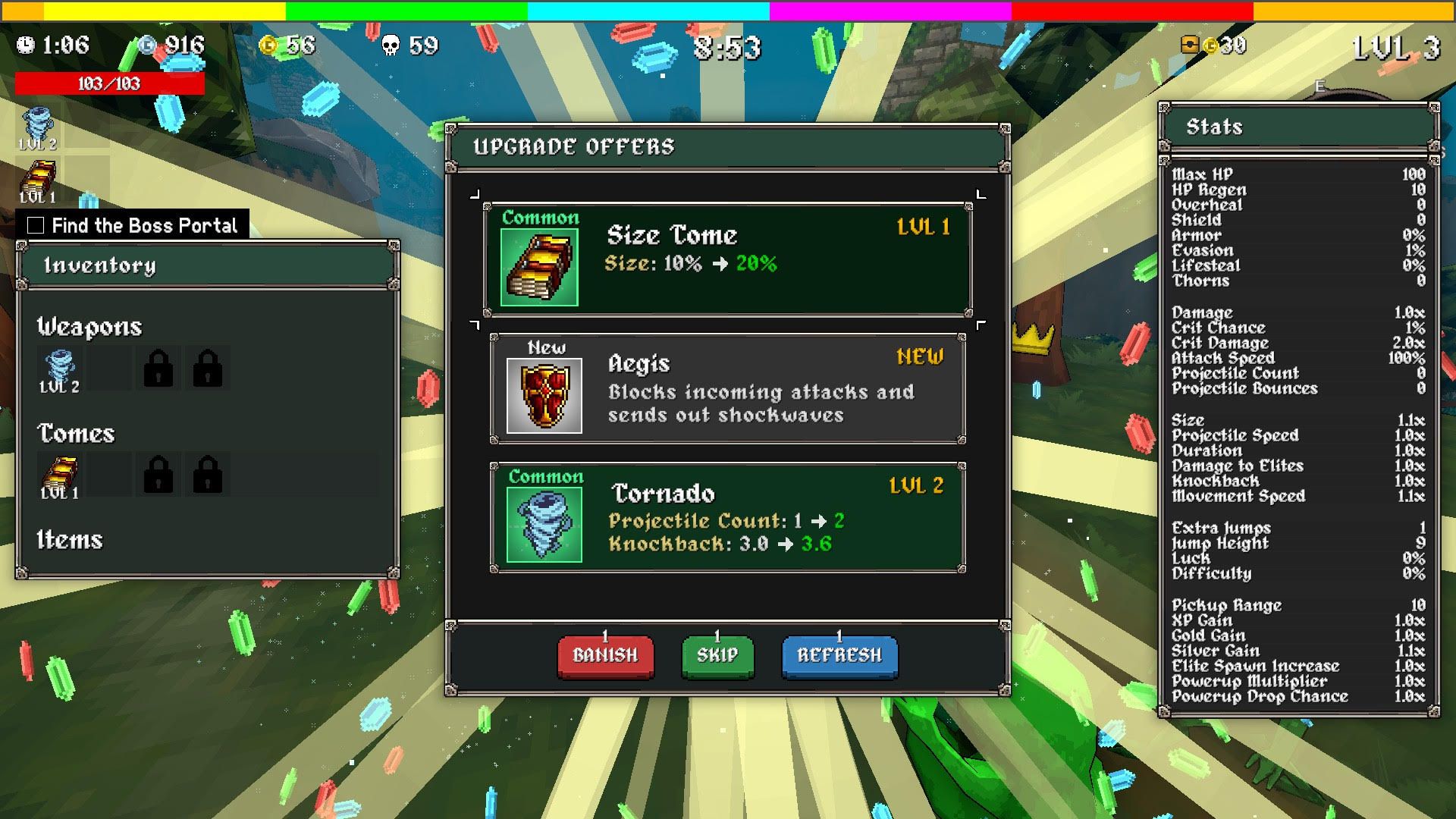- Size Tome: This Tome increases the radius of your Tornado and Aura attacks. With this, you can hit more enemies from a distance and control the crowd better.