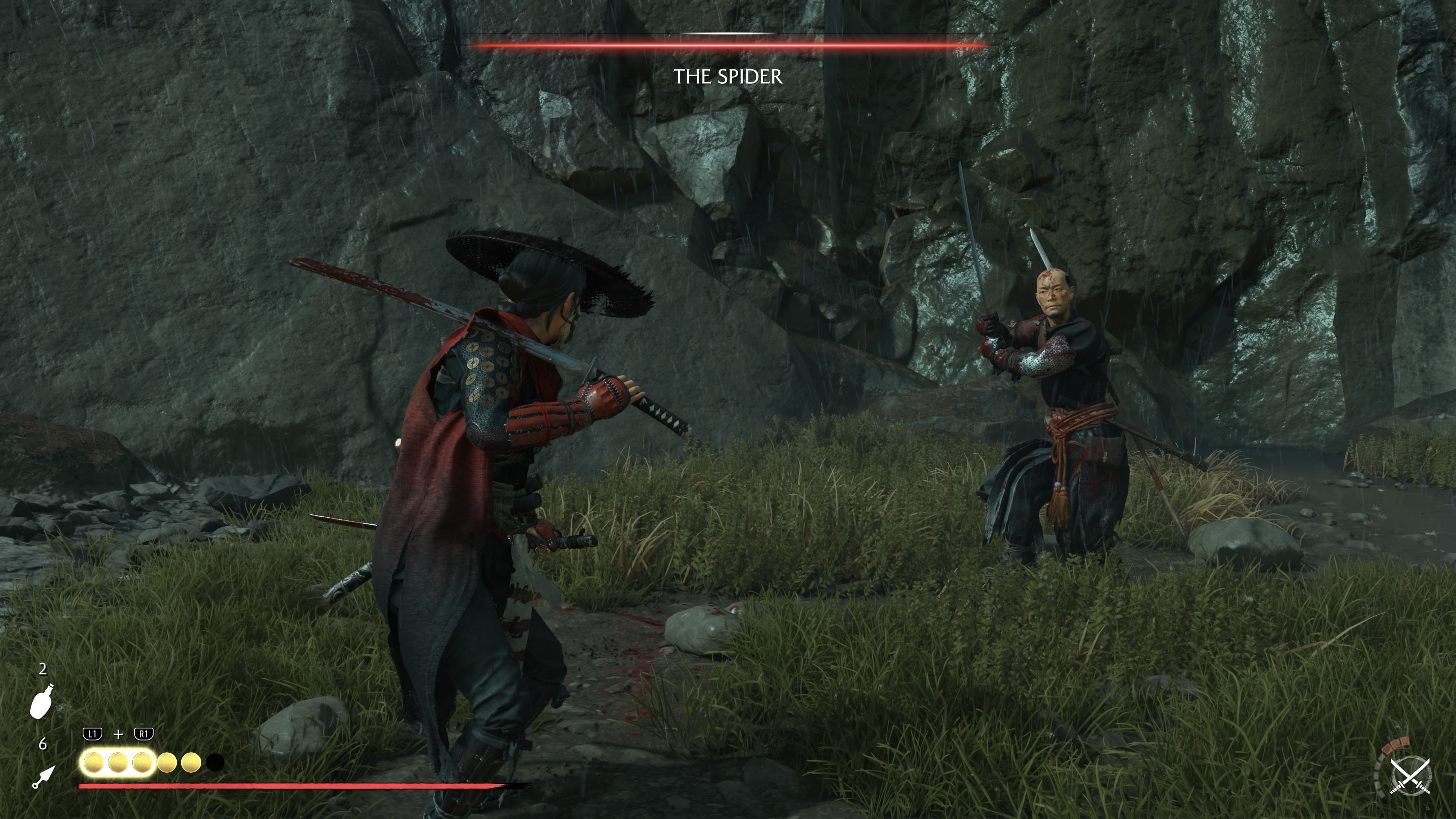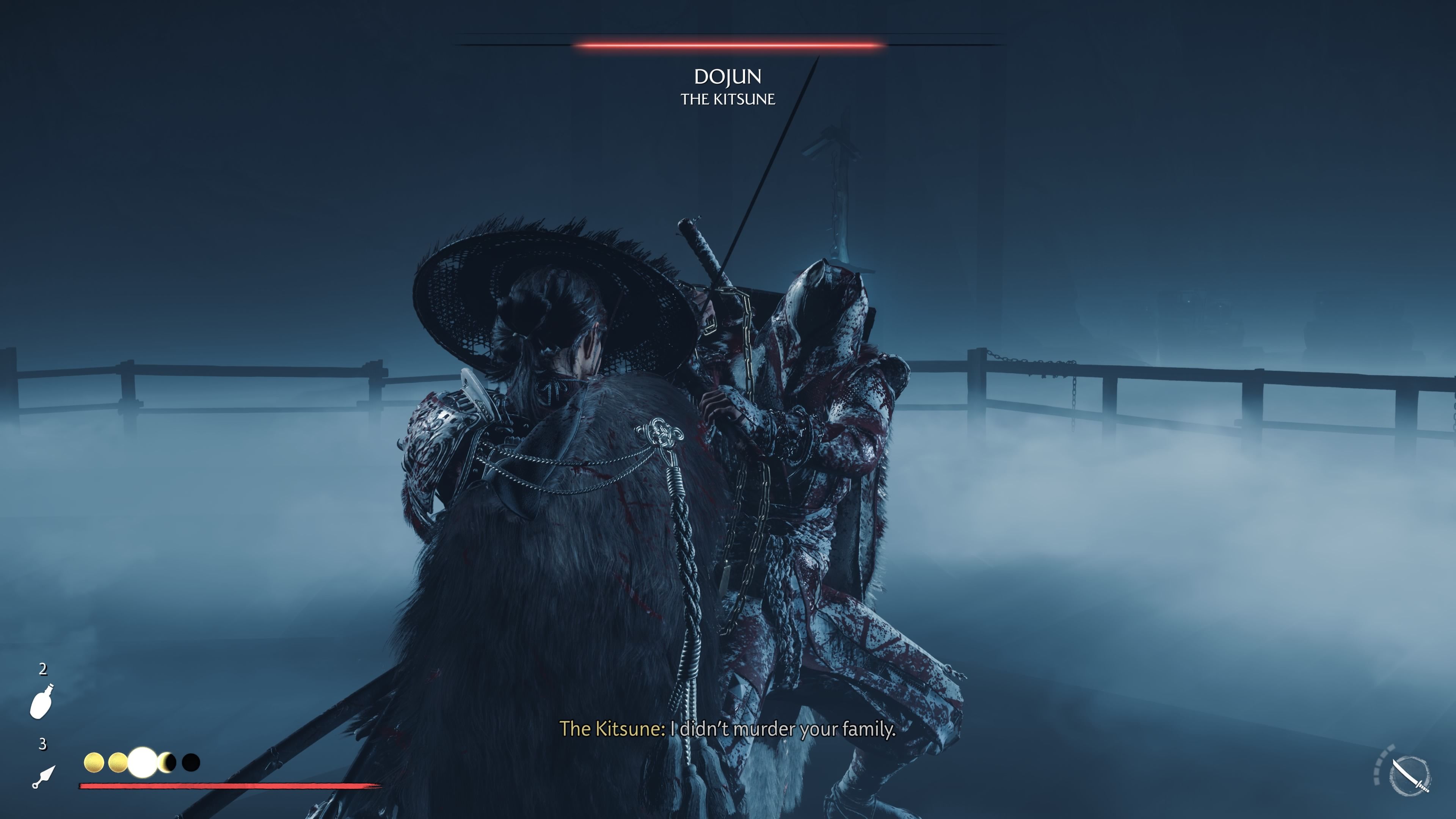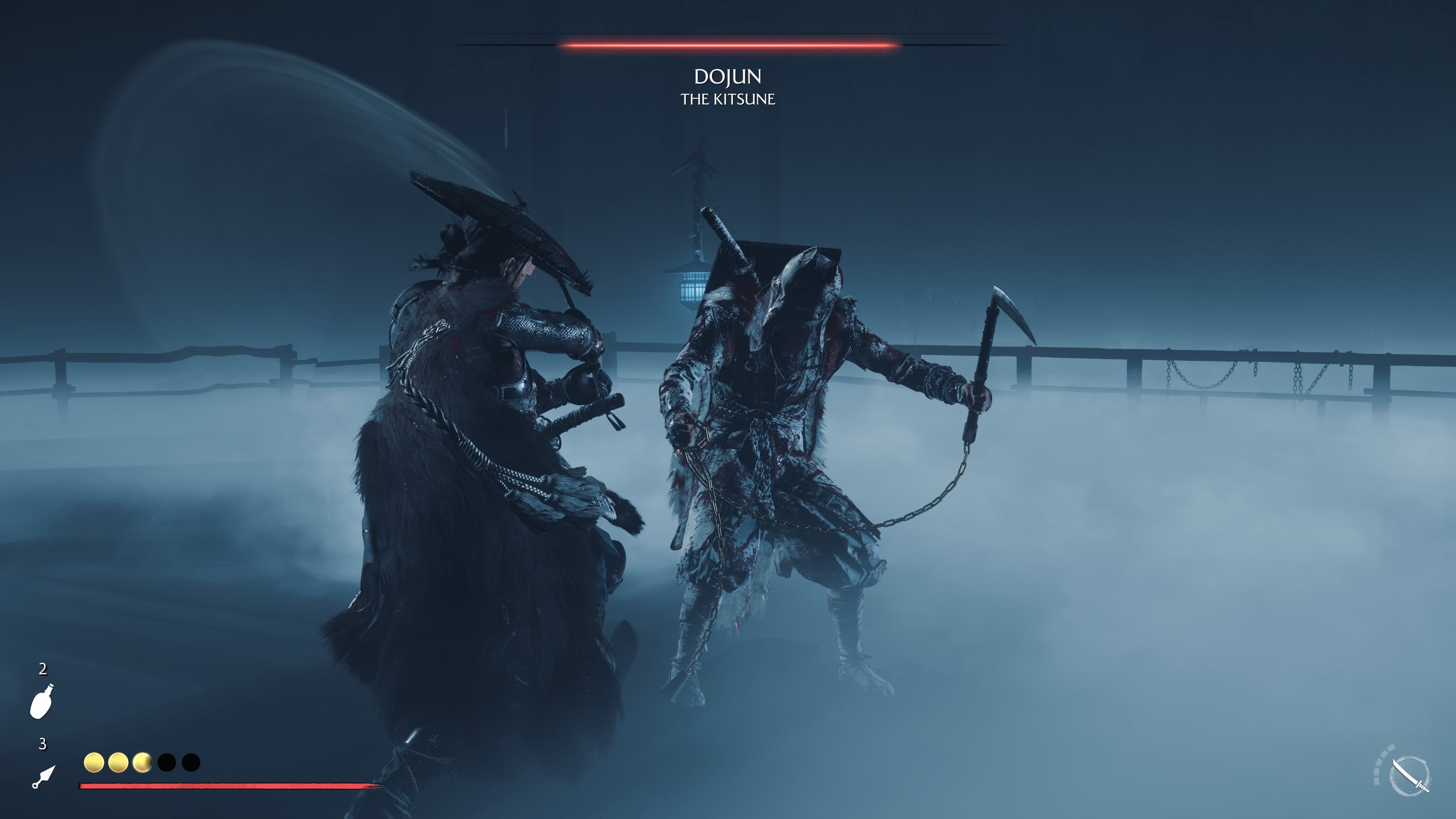 Dojun has taken over from the Kitsune and fights using unpredictable, deceptive tactics. He mainly uses a Kusarigama, giving him an edge when fighting from a distance. When he’s not attacking with ranged moves or unblockable strikes, Dojun relies on tricks like smoke bombs to confuse you. You’ll need to use Focused Hearing to anticipate his attacks. Like the Oni fight, this battle happens in two stages and can be tough for players who don’t realize he uses a variety of weapons and gadgets.