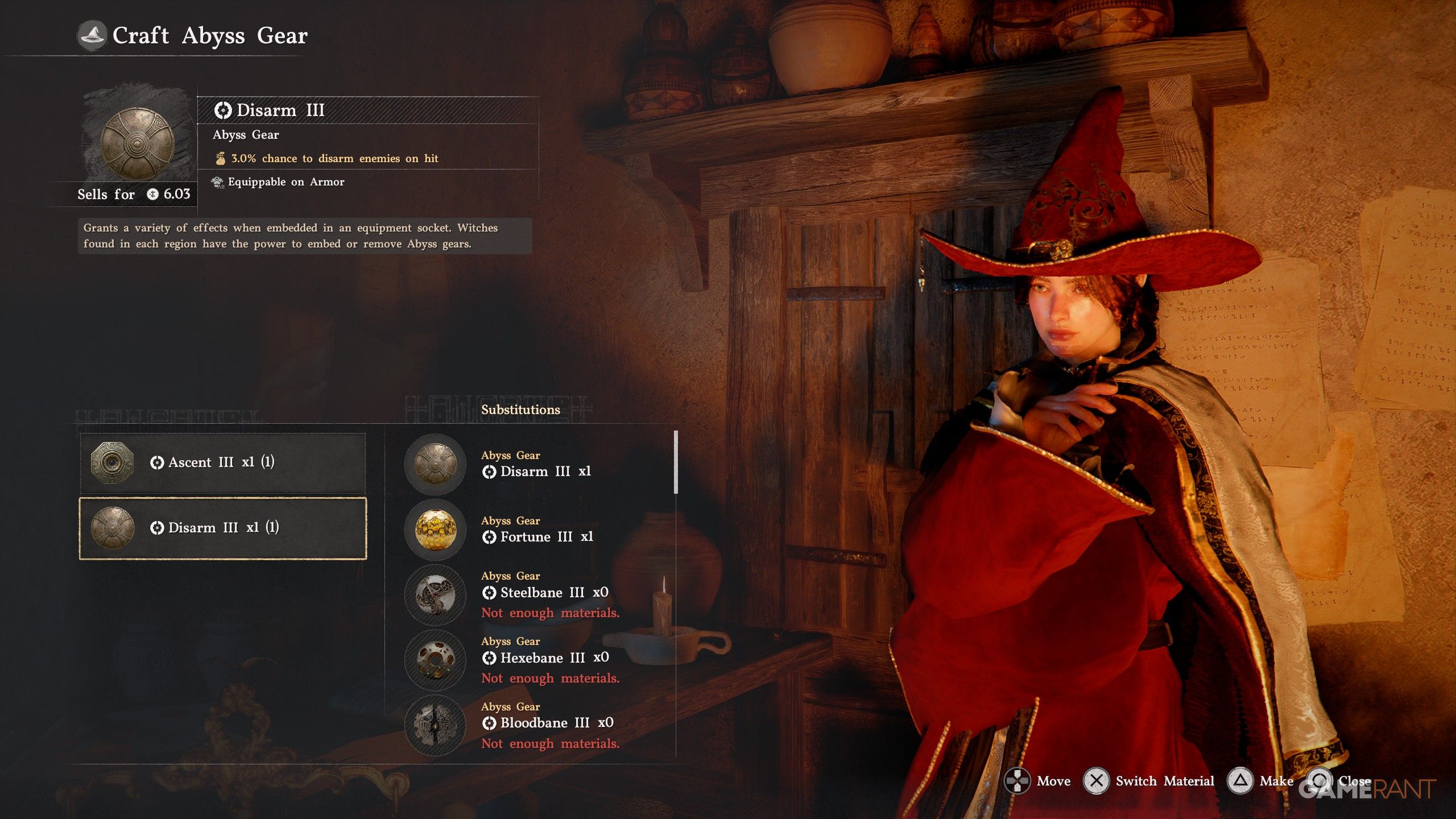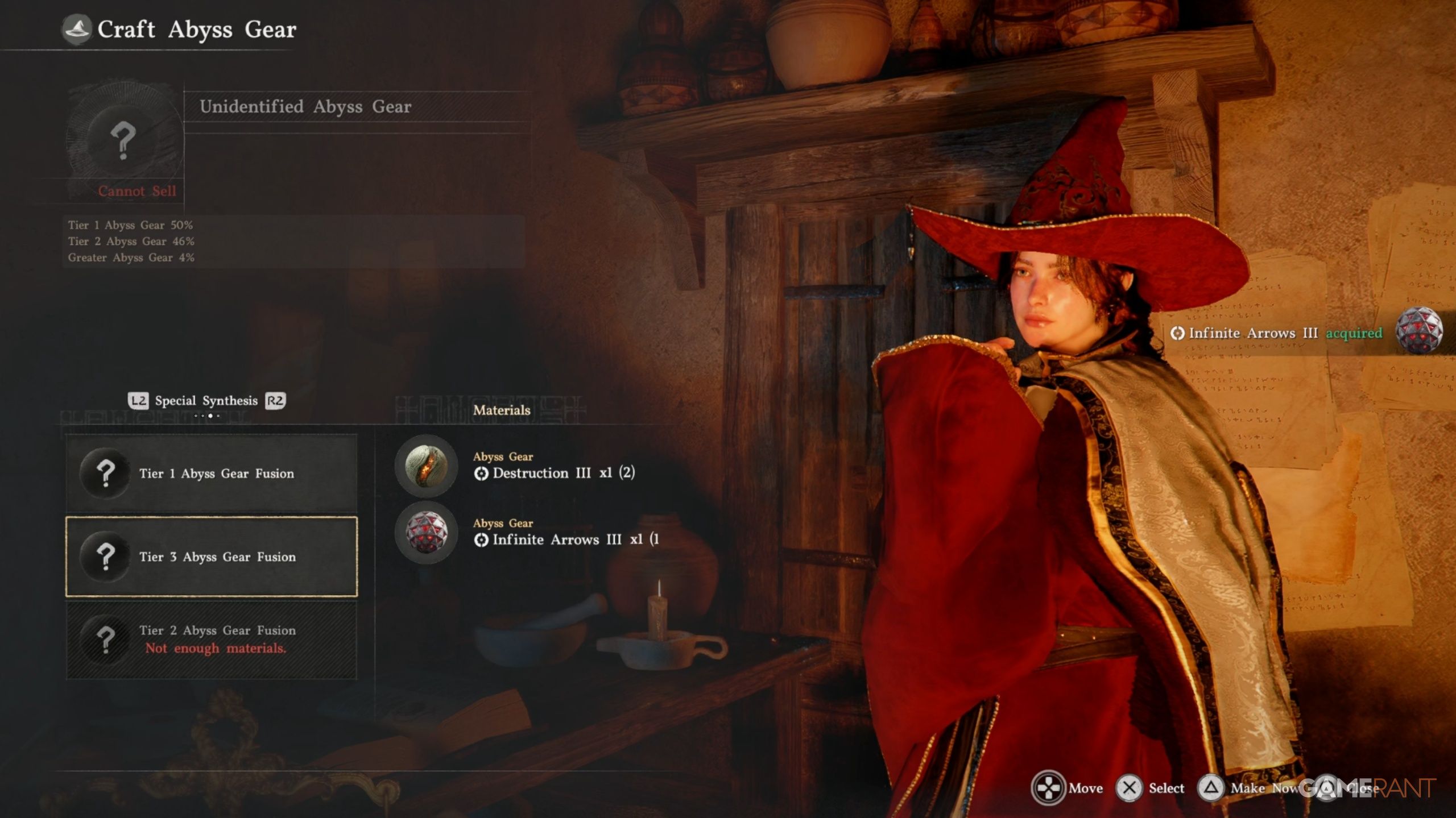 - Enter her vendor menu and select “Craft Abyss Gear, and press R2 to reach the “Special Synthesis” section.