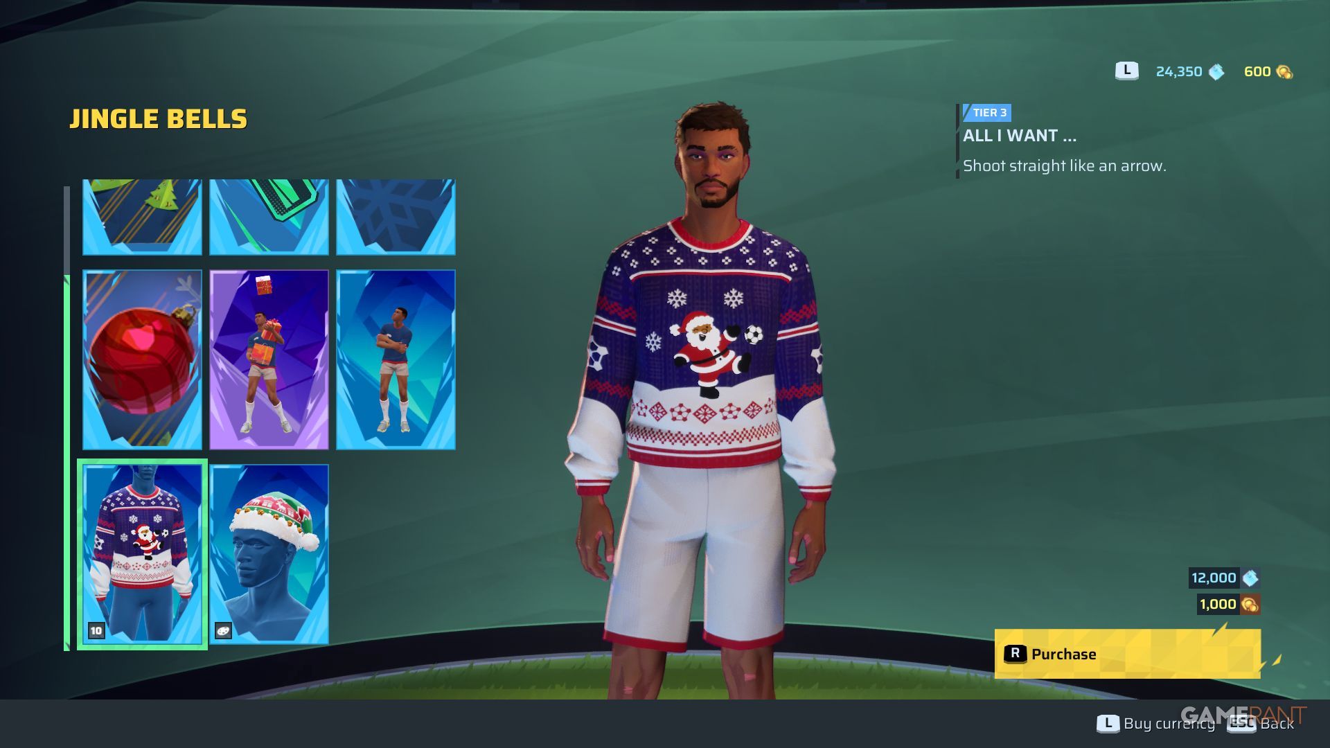 The Jingle Bells bundle is a great value because you can purchase it using in-game currency earned through playing. It includes 10 unique Christmas sweaters, a Santa hat you can personalize, a fun victory animation with falling presents, and lots of other holiday-themed items to customize your profile.