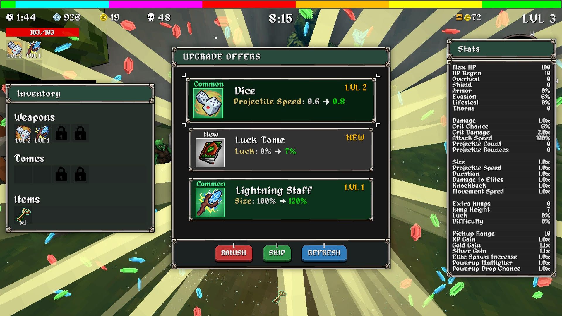 - XP Tome: This Tome helps you level up quicker, and since every level means another permanent buff, you’ll reach Dicehead’s broken late-game form much sooner.
