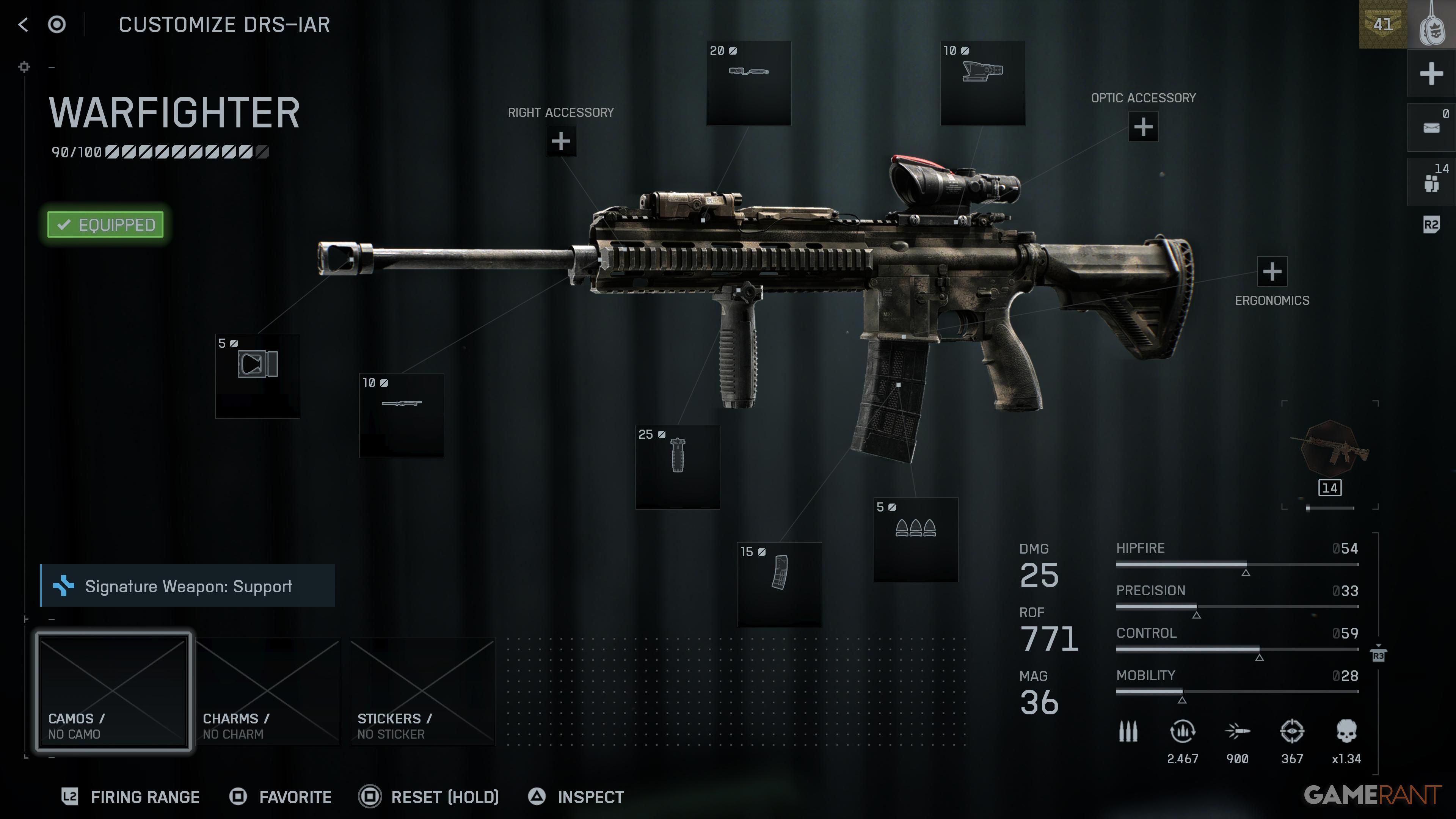 The included 20-inch SDM-R barrel dramatically boosts the weapon’s muzzle velocity by 180, making it stand out from other light machine guns. This increased power, combined with a bullet velocity of 900, lets you quickly defeat enemies.