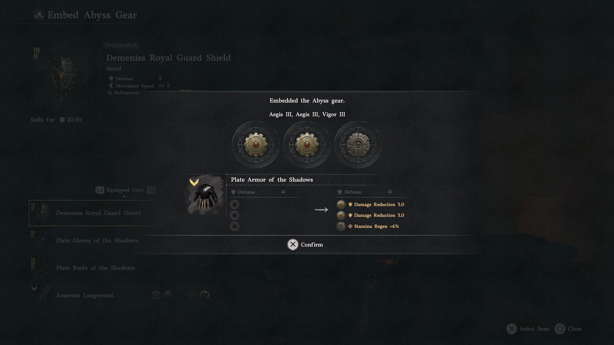 Aegis III Damage Reduction 3.0 Crafted from the Gear Blueprint: Aegis, which is purchased from Lyselia, the Witch of Humility in Serpent Marsh, Demeniss.