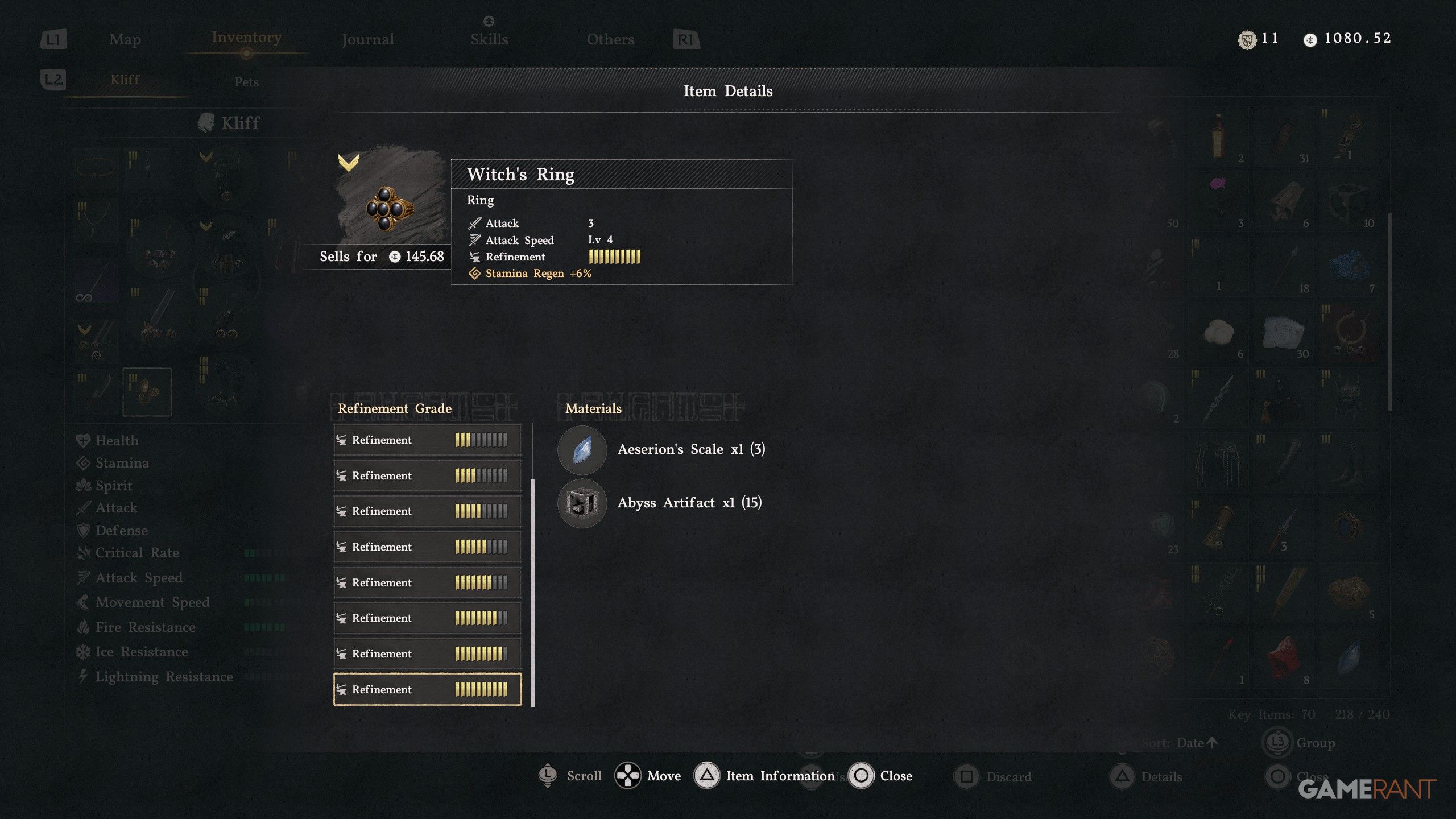 • The Witch’s Ring, fully upgraded, will increase Attack by 3, Attack Speed to Lv 4, and Stamina Regen +6%.